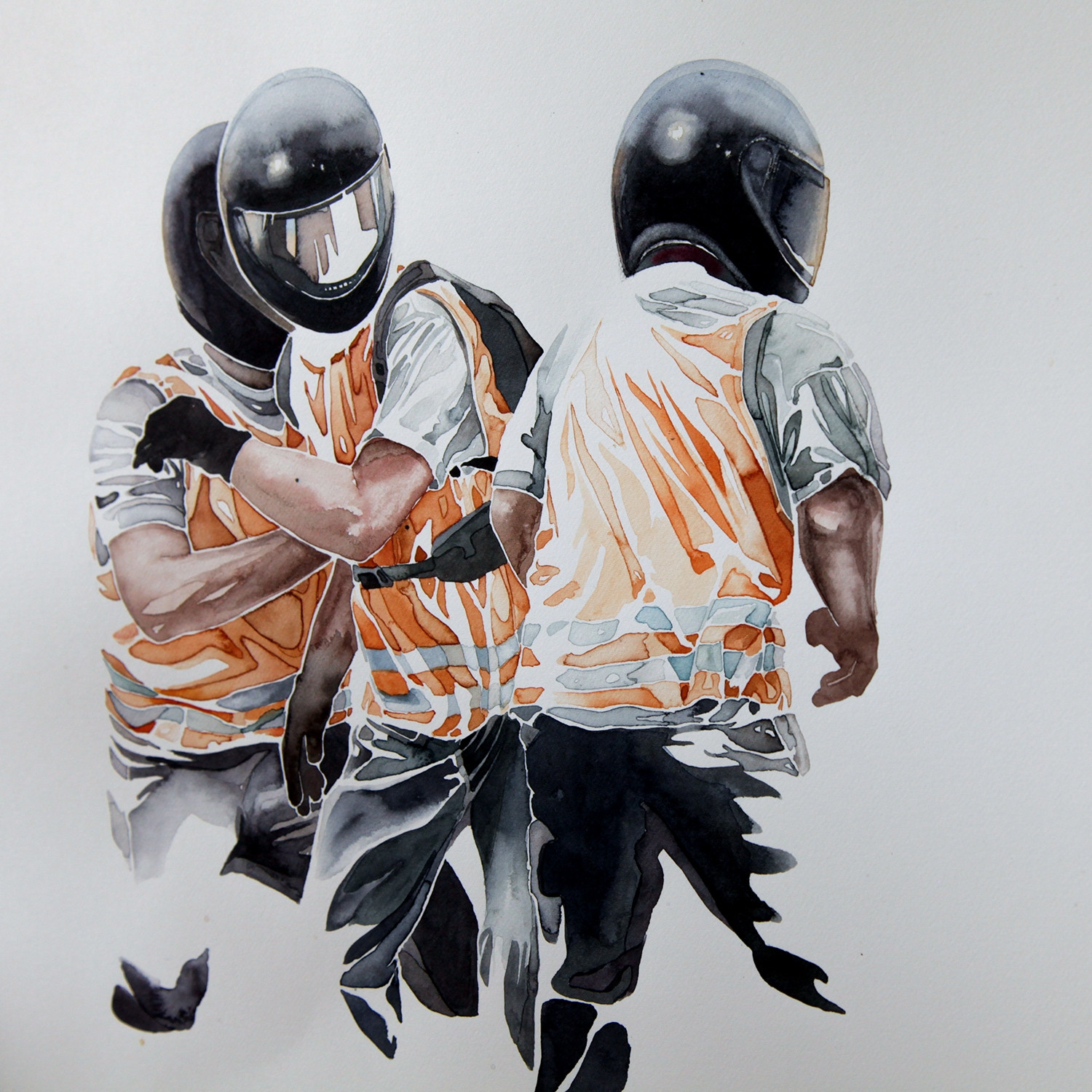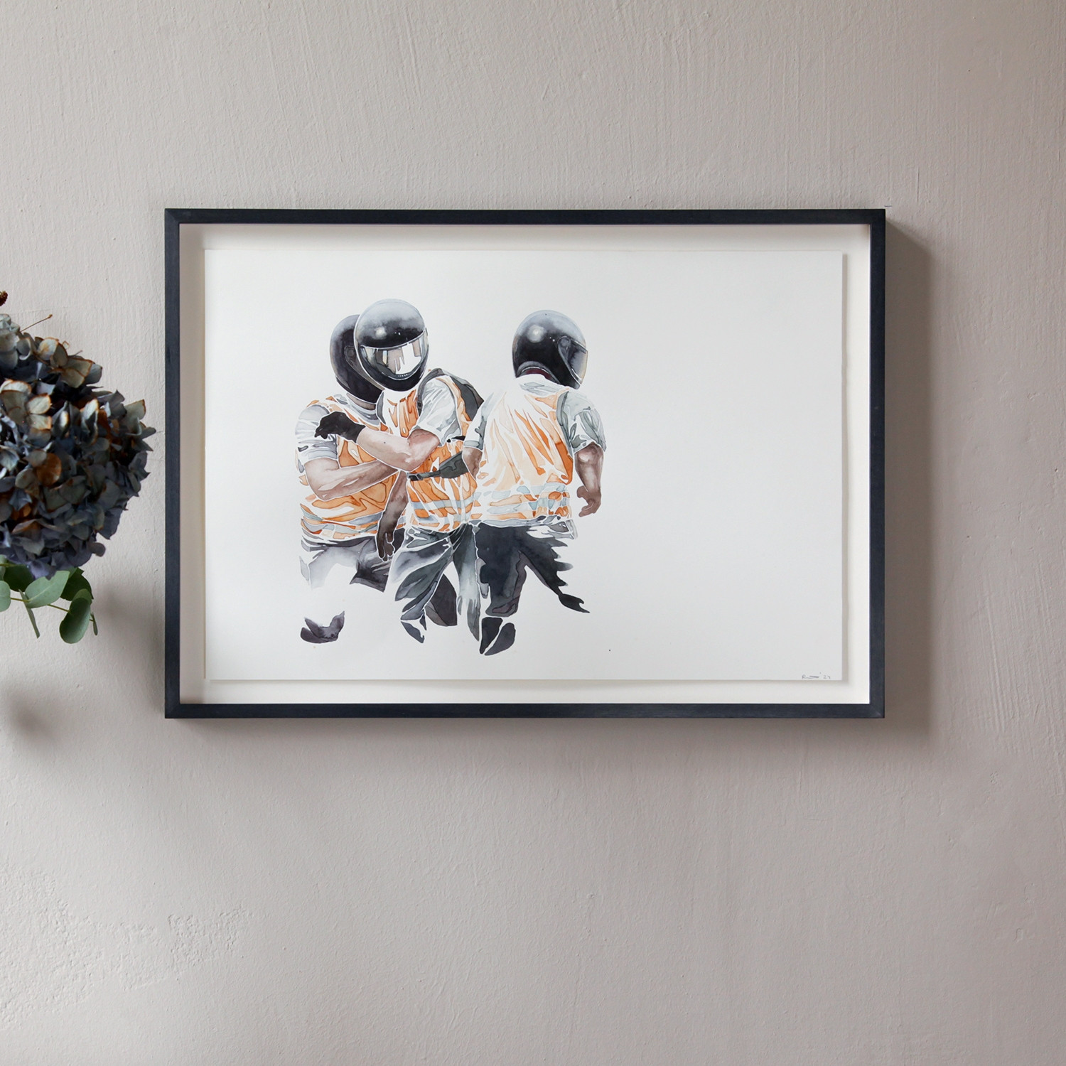 Achim Riethmann o.T. (2), 2022 Material Aquarell auf Papier Auflage 1 Maße 45 x 30 cm UNIKAT signiert und datiert Details zum Rahmen Handgefertigter Ahorn-Rahmen, grau gewachst, Außenmaße 35,2 x 50,2 cm mit 10 mm Distanzleiste. Inkl. Museumsglas, rückseitiger Aufhängung. Die neue Art, Kunst zu kaufen Handverlesene, exklusive Editionen Limitierte, signierte Auflagen Top-KünstlerInnen und Rising Stars Schnell registrieren, um Preis und Verfügbarkeit zu sehen. Jetzt kostenlos Mitglied werden Bereits Mitglied? Über das Werk Riethmanns Themen und die Inspiration für seine Bildideen findet er in den Medien, in Zeitungen oder Magazinen, oder dem Internet, allgemein zugänglichen Quellen also. Besonderes Kennzeichen dieses talentierten und erfolgreichen Künstlers: Seine Motive sind stets nur unvollständig abgebildet, die so entstehenden Leerstellen – absichtlichen Weißräumen gleich – schaffen Raum und eröffnen die Möglichkeit für eigene Assoziationen. Dies trifft auch für jene zwei neuen Werke zu, die wir jüngst im Atelier entdeckt haben: Wir sehen drei schwarz behelmte Figuren in Funktions-Warnwesten. Was passiert hier? Werden wir womöglich Zeuge einer Schlägerei oder eines Banküberfalls? Riethmann verweigert uns eine konkrete Antwort hierzu, seine nur bis zur Körpermitte angedeuteten Figuren fordern uns hingegen zum genauen Hinsehen auf: Die Pose zählt, die Form – alles weitere, Assoziationen aus dem gesehenen liegen beim Betrachter! Oder wie sagte Oscar Wilde? In Wahrheit spiegelt die Kunst den Betrachter und nicht das Leben.“ Über den Künstler Achim Riethmann – ehemaliger Meisterschüler von Leiko Ikemura – beherrscht wie kaum ein anderer die Kunst der Aquarelltechnik. Mithilfe feinster Pinselstriche und kleiner Farbflächen arbeitet er seine Motive heraus, die in ihrer Detailliertheit und ihrer Farbigkeit, changierend zwischen zartesten Blau-, Rosa-, Grün- oder Schwarznuancen, bestechend schön sind. In ihnen deuten sich jedoch Geschichten an, bei denen es nicht nur um diese vordergründige Schönheit geht: Wenn Riethmann Menschen mit Helmen und heruntergelassenem Visier malt, wenn Kameradrohnen oder emporgereckte Fäuste zu Bildträgern werden, wird deutlich, dass es dem gebürtigen Londoner um Ausnahmesituationen geht, um jene Momente, in denen sich Zustände innerhalb weniger Sekunden radikal ändern können. Ausstellungen (Auswahl) 2019, You are here, Arbeiten aus der Sammlung Peters-Messer, Werkschauhalle Baumwollspinnerei Leipzig 2018, ATLAS, Galerie Russi Klenner, Berlin 2014, Galerie Evelyn Drewes, Hamburg 2013, Walter-Koschatzky-Kunstpreis, Nominiertenausstellung im Museum Moderner Kunst Wien 2012, NoTown, beyond the wall, Gruppenausstellung mit Alycia Kwade, Eberhard Havekost, Gregor Hildebrandt, Philip Grözinger u.a., Detroit, USA 2011, Ich bin ein Berliner, DezerSchauhalle, Miami 2011, Krieg im Frieden, Gruppenausstellung, Kunstpavillon, München Lesenswerte Artikel / Links Der Tagesspiegel über Riethmanns Ausstellung in der Galerie Russi Klenner im Februar 2018 Achim Riethmanns Website Riethmann wird vertreten von Galerie Russi Klenner Mehr Kunst entdecken Roman Manikhin Black Ladies II, 2018 Marcel Dzama Where All Harmonies Are Tuned, 2011 Antoni Tàpies Clau del Foc XIII, 1973
