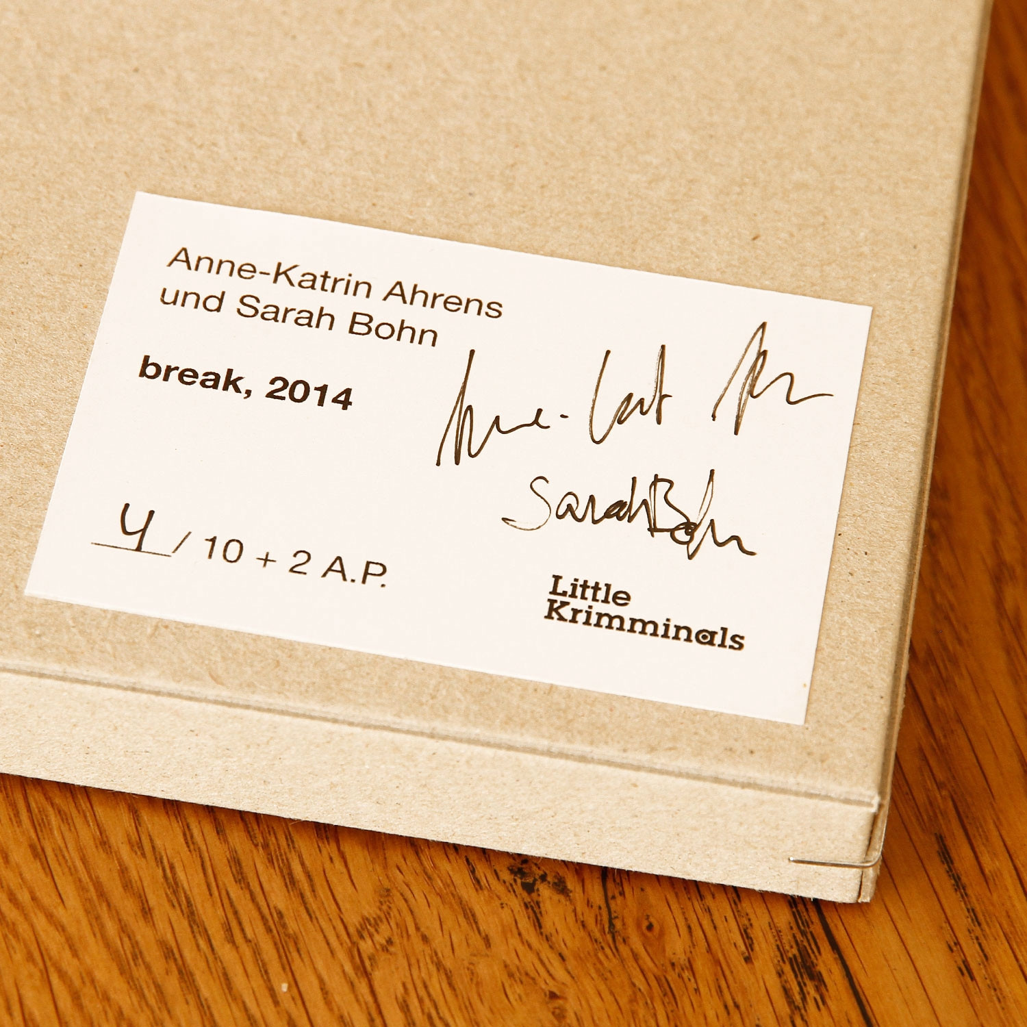 Anne-Katrin Ahrens & Sarah Bohn Venus and Serena 'break', 2014 Material Wandobjekt, Aluminium pulverbeschichtet Herstellungsmethode In einer Box, die auf der Vorderseite signiert und nummeriert ist. Jeder hat die Freiheit, die Negativräume so zu hängen wie gewünscht. Auflage 10 Maße 14 x 14 cm Die neue Art, Kunst zu kaufen Handverlesene, exklusive Editionen Limitierte, signierte Auflagen Top-KünstlerInnen und Rising Stars Schnell registrieren, um Preis und Verfügbarkeit zu sehen. Jetzt kostenlos Mitglied werden Bereits Mitglied? Über die Edition „Break“ und „deuce“ heißen diese beiden separat erhältlichen Wandobjekte, die die Künstlerinnen Anne-Katrin Ahrens und Sara Bohn 2014 für ihre Präsentation „Venus and Serena“ in der Berliner Ausstellungsreihe „LittleKrimminals“ geschaffen haben. Die Annahme liegt nahe, dass hier eine Begeisterung für Tennis bestimmend war, schließlich geben „break“ und „deuce“ den Punktestand in dieser Sportart wieder und die Namen Venus und Serena verweisen auf die weltberühmten Tennis-Schwestern Williams. Den beiden in Berlin lebenden Künstlerinnen dient der Ballsport jedoch eher als Metapher für ihr gemeinsames Arbeiten, für den Zweiklang ihrer künstlerischen Stimmen. Auseinander- bzw. nebeneinandergelegt ergeben die zarten, weiß lackierten Metallobjekte kein Wort, wie man es eigentlich vermuten würde. Stattdessen werden wir aufgefordert, unseren Blick auf das zu richten, was nicht geschrieben ist: auf den Weißraum zwischen den ‒ zu denkenden ‒ Buchstaben, auf die Leerstellen innerhalb von „break“ und „deuce“. Und so eröffnen uns die Künstlerinnen Raum zum Spielen und Ausprobieren – es gibt kein Richtig oder Falsch in dieser (künstlerischen) Welt! Über die Künstlerinnen Anne-Katrin Ahrens studierte Grafik und Typografie an der HFBK in Hamburg, Sarah Bohn Fotografie am LCF, University of the Arts, in London. Gemeinsam mit Lisa Herfeldt gründeten sie den Studio- und Ausstellungsraum Institut in Berlin und arbeiten seit 2008 künstlerisch in Solo- wie auch Gruppenprojekten zusammen. Lesenswerte Artikel / Links Website von Anne-Katrin Ahrens Website von Sarah Bohn Mehr Kunst entdecken Dorothy Iannone Doesn’t Everyone Make Mistakes in September?, 2014 Anne-Katrin Ahrens & Sarah Bohn Venus and Serena 'deuce', 2014