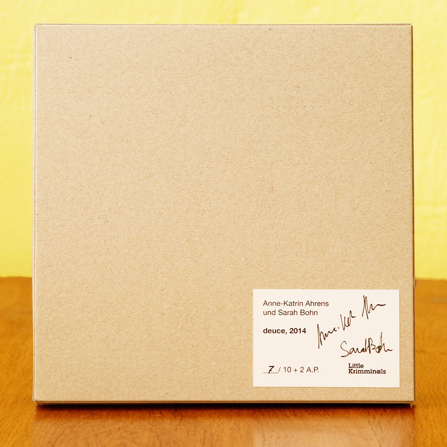 Anne-Katrin Ahrens & Sarah Bohn Venus and Serena 'deuce', 2014 Material Wandobjekt, Aluminium pulverbeschichtet Herstellungsmethode In einer Box, die auf der Vorderseite signiert und nummeriert ist. Jeder hat die Freiheit, die Negativräume so zu hängen wie gewünscht. Auflage 10 Maße 14 x 14 cm Die neue Art, Kunst zu kaufen Handverlesene, exklusive Editionen Limitierte, signierte Auflagen Top-KünstlerInnen und Rising Stars Schnell registrieren, um Preis und Verfügbarkeit zu sehen. Jetzt kostenlos Mitglied werden Bereits Mitglied? Über die Edition „Break“ und „deuce“ heißen diese beiden separat erhältlichen Wandobjekte, die die Künstlerinnen Anne-Katrin Ahrens und Sara Bohn 2014 für ihre Präsentation „Venus and Serena“ in der Berliner Ausstellungsreihe „LittleKrimminals“ geschaffen haben. Die Annahme liegt nahe, dass hier eine Begeisterung für Tennis bestimmend war, schließlich geben „break“ und „deuce“ den Punktestand in dieser Sportart wieder und die Namen Venus und Serena verweisen auf die weltberühmten Tennis-Schwestern Williams. Den beiden in Berlin lebenden Künstlerinnen dient der Ballsport jedoch eher als Metapher für ihr gemeinsames Arbeiten, für den Zweiklang ihrer künstlerischen Stimmen. Auseinander- bzw. nebeneinandergelegt ergeben die zarten, weiß lackierten Metallobjekte kein Wort, wie man es eigentlich vermuten würde. Stattdessen werden wir aufgefordert, unseren Blick auf das zu richten, was nicht geschrieben ist: auf den Weißraum zwischen den ‒ zu denkenden ‒ Buchstaben, auf die Leerstellen innerhalb von „break“ und „deuce“. Und so eröffnen uns die Künstlerinnen Raum zum Spielen und Ausprobieren – es gibt kein Richtig oder Falsch in dieser (künstlerischen) Welt! Über die Künstlerinnen Anne-Katrin Ahrens studierte Grafik und Typografie an der HFBK in Hamburg, Sarah Bohn Fotografie am LCF, University of the Arts, in London. Gemeinsam mit Lisa Herfeldt gründeten sie den Studio- und Ausstellungsraum Institut in Berlin und arbeiten seit 2008 künstlerisch in Solo- wie auch Gruppenprojekten zusammen. Lesenswerte Artikel / Links Website von Anne-Katrin Ahrens Website von Sarah Bohn Mehr Kunst entdecken Dorothy Iannone Doesn’t Everyone Make Mistakes in September?, 2014 Anne-Katrin Ahrens & Sarah Bohn Venus and Serena 'break', 2014
