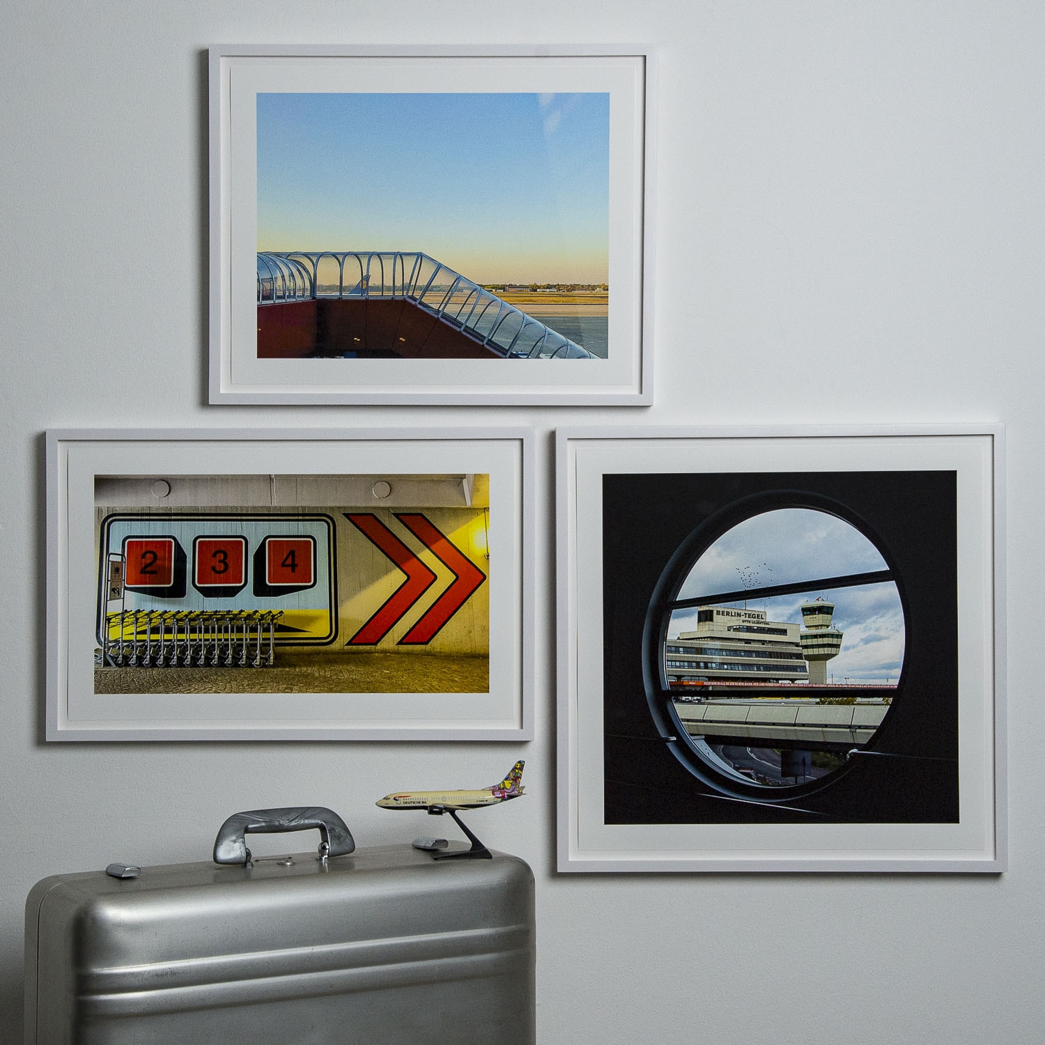 Kühn und knuffig, kantig und klar – so präsentiert sich Tegel auch in den Bildern von Bernd Rathjen. Die geometrischen Besonderheiten, die Wiederkehr der Drei- und Sechsecken, die Betonpfeiler, Vorbauten, Windfänge, gespickt mit Schildern in Siebziger-Jahre-Anmutung ergeben einen auf das Wesentliche reduzierten Reigen wie aus dem Setzbaukasten. Neben »typischen« Details wie Anzeigetafeln, Gate-Markierungen und Gepäckwagen sind es auch die unvergesslichen Besonderheiten wie die geschwungene Tunnelzufahrt zur oberen Ebene, die roten Erker mit den Rundfenstern, die auffallende Sixt-Werbung und nicht zuletzt der immer wieder aufragende eckige zweistufige Tower, die Rathjen in den Tegel Moments verewigte. Text: Nadine Barth