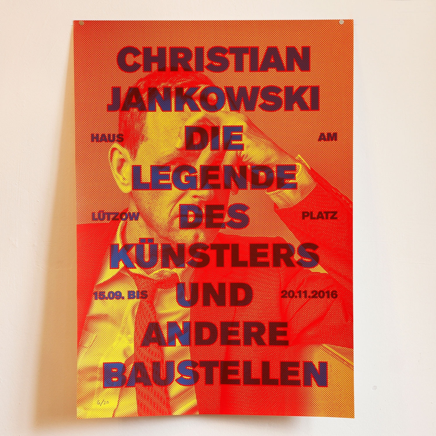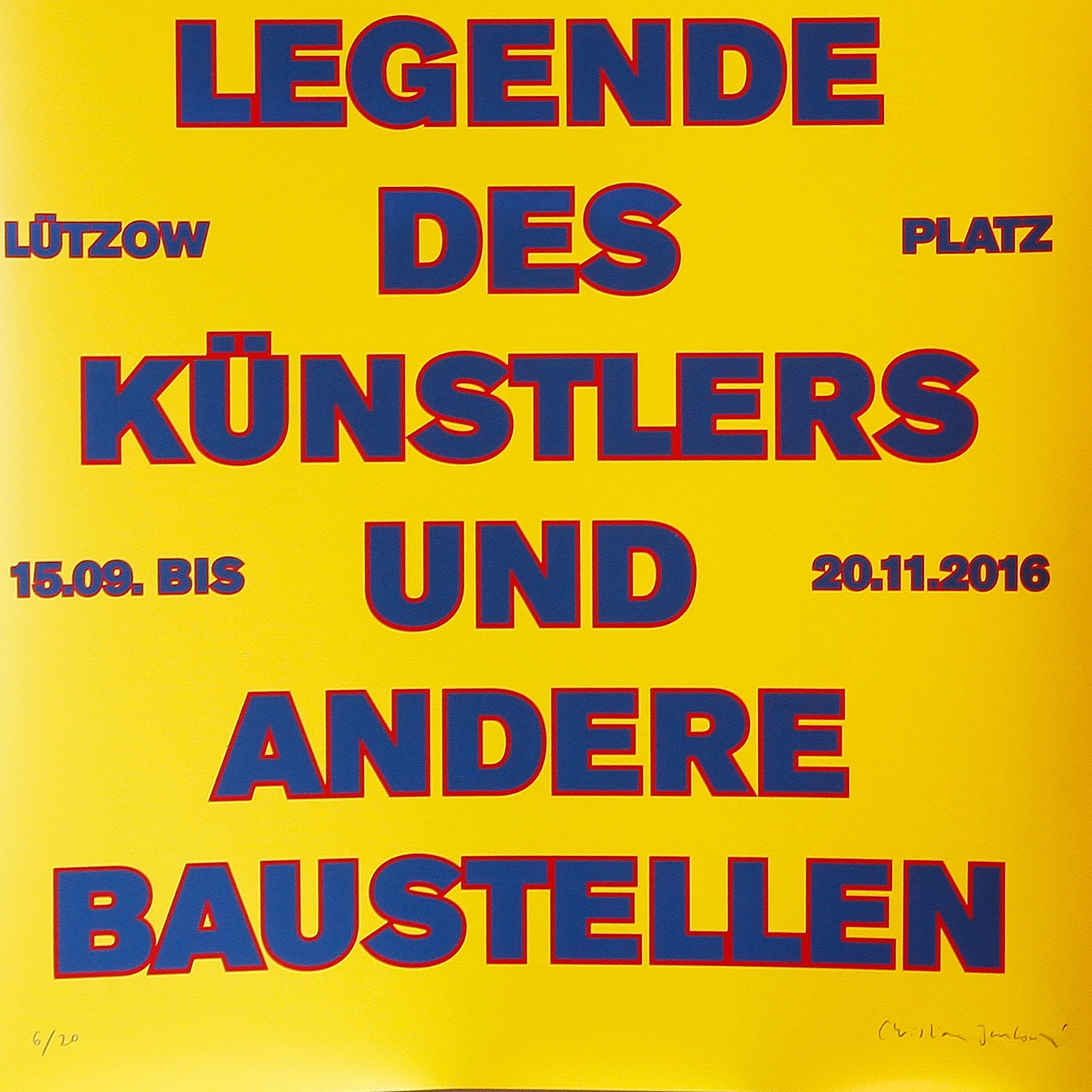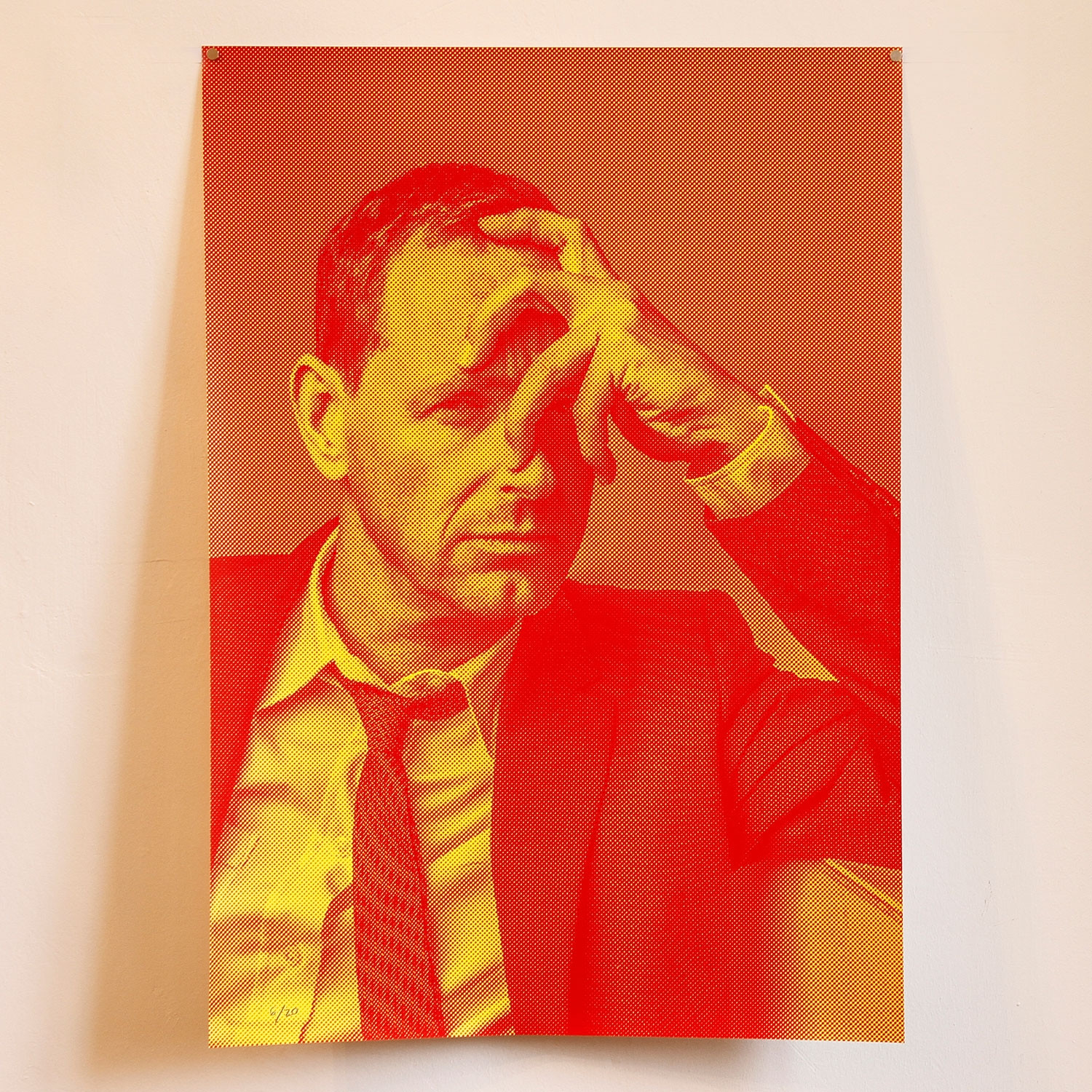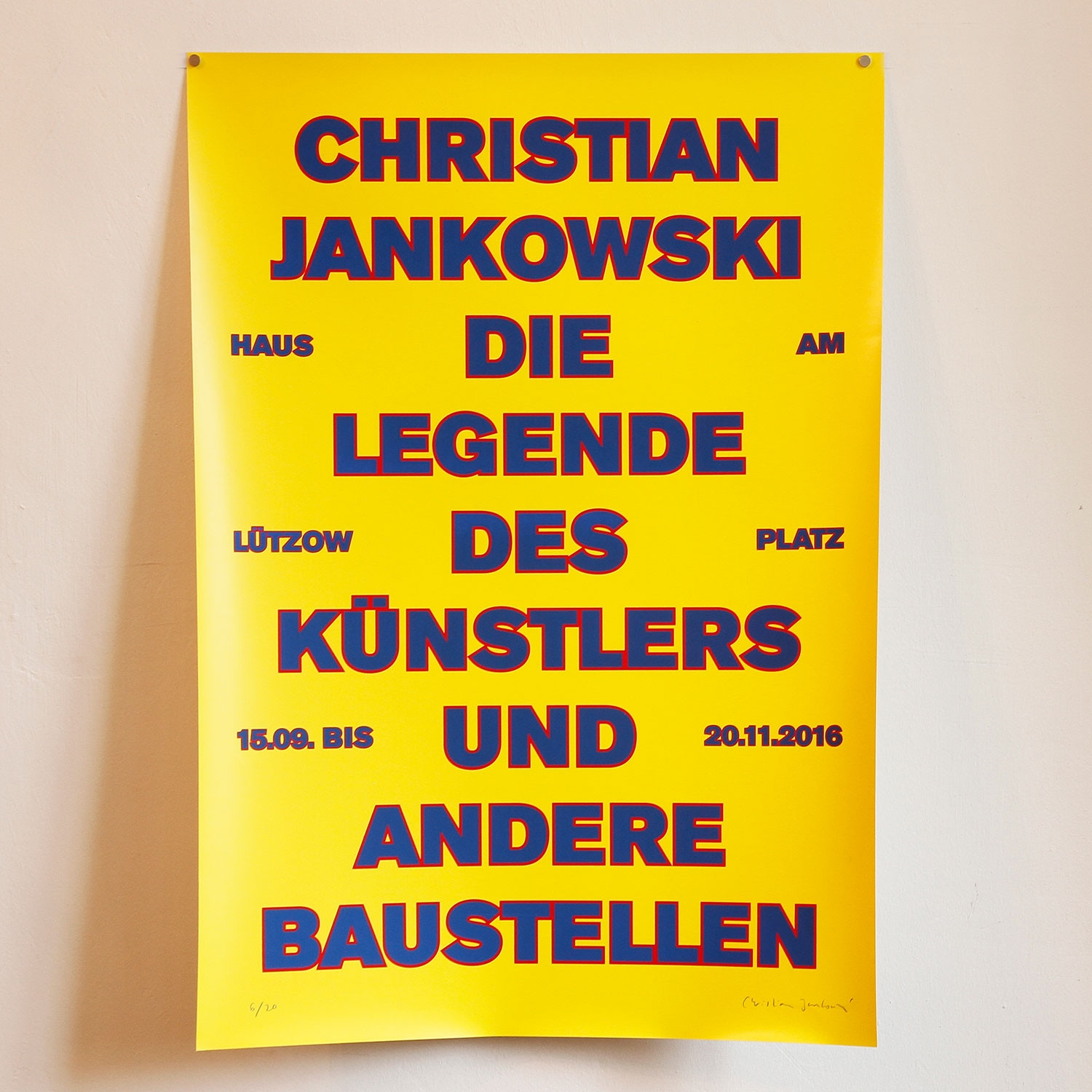 Christian Jankowski Die Legende des Künstlers und andere Baustellen, 2016 Material Siebdruck auf Papier Auflage 20 Maße je 84 x 60 cm Drei Blätter in einer Kartonmappe Auflage 20 + 5 AP + 5 EP signiert und nummeriert Die neue Art, Kunst zu kaufen Handverlesene, exklusive Editionen Limitierte, signierte Auflagen Top-KünstlerInnen und Rising Stars Schnell registrieren, um Preis und Verfügbarkeit zu sehen. Jetzt kostenlos Mitglied werden Bereits Mitglied? Anfrage senden In den Warenkorb Über die Edition„Die Legende des Künstlers und andere Baustellen“ heißt die 2016 entstandene Serie von drei Siebdrucken, die Christian Jankwoski anlässlich seiner gleichnamigen Ausstellung im Berliner Kunstverein „Haus am Lützowplatz“ schuf. Die drei im DIN A1-Format gedruckten Blätter leiten sich aus dem Motiv ab, das von dem Schweizer Grafiker Teo Schifferli als Plakat für die Ausstellung gestaltet wurde und das von dem Künstler für die Edition gleichsam in seine serigrafische Bestandteile zerlegt wurde. Die Siebdrucke selbst entstanden in der Druckwerkstatt der Staatlichen Akademie der Bildenden Künste in Stuttgart, an der Christian Jankowski seit 2005 als Professor unterrichtet. Zentrales Bildmotiv der Edition ist ein Porträt des Künstlers, das von dem Berliner Fotografen Jörg Reichhardt für die Ausstellung im Haus am Lützowplatz angefertigt wurde. Christian Jankowksi inszeniert sich dabei in einer ambivalenten „Denkerpose“, die die Erwartungen des Publikums an einen „echten“ Künstler genauso aufnimmt wie die ironischen Brüche der titelstiftenden „Künstlerlegende“. Über den Künstler „In meiner Kunst dreht sich oft etwas im Kreis oder um sich selbst.“ bekannte Christian Jankowski in einem jüngst geführten Interview in der ZEIT. Das Statement beschreibt die Möbiusschleife seiner Konzeptkunst, bei der außerkünstlerisches Material einem ganz spezifischen Veredlungsprozess unterzogen wird und die bei Jankowski von hoher Intelligenz und tiefsinnigem Humor geprägt ist. Der Künstler unterläuft in seinen Werken herkömmliche Rezeptionsgewohnheiten und verweist dabei auf die geschichtliche Konstruktion des herrschenden Kunstbegriffs. Im Entstehungsjahr der Edition fand eine groß angelegte Retrospektive des Künstlers in der Berliner Galerie Contemporary Fine Arts statt, die er von der Schauspielerin Nina Hoss kuratieren ließ. Zudem kuratierte er damals selbst die 11. Ausgabe der europäischen Wanderbiennale Manifesta in Zürich mit dem Titel "What People Do For Money". Das Projekt im Haus am Lützowplatz war die erste institutionelle Einzelausstellung in seiner Wahlheimatstadt. Ausstellungen (Auswahl) 2016, Die Legende des Künstlers und andere Baustellen, Haus am Lützowplatz 2016, Retrospektive, CFA Berlin, kuratiert von Nina Hoss 2009, Christian Jankowski, Das Gesunde Werden," Innsbruck Contemporary 2009, And Now For Something Completely Different," BAWAG Foundation, Wien 2009,Above All I'm an Art Lover," Regen Projects, Los Angeles 2009, The Puppet Show," Frye Art Museum, Seattle 2008, Welcome home, Klosterfelde Berlin 2008, Kunstmuseum Stuttgart 2007, Destroy, She said, Julia Stoschek Collection, Düsseldorf Lesenswerte Artikel / Links Interview in "Die ZEIT" FORBES-Magazin über Christian Jankowskis Ausstellung Christian Jankowski kuratierte die Manifesta 2016 in der Schweiz Die Schauspielerin Nina Hoss kuratiert Christian Jankowski, FAZ Mehr Kunst entdecken Philip Grözinger Trust, 2018 Philip Grözinger Finding New Ways of Enchantment, 2018 Philip Grözinger Calamity, 2017