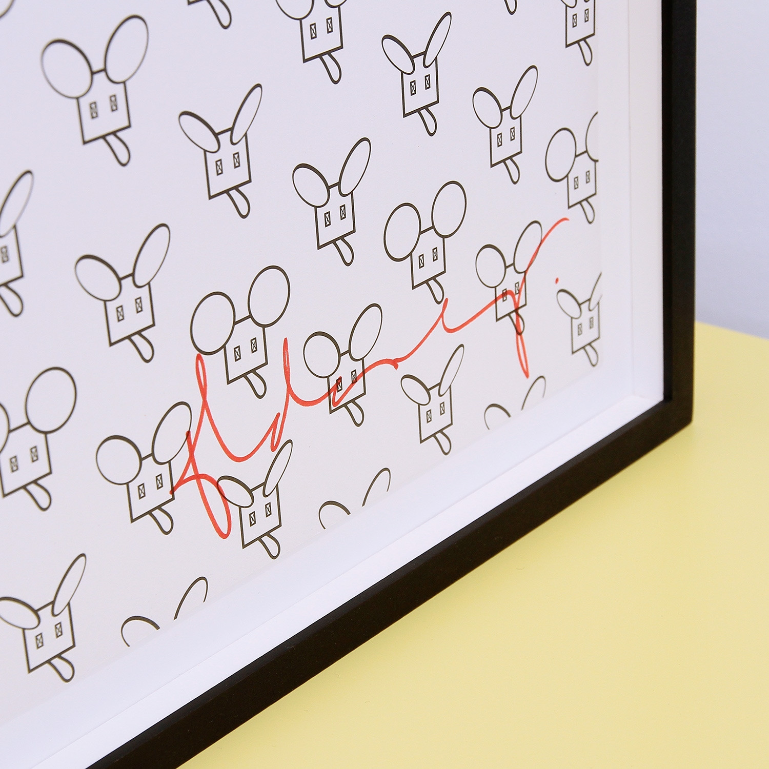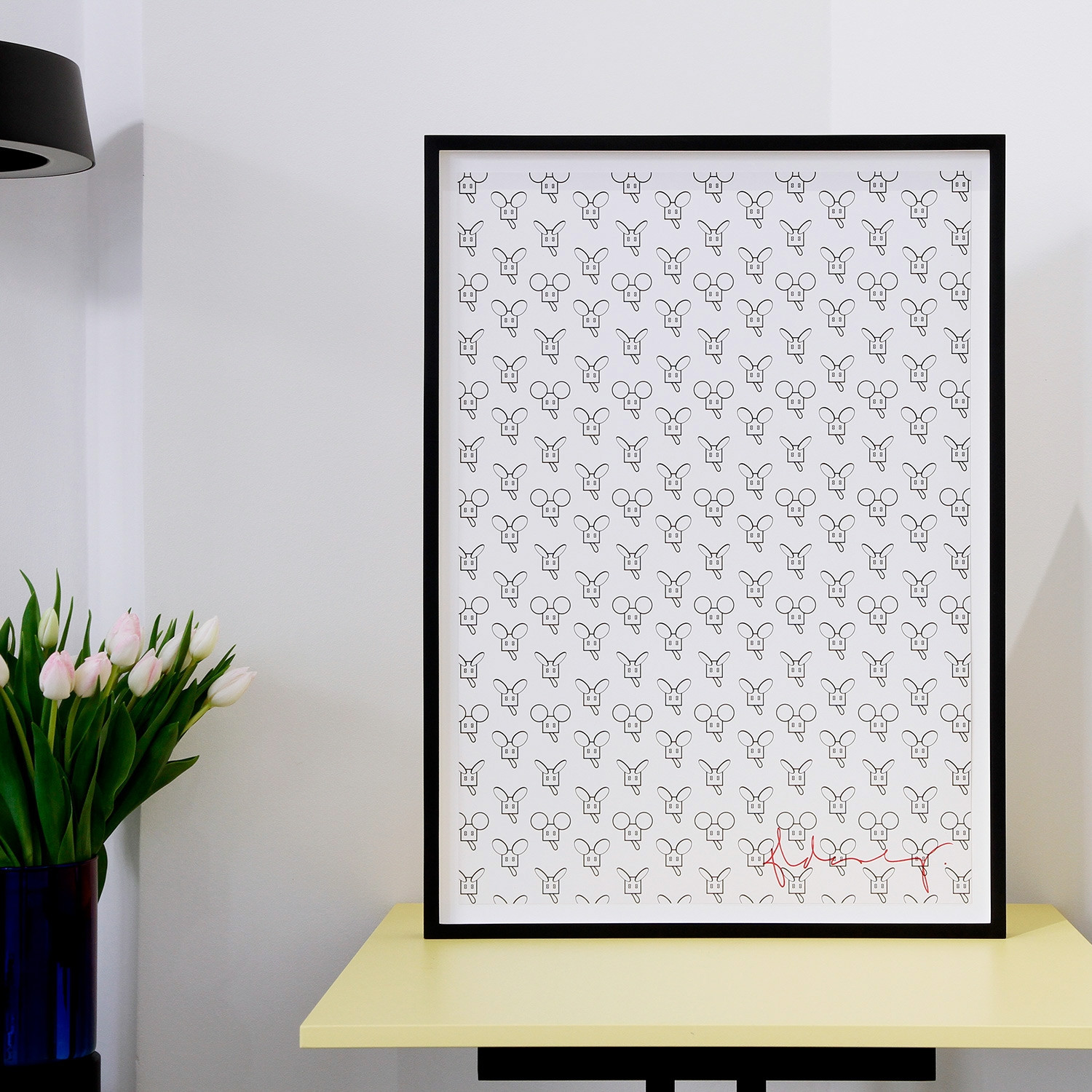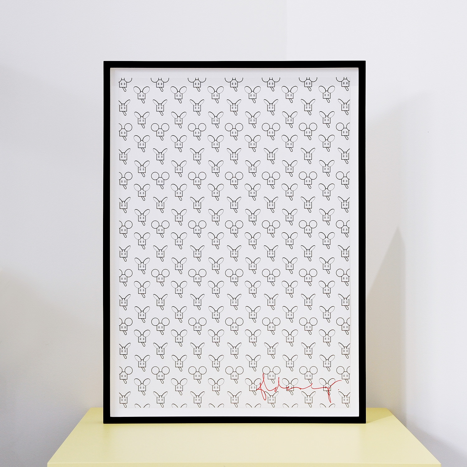 Claes Oldenburg Mouse Pattern, 2012 Material Offsetdruck auf Munken Elk 300g Auflage 85 Maße 63,5 x 44,5 cm Auflage 85 vorderseitig handsigniert und rückseitig gestempelt (Oldenburgs Namensdruck), ohne Datierung Details zum Rahmen Handgefertigter Schwarzer Holzrahmen, 10mm Distanzleiste, Außenmaße ca. 51,3 x 70,5 cm, inkl. rückseitiger Aufhängung, staubdicht verschlossen. Die neue Art, Kunst zu kaufen Handverlesene, exklusive Editionen Limitierte, signierte Auflagen Top-KünstlerInnen und Rising Stars Schnell registrieren, um Preis und Verfügbarkeit zu sehen. Jetzt kostenlos Mitglied werden Bereits Mitglied? Über den Künstler und die Edition Die stilisierte Maus ist ein zentrales Motiv im Werk Claes Oldenburgs. Der Kopf mit den auffallenden Ohren ist dem wohl ikonischsten aller US-amerikanischen Comic-Charaktere nachempfunden: Mickey Mouse – in Kombination mit dem Modell einer alten Filmkamera. Hier lässt sich ein Grundsatz ablesen, den der 1929 in Schweden geborene Künstler für seine Arbeit formulierte. Den Einfluss von Marcel Duchamp ließ Oldenburg gelten, auch Parallelen zur Pop-Art: „But I’m always careful to say that I changed everything I found. So that was the big difference. Mine was not pop art. I maybe started with a subject, but I changed the subject“, sagte er 2015 im „Interview“-Magazin. Mit seiner genauso spielerischen wie gleichermaßen Fesseln sprengenden Kunst wurde er so bedeutend wie Andy Warhol oder Roy Lichtenstein. In den 1970er-Jahren wurde aus dem Maus-Motiv das begehbare „Mouse Museum“. Darin waren von Oldenburg gefundene und gesammelte kuriose Massenartikel und eigens hergestellte kleine Kunstobjekte zu bestaunen. Als Skulptur in großem Maßstab platzierte der heute 91-jährige Künstler seine „Geometric Mouse“ auch immer wieder im öffentlichen Raum. Zu seinen bekanntesten monumentalen Objekten in Deutschland zählen seine „Spitzhacke“, installiert am Fuldaufer in Kassel zur Documenta 7 (1982), und seine „Giant Pool Balls“ („Riesige Billardkugeln“), aufgestellt am Ufer des Aasees zur internationalen Kunstausstellung „Skulptur Projekte Münster“ im Jahr 1977. Eine Idee hat Oldenburg schon früh entwickelt. Sie ist bislang nicht realisiert, aber auch noch nicht ganz verworfen: ein gigantischer Teddybär für den Central Park in New York. Ein solch liebevolles Werk könnte die Stadt, zumal in diesen Zeiten, ganz sicher gut gebrauchen. Claes Oldenburgs Werke sind international in den renommiertesten Sammlungen vertreten, darunter das MMK Museum für Moderne Kunst in Frankfurt am Main sowie das Solomon R. Guggenheim Museum und das MoMA in New York. Ausstellungen (Auswahl) Im Jahr 1964 war Claes Oldenburg auf der 32. Biennale von Venedig vertreten. Es folgten u. a. Einladungen zu den Documenta-Ausstellungen 4‒7 (1968, 1972, 1977, 1982) und der Schau Skulptur Projekte Münster (1977): http://alephino.documentaarchiv.de/alipac/EIMRDLLSUNYJKDYNRIIJ-00019/sysfull?BASE=B-ART&IDN=000001565 „Claes Oldenburg was the subject of MoMA’s first major Pop art show“, schreibt das New Yorker MoMA auf seiner Webseite – hier stellte Oldenburg 1969 erstmals aus: https://www.moma.org/calendar/exhibitions/1985 Im Jahr 1961 sorgte Oldenburg mit der Installation „The Store“ in seinem New Yorker Atelier in der Lower East Side für Furore, indem er aus Gips geformte und bemalte Konsumgegenstände wie Nahrungsmittel und Kleidung verkaufte: https://www.moma.org/collection/works/61054 Lesenswerte Artikel / Links Webseite von Claes Oldenburg und Coosje van Bruggen MoMA-Video über Claes Oldenburgs „Mouse Museum“ Claes Oldenburg im „Interview“-Magazin im Gespräch mit der Kunsthistorikerin und Wegbegleiterin Barbara Rose Mehr Kunst entdecken Michael Triegel Zu Hanns Eisler „Faustus“ III (Adam und Eva), 2013
