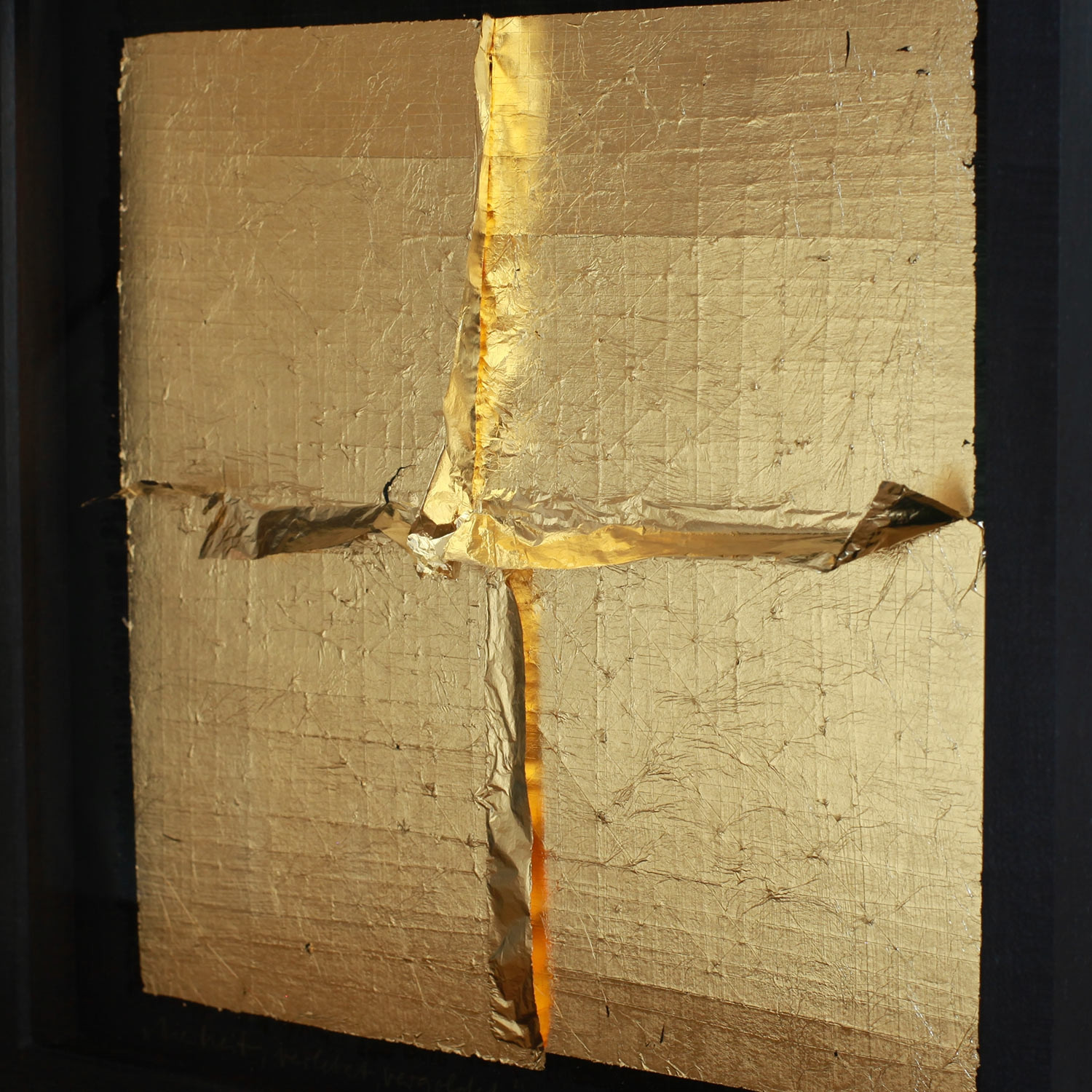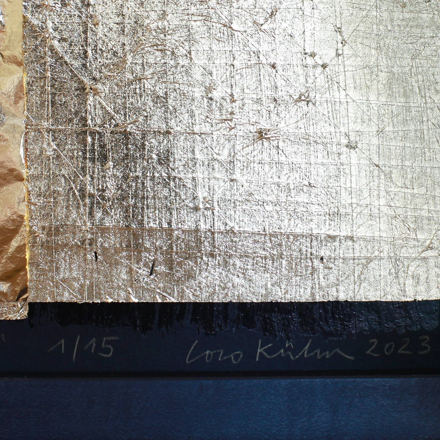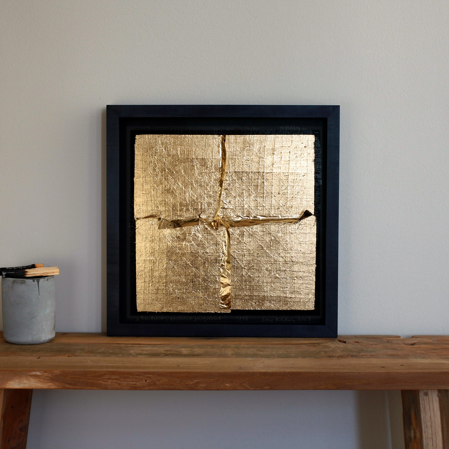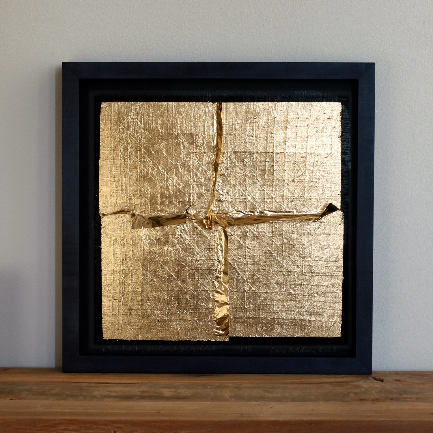 Coco Kühn Vierheit, verletzt, vergoldet, 2023 Material Karton, Blattgold (Schlagmetall) Auflage 15 Maße 35 x 35 cm Auflage 15 + 3 AP signiert, nummeriert, datiert und betitelt jedes Werk mit Unikatcharakter Details zum Rahmen Handgefertigter schwarz gebeizter und gewachster Ahornrahmen, Außenmaße ca. 37,8 x 37,8 cm, inkl. 20mm Distanzleiste, Museumsglas und rückseitiger Aufhängung Die neue Art, Kunst zu kaufen Handverlesene, exklusive Editionen Limitierte, signierte Auflagen Top-KünstlerInnen und Rising Stars Schnell registrieren, um Preis und Verfügbarkeit zu sehen. Jetzt kostenlos Mitglied werden Bereits Mitglied? Über die Edition Verletzung und Vergoldung sind die zentralen ästhetischen Parameter des Reliefs, das Coco Kühn 2023 gestaltet hat. Wir sehen den Prozess einer Heilung. Der schwarze Karton trägt eine Zeichnung, die mit dem Messer eingeschnitten ist. Die so verletzte Fläche überarbeitete Kühn mit vier zarten Blättern Schlagmetall, die wie goldene Pflaster diese Verletzungen sichtbar werden lassen, sie aber zugleich zu schützen scheinen. Die „Vierheit“ des Quadrats formt sich durch die Überlagerung der vier Blätter an den Schnittstellen zu einem Kreuz, das sich im Vorbeigehen leicht bewegt. So verschmelzen nicht nur die Gattungen von Tafelbild und Skulptur, sondern auch die Aspekte von Gefahr und Heilung zu einer vibrierenden Einheit. Ganz im Sinne der japanischen Technik Kintsugi, die durch die Reparatur in Gold den Makel des Bruchs feiert, deutet Kühn die Verletzungen zu einem optimistischen Prozess um, der sich uns Betrachter*innen sofort vermittelt: Selten besaß eine Edition bei artflash eine solch haptische Eleganz. Über die Künstlerin Initiatorin der legendären Ausstellung „36 x 27 x 10“ im Berliner Palast der Republik als letzte Aktion vor seinem Abriss, Mitbegründerin der Temporären Kunsthalle am gleichen Ort – auch wer Coco Kühn selbst nicht kennt, wird vielleicht schon ihre beeindruckenden Projekte in der Hauptstadt gesehen haben. Auch heute lebt die Künstlerin, die in Hanau Silberschmiedin gelernt und in Halle Bildhauerei und Malerei studiert hat, in Berlin. Aufmerksamkeit erregte sie durch ihre Arbeiten mit Alltagsmaterialien wie Dosen und Zeitungen, aus denen sie berührend-strenge Skulpturen und Installationen schuf. Sie ist gleichermaßen minimalistische Meisterin der kleinen Form wie Schöpferin großer architekturbezogener Formate. Ihre größte begehbare Skulptur baute sie als Bühnenbild für das Stück „Genua 01“ am Theater im Marstall in München. Kühn wuchs in einer Schmiede auf, deshalb, so sagt sie, kombiniere sie seit einiger Zeit die Farben Schwarz und Gold zu immer neuen metallischen Kontrasten, die verblüffend sinnlich sind. Luzide und knapp bringt sie es selbst so auf den Punkt: „Ich arbeite derzeit mit Verbrennungen, Verletzungen und Vergoldungen.“ Ausstellungen (Auswahl) Einzelausstellungen (Auswahl): 2024 Kunsthalle Potsdam 2020 „Glanz und Tiefe“, Kunstraum Sommer, Radebeul; „Labium Golden“, Gemeindezentrum am Fennpfuhl, Berlin 2019 „Schwarz und Gold“, K90, Berlin Gruppenausstellungen (Auswahl): 2023 artflash c/o Galerie Knust Kunz, München 2022 „Die Kirschen der Freiheit“, Kunstpool, Ulm; „Uferhallen Kunstaktien“, Uferhallen Berlin 2021 „Die Kunst des Wartens“, KunstForumEifel 2011 „Unheimlich vertraut“, C/O Berlin 2004 The Armory Show, New York, bei Galerie Markus Richter, Berlin Lesenswerte Artikel / Links Coco Kühn bei Galerie Markus Richter, Berlin Artikel in der „WELT“ über die Temporäre Kunsthalle, Berlin Mehr Kunst entdecken Naja Conrad-Hansen Black, 2013/2014 Roman Manikhin Black Ladies II, 2018 Nadine Wölk Symposium 1, 2022 Stefan Marx Our Future, 2023 Henri Haake Honey Lotion, 2022 Katrin Stangl Sumatra, 2008