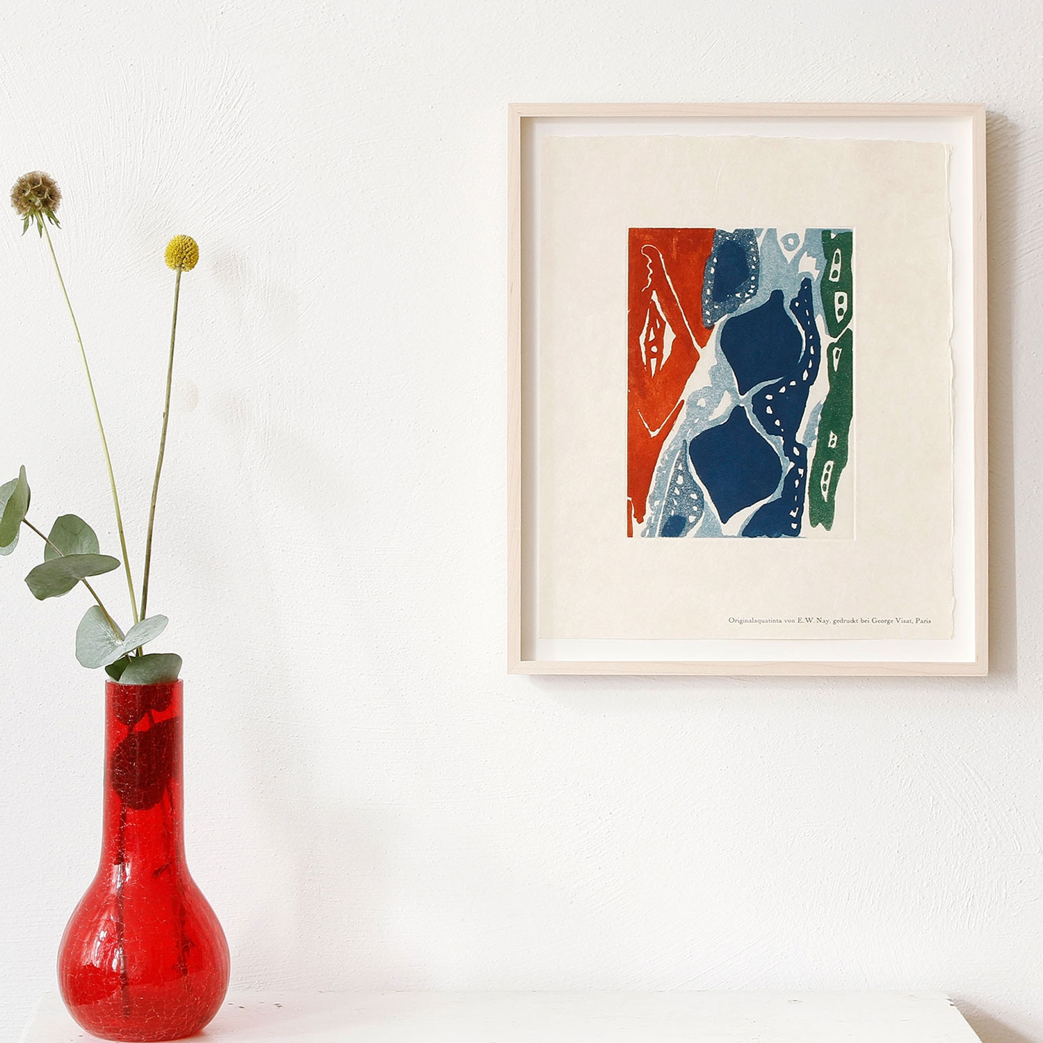 Ernst Wilhelm Nay Farbaquatinta 1965 ‒ 7 Neujahrsgruß, 1965 Material Original-Farbaquatinta, Druck von 3 Platten (Zinnoberrot, Hell-und Dunkelblau, Dunkelgrün), auf chamoisfarbenem Japon nacré Bütten Herstellungsmethode Verleger: Wolfgang Ketterer, München, Druck: Georges Visat, Paris Werkverzeichnis/Referenz: Gabler, Karlheinz, Ernst Wilhelm Nay. Die Druckgrafik 1923‒1968, Belser, Stuttgart 1975, S. 184‒185, Nr. 81 Auflage 1428 Maße 35 x 28,5 Blattgröße Im unteren Blattrand typografisch bedruckt mit „Originalaquatinta von E.W. Nay“, gedruckt bei Georges Visat, Paris. Zusätzlich wurden seinerzeit 100 Exemplare von Nay signiert und nummeriert. Details zum Rahmen Handgefertigter Ahorn-Holzrahmen, mit 10mm Distanzleiste, Außenmaße ca. 33,2 x 39,7 cm. Inkl. rückseitiger Hängeleiste, staubdicht verschlossen. Die neue Art, Kunst zu kaufen Handverlesene, exklusive Editionen Limitierte, signierte Auflagen Top-KünstlerInnen und Rising Stars Schnell registrieren, um Preis und Verfügbarkeit zu sehen. Jetzt kostenlos Mitglied werden Bereits Mitglied? Über die EditionZinnoberrot, Hell- und Dunkelblau, Dunkelgrün ‒ diese Farben verwendete Ernst Wilhelm Nay in seiner „Farbaquatinta 1965“. 100 signierte Exemplare wurden davon gedruckt, außerdem 1.428 Exemplare als Neujahrsgruß der Galerie von Wolfgang Ketterer in München. Dieses verbliebene Exemplar stammt aus dem Nachlass des renommierten Galeristen und Verlegers. „Farbaquatinta 1965“ ist ein prägnantes Zeugnis der späten Schaffensphase Nays, für den die Malerei stets die „geistige Setzung der Farbe“ war: Nur noch ganz reduziert sind hier die für ihn so typischen „Augen“ zu sehen, während die vertikalen Farbbahnen die Arbeit in Bezug setzen zu seinen letzten Bilder, für die das Gestaltungselement der Vertikale charakteristisch ist. Über den Künstler Ernst Wilhelm Nay, 1902 in Berlin geboren und 1968 in Köln gestorben, gilt als einer der bedeutendsten Maler der deutschen Nachkriegskunst. Er hat neue Maßstäbe gesetzt, sein Werk gehört zum Kunstkanon. Seine Arbeiten finden sich in den namhaftesten Museumssammlungen Europas und der USA. Zu Recht war er davon überzeugt, dass die von ihm geschaffene Kunst seiner Zeit weit voraus war. Den radikalsten Schritt vollzog Nay Anfang der 1950er Jahre mit seinen „Rhythmischen Bildern“. Es sind ganz und gar ungegenständliche Bilder, deren Gestaltwert allein durch die Farbe zum Ausdruck kommt. Ausstellungen (Auswahl) 2018, Ernst Wilhelm Nay, Staatsgalerie Stuttgart, Stuttgart 2017, Ernst Wilhelm Nay, Almine Rech Gallery, London 2017, Ernst Wilhelm Nay. Bilder der 60er Jahre, Michael Werner Kunsthandel, Köln 2015, Ernst Wilhelm Nay. Arbeiten auf Papier, Galerie Michael Werner, Märkisch Wilmersdorf 2015, Ernst Wilhelm Nay. Gouachen und Zeichnungen 1944‒1967, Galerie Fred Jahn, München Lesenswerte Artikel / Links Ernst Wilhelm Nay-Stiftung Biografie Ernst Wilhelm Nays beim Auktionshaus Ketterer, München Ernst Wilhelm Nay bei Galerie Michael Werner, Köln/Märkisch Wilmersdorf Mehr Kunst entdecken Christian Schad Varietéprobe, 1925