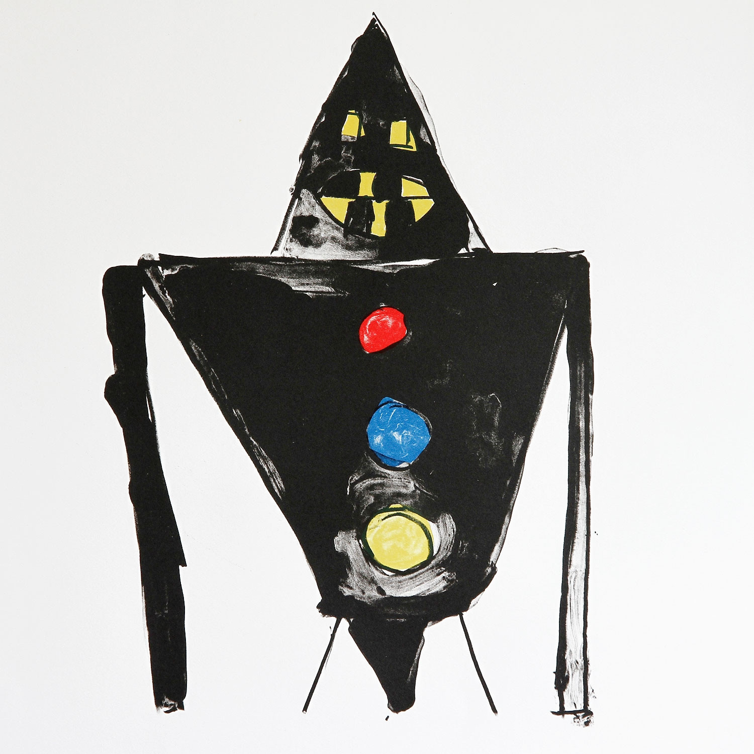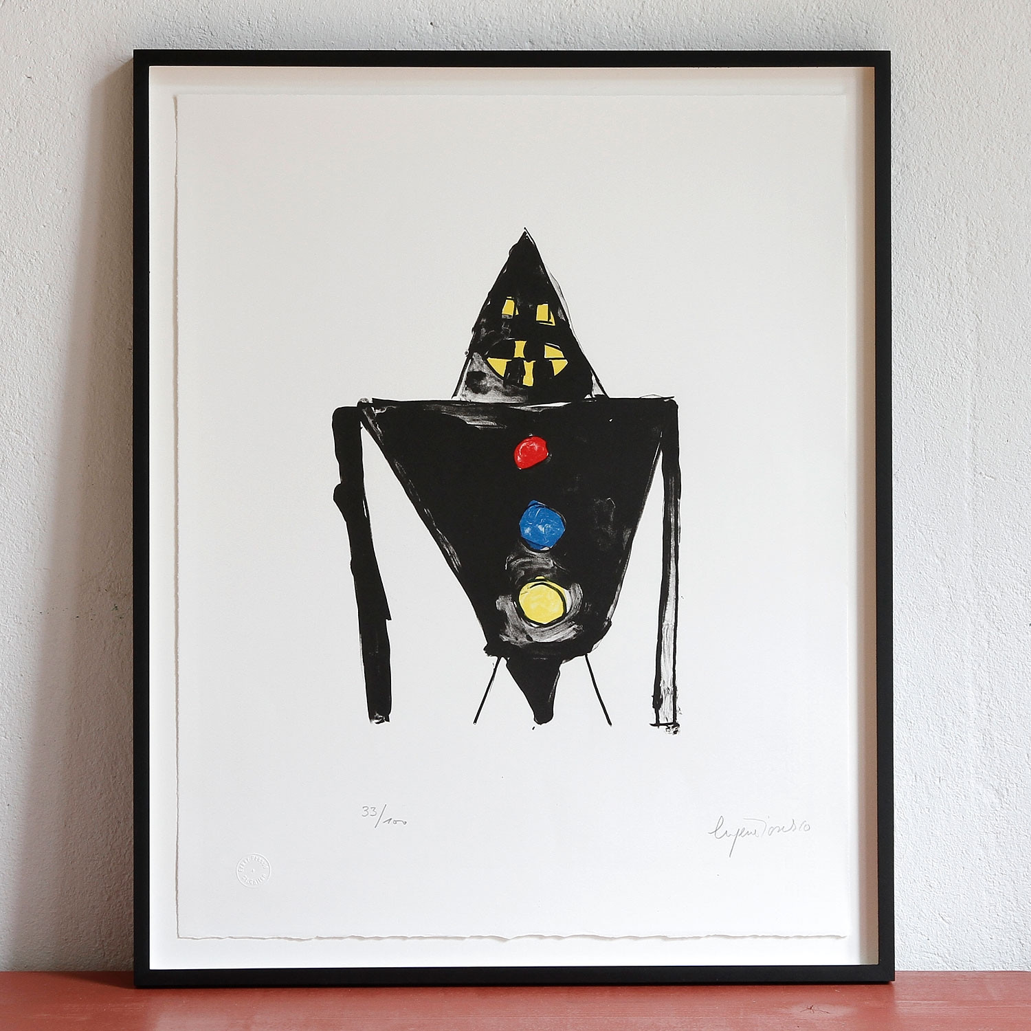 Eugène Ionesco Der schwarze Ritter, 1984 Material Farblithografie auf Rives Bütten Herstellungsmethode handsigniert und nummeriert Auflage 100 Maße 50 x 40 cm Details zum Rahmen Handgefertigter schwarz gebeizter Holzrahmen, mit 10mm Distanzleiste, Außenmaße ca. 45,4 x 55,7 cm. Inkl. rückseitiger Hängeleiste, staubdicht verschlossen. Die neue Art, Kunst zu kaufen Handverlesene, exklusive Editionen Limitierte, signierte Auflagen Top-KünstlerInnen und Rising Stars Schnell registrieren, um Preis und Verfügbarkeit zu sehen. Jetzt kostenlos Mitglied werden Bereits Mitglied? Über die Edition Zwei schwarze Dreiecke: das eine für den Kopf, das andere für den Körper. Zwei dicke, lange Striche, zwei dünne, kurze Striche: die einen für die Arme, die anderen für die Beine. Ein paar grellgelbe Rechtecke für das Gesicht, ein paar bunte Kreise für die Jackenknöpfe. Eugène Ionescos schwarzer Ritter ist wie von Kinderhand gemalt. Er erinnert an die aus dem Moment heraus entstandenen Werke der Art brut. Die Farblithografie „Der schwarze Ritter“ (1984) mit der lustigen Fratze löst kindlich-harmlosen Grusel aus. Die Spontaneität ist dieser Arbeit anzusehen. Auf seine ganz eigene Weise setzt sich Ionesco auch in seiner Malerei mit dem Menschen, dem Menschenbild auseinander. Dabei steht die Figur im Zentrum seines malerischen Werkes. Bei ihm ist sie fantasievoll und eigenwillig gestaltet. Über den Künstler Ohne Eugène Ionesco wäre die Erfindung des „Absurden Theaters“ undenkbar. Der 1909 in Rumänien geborene und 1994 in Paris gestorbene Autor gilt als wichtigster Vertreter dieser Richtung des Theaters, das die Sinnfreiheit und Banalität des Lebens, die Orientierungslosigkeit des Menschen und die Fragen seiner Existenz beleuchtet. In seinen Stücken stellte er sich gegen das Totalitäre. „Die Nashörner“ von 1959 zählen zu seinen bekanntesten Werken. Sein Stück „Kahle Sängerin“ wurde von dem Künstler Daniel Spoerri in einem Kellertheater in Bern als deutsche Erstaufführung inszeniert. Die Künstlerin Meret Oppenheim gestaltete Kostüme und Masken. 1970 wurde der Dramatiker in die Académie française aufgenommen und gehörte nunmehr offiziell zur geistigen Elite Frankreichs. Erst spät, ab 1980, wurde Ionesco auch für seine Malerei und seine Zeichnungen bekannt. In einem Interview mit seinem Freund Ulrich Wickert, dem früheren ARD-Korrespondenten in Paris, legte der sensible Dramatiker seinen Grund für die Malerei offen: „Ich male, weil es eine Therapie ist. (...) Für meine Ängste. Gegen meine Beklemmungen. (...) Ein sensibler Mensch kann nicht in dieser Welt leben. Oder er lebt mühevoll und schlecht. Das war bei mir der Fall.“ Ausstellungen (Auswahl) Schriften: 1960, Die Stühle. Eine tragische Farce, Theaterverlag Desch 1864, Die Nashörner. Erzählungen. Erinnerungen. Gedanken über das Theater, S. Fischer Verlag 1974, Der Einzelgänger. Roman, Carl Hanser Verlag 1989, Die Unterrichtsstunde, Reclam Verlag Lesenswerte Artikel / Links Webseite des Künstlers Nachruf im SPIEGEL, 1994 Eine Unterhaltung mit Ionesco, veröffentlicht 2013 in der Huffington Post Mehr Kunst entdecken Jamel Shabazz Street Photographers of Times Square, 1982