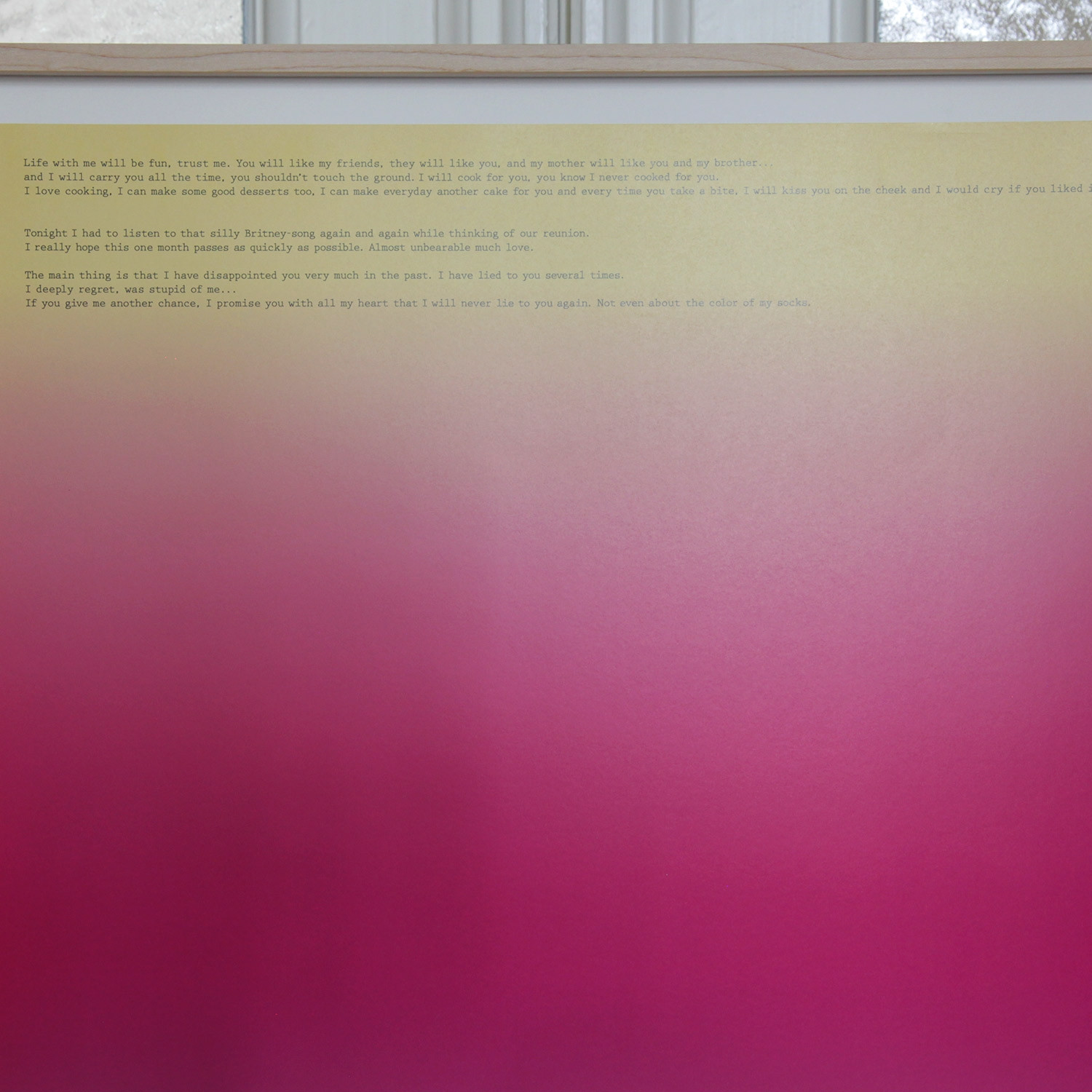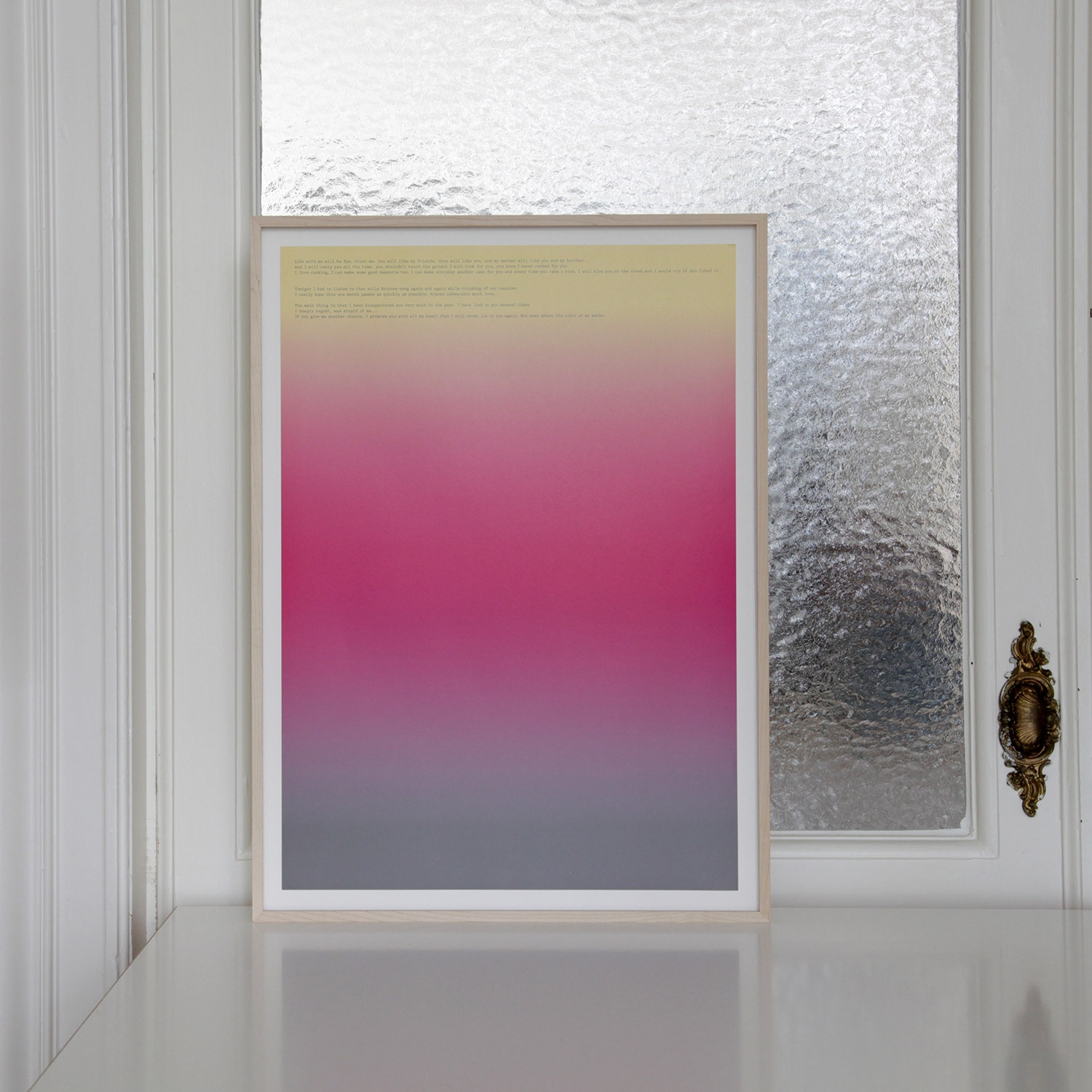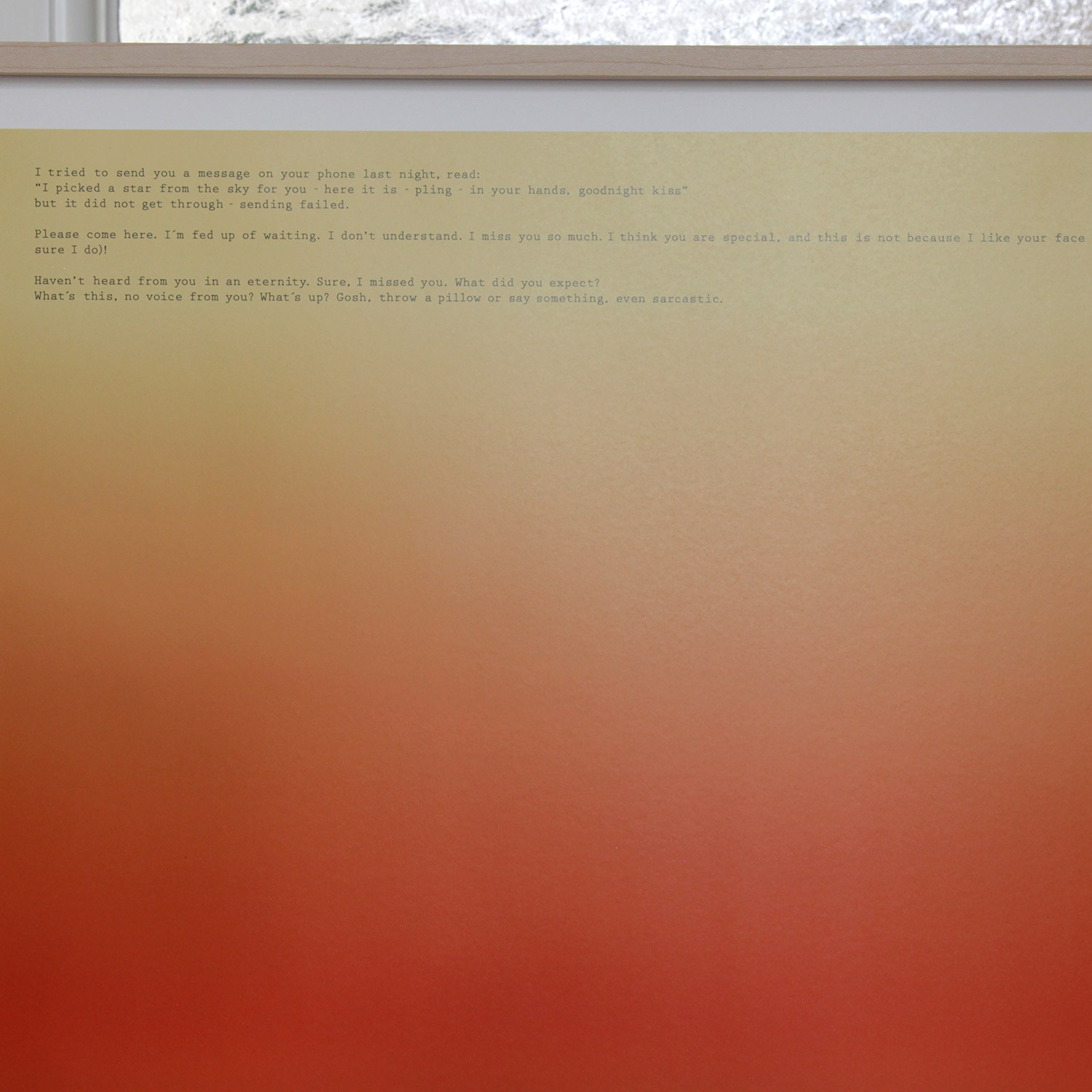 Flaka Haliti I Miss You, I Miss You, ‘Till I Don’t Miss You Anymore, 2014 Material Offset-Druck auf Munken G-Print, 250g/m2 Auflage 150 Maße 59,4 x 42 cm, Serie aus drei Offset-Drucken auf Munken G-Print, 250g/m2, Auflage 150 + 20 AP, rückseitig signiert und nummeriert Details zum Rahmen 3 handgefertigte Ahorn-Holzrahmen, inkl. 10mm Distanzleiste, Außenmaß je 64,6 x 47,2 cm, das Blatt wird hängend montiert, inkl. Normalglas, luftdicht verschlossen, inkl. rückseitiger Aufhängung Die neue Art, Kunst zu kaufen Handverlesene, exklusive Editionen Limitierte, signierte Auflagen Top-KünstlerInnen und Rising Stars Schnell registrieren, um Preis und Verfügbarkeit zu sehen. Jetzt kostenlos Mitglied werden Bereits Mitglied? Über die Edition Rot für Leidenschaft, Grau für Distanz – schon das Farbspektrum in der Edition „I Miss You, I Miss You, ’Till I Don’t Miss You Anymore‟ (2014) von Flaka Haliti zeigt, auf welcher emotionalen Gefühlsskala wir uns gerade befinden. Die Texte machen dies noch einmal auf direktere Art und Weise anschaulich: Es sind per E-Mail verschickte Liebesbotschaften von Paaren in einer Fernbeziehung zwischen großer und verzweifelter Sehnsucht, sie markieren Anfang und Ende der Verbundenheit. Die Dreierserie verweist auf eine Videoinstallation der Künstlerin, in der die Mailausschnitte auf der Benutzeroberfläche von Google Translate zu sehen waren und von einem Computer vorgetragen wurden. Taumel oder Kummer? Die Höhen und Tiefen verlieren sich hier in der monochromen Stimme, in dieser Brechung flackert auch der zarte Humor Halitis auf. Und deutlich wird: Die persönlichen Liebes- und Leidensgeschichten sind verallgemeinerbar – man findet sich wieder, die Last verteilt sich und wird so ganz nebenbei ihrer Wucht beraubt. Über die Künstlerin Mit Stierhoden, eingewickelt in Cellophan, wurde die Künstlerin Flaka Haliti in ihrer Heimat Kosovo schlagartig bekannt. Sie platzierte sie auf der Treppe der Nationalgalerie in Priština als Reaktion auf abschätzige Kommentare von Kollegen, dass Künstlerinnen angeblich „keine Eier“ hätten. Jahre später vertrat Haliti den Kosovo dann auf der Biennale in Venedig. Gesellschaftlichen Strukturen und Machtverhältnissen geht sie in ihrem konzeptuellen Werk in Form von Mixed Media, skulpturalen Arbeiten und Rauminstallationen bis heute nach, etwa wenn sie Ausstellungsräume mit Betonpfeilern verstellt, die an das UNO-Gebäude in Priština oder an die Absicherung der Festung Europa durch die Agentur Frontex erinnern. Gleichzeitig sind ihre Arbeiten reich an Poesie – und Humor. Dies zeigen Beispiele wie ein mit „Just Hanging Around“ betitelter Vorhang mit Farbtönen, die an einen Sonnenuntergang erinnern oder die über Schäfchenwolkenformationen gelegten Gesichter aus ihrer Serie „I See a Face. Do You See a Face“. Haliti lebt heute in München. Werke von ihr sind u.a. in der Sammlung zeitgenössischer Kunst der Bundesrepublik Deutschland, im Lenbachhaus München und in der Kunstsammlung der Erste Group und ERSTE Stiftung in Wien vertreten. Ausstellungen (Auswahl) „Watchu Expect Me To Do When I Lose My Cool“ – so lautete der Titel der ersten Einzelausstellung von Flaka Haliti in der Galerie Deborah Schamoni, München, im Jahr 2020. Ihre erste institutionelle Einzelausstellung in Deutschland zeigte die Künstlerin 2017 in der Kunsthalle Lingen. 2015 vertrat sie die Republik Kosovo bei der 56. Biennale von Venedig. Lesenswerte Artikel / Links Instagram-Account von Flaka Haliti Künstlerinnenseite bei Deborah Schamoni Galerie, München Rezension von Art Review aus dem Jahr 2014 über Flaka Haliti´s Werkhttps://artreview.com/2014-futuregreats-flaka-haliti/ Mehr Kunst entdecken Julius Hofmann Lurking Teen, 2021 Tal R Rajasthani poppets , 2019 Hanne Darboven Gregorianischer Kalender, 2006