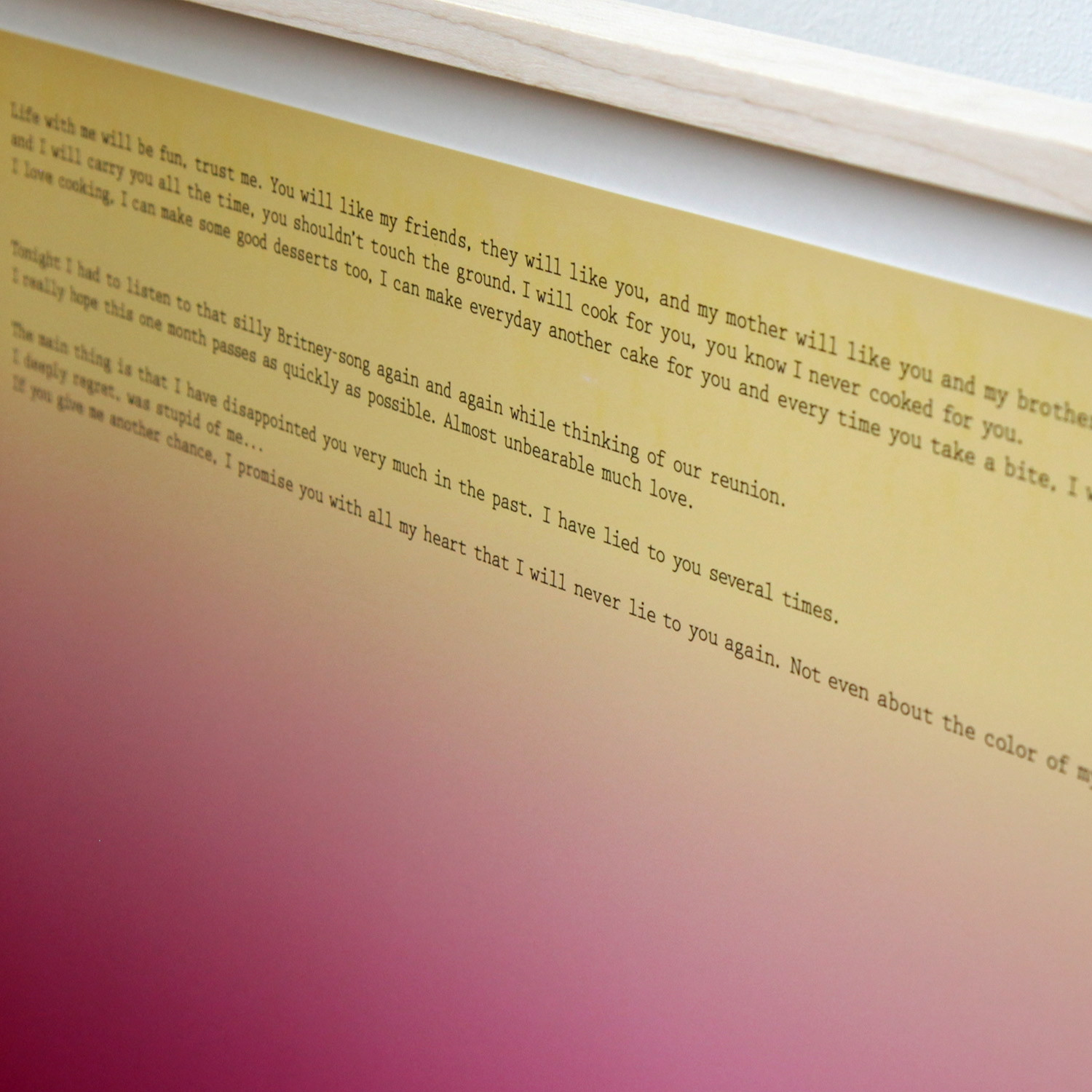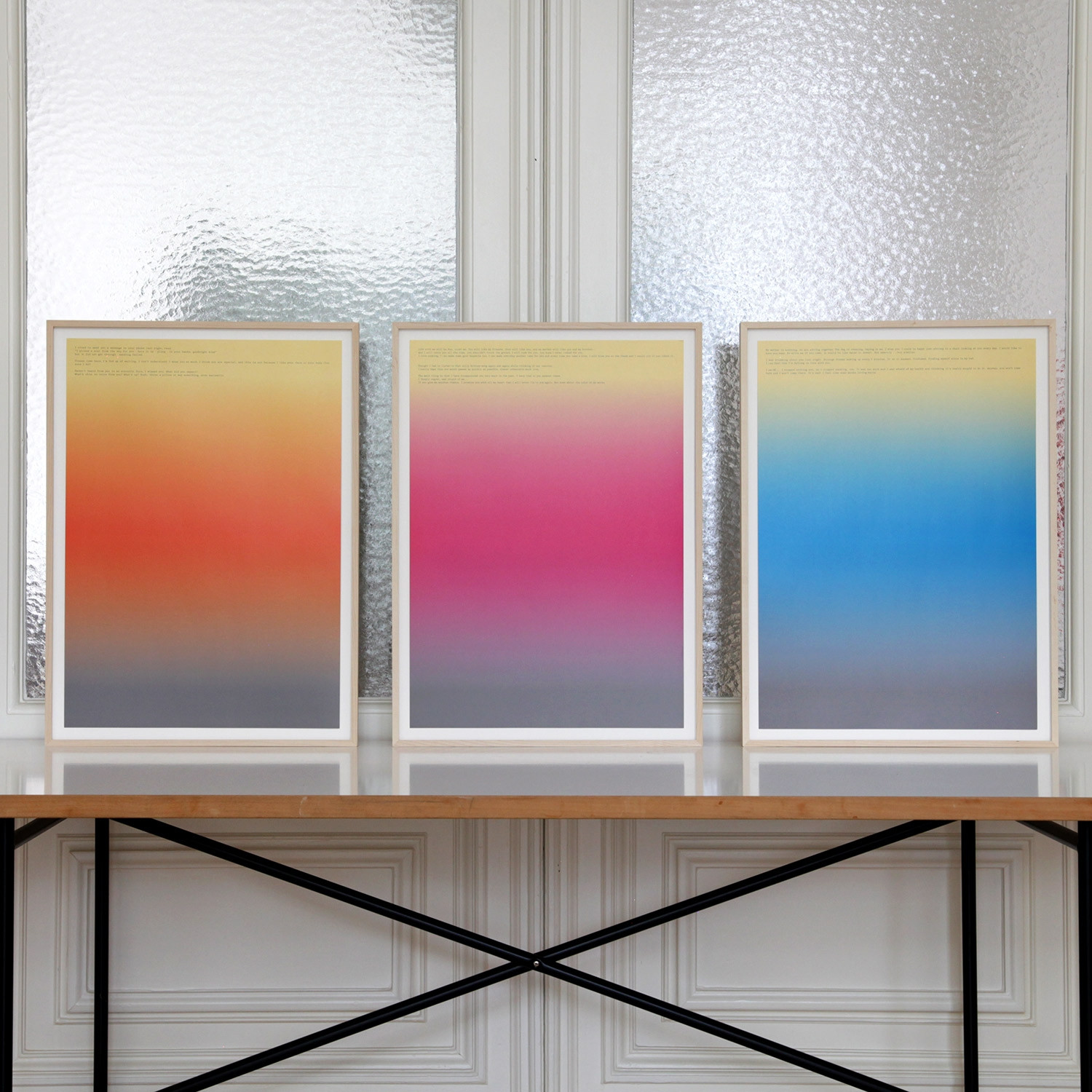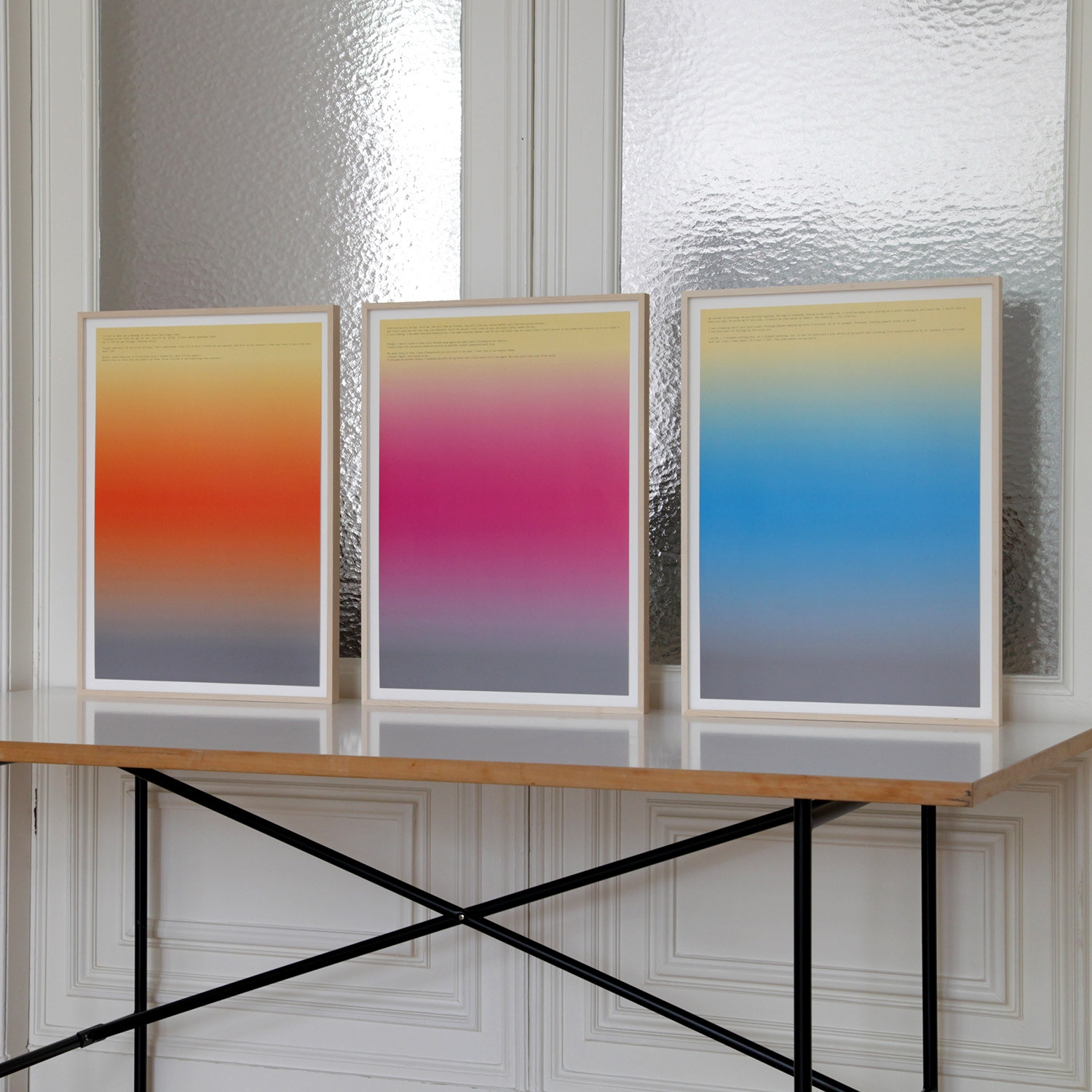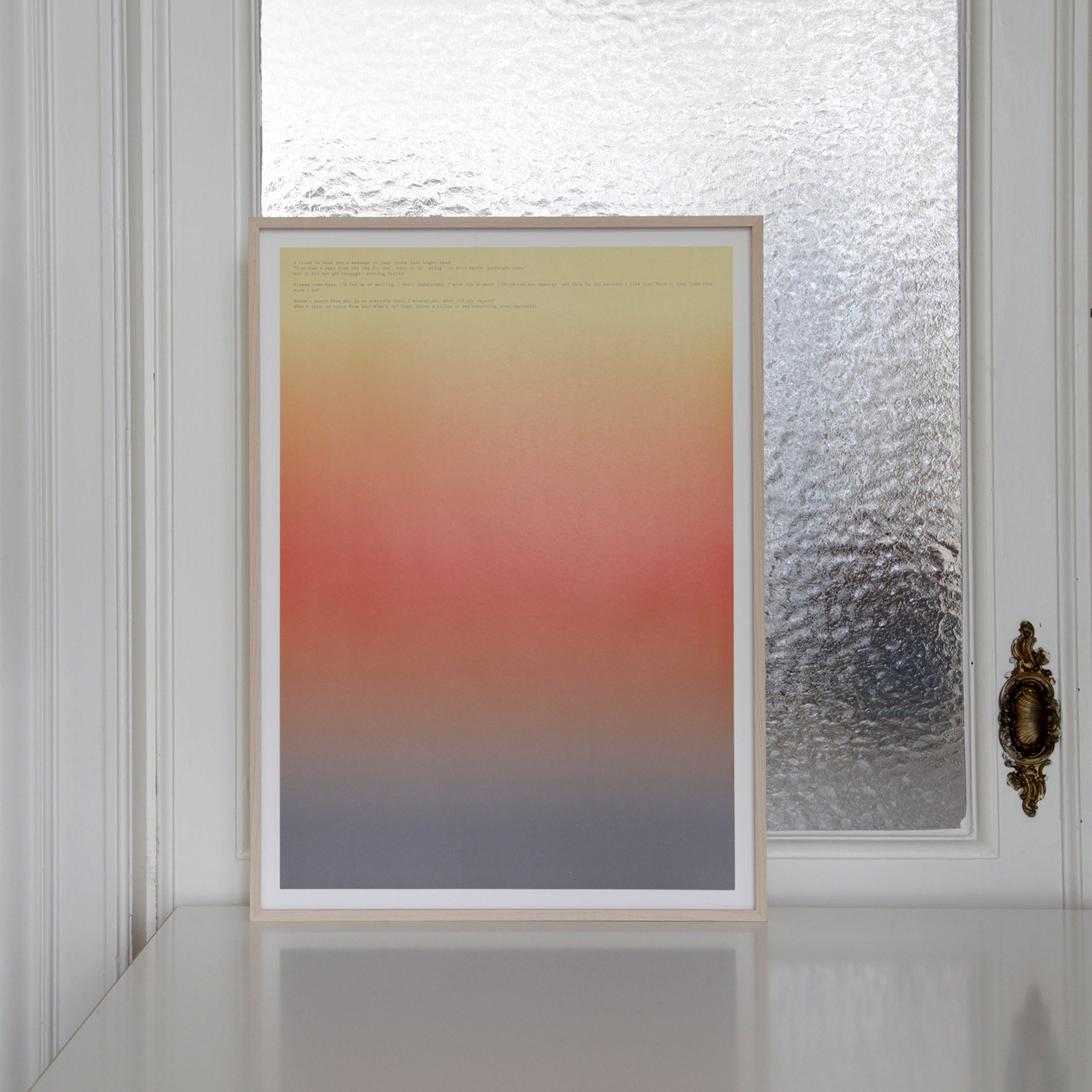 Flaka Haliti I Miss You, I Miss You, ‘Till I Don’t Miss You Anymore, 2014 Material Offset-Druck auf Munken G-Print, 250g/m2 Auflage 150 Maße 59,4 x 42 cm, Serie aus drei Offset-Drucken auf Munken G-Print, 250g/m2, Auflage 150 + 20 AP, rückseitig signiert und nummeriert Details zum Rahmen 3 handgefertigte Ahorn-Holzrahmen, inkl. 10mm Distanzleiste, Außenmaß je 64,6 x 47,2 cm, das Blatt wird hängend montiert, inkl. Normalglas, luftdicht verschlossen, inkl. rückseitiger Aufhängung Die neue Art, Kunst zu kaufen Handverlesene, exklusive Editionen Limitierte, signierte Auflagen Top-KünstlerInnen und Rising Stars Schnell registrieren, um Preis und Verfügbarkeit zu sehen. Jetzt kostenlos Mitglied werden Bereits Mitglied? Über die Edition Rot für Leidenschaft, Grau für Distanz – schon das Farbspektrum in der Edition „I Miss You, I Miss You, ’Till I Don’t Miss You Anymore‟ (2014) von Flaka Haliti zeigt, auf welcher emotionalen Gefühlsskala wir uns gerade befinden. Die Texte machen dies noch einmal auf direktere Art und Weise anschaulich: Es sind per E-Mail verschickte Liebesbotschaften von Paaren in einer Fernbeziehung zwischen großer und verzweifelter Sehnsucht, sie markieren Anfang und Ende der Verbundenheit. Die Dreierserie verweist auf eine Videoinstallation der Künstlerin, in der die Mailausschnitte auf der Benutzeroberfläche von Google Translate zu sehen waren und von einem Computer vorgetragen wurden. Taumel oder Kummer? Die Höhen und Tiefen verlieren sich hier in der monochromen Stimme, in dieser Brechung flackert auch der zarte Humor Halitis auf. Und deutlich wird: Die persönlichen Liebes- und Leidensgeschichten sind verallgemeinerbar – man findet sich wieder, die Last verteilt sich und wird so ganz nebenbei ihrer Wucht beraubt. Über die Künstlerin Mit Stierhoden, eingewickelt in Cellophan, wurde die Künstlerin Flaka Haliti in ihrer Heimat Kosovo schlagartig bekannt. Sie platzierte sie auf der Treppe der Nationalgalerie in Priština als Reaktion auf abschätzige Kommentare von Kollegen, dass Künstlerinnen angeblich „keine Eier“ hätten. Jahre später vertrat Haliti den Kosovo dann auf der Biennale in Venedig. Gesellschaftlichen Strukturen und Machtverhältnissen geht sie in ihrem konzeptuellen Werk in Form von Mixed Media, skulpturalen Arbeiten und Rauminstallationen bis heute nach, etwa wenn sie Ausstellungsräume mit Betonpfeilern verstellt, die an das UNO-Gebäude in Priština oder an die Absicherung der Festung Europa durch die Agentur Frontex erinnern. Gleichzeitig sind ihre Arbeiten reich an Poesie – und Humor. Dies zeigen Beispiele wie ein mit „Just Hanging Around“ betitelter Vorhang mit Farbtönen, die an einen Sonnenuntergang erinnern oder die über Schäfchenwolkenformationen gelegten Gesichter aus ihrer Serie „I See a Face. Do You See a Face“. Haliti lebt heute in München. Werke von ihr sind u.a. in der Sammlung zeitgenössischer Kunst der Bundesrepublik Deutschland, im Lenbachhaus München und in der Kunstsammlung der Erste Group und ERSTE Stiftung in Wien vertreten. Ausstellungen (Auswahl) „Watchu Expect Me To Do When I Lose My Cool“ – so lautete der Titel der ersten Einzelausstellung von Flaka Haliti in der Galerie Deborah Schamoni, München, im Jahr 2020. Ihre erste institutionelle Einzelausstellung in Deutschland zeigte die Künstlerin 2017 in der Kunsthalle Lingen. 2015 vertrat sie die Republik Kosovo bei der 56. Biennale von Venedig. Lesenswerte Artikel / Links Instagram-Account von Flaka Haliti Künstlerinnenseite bei Deborah Schamoni Galerie, München Rezension von Art Review aus dem Jahr 2014 über Flaka Haliti´s Werkhttps://artreview.com/2014-futuregreats-flaka-haliti/ Mehr Kunst entdecken Julius Hofmann Lurking Teen, 2021 Tal R Rajasthani poppets , 2019 Hanne Darboven Gregorianischer Kalender, 2006