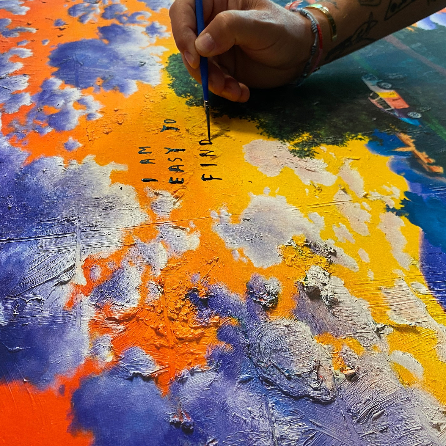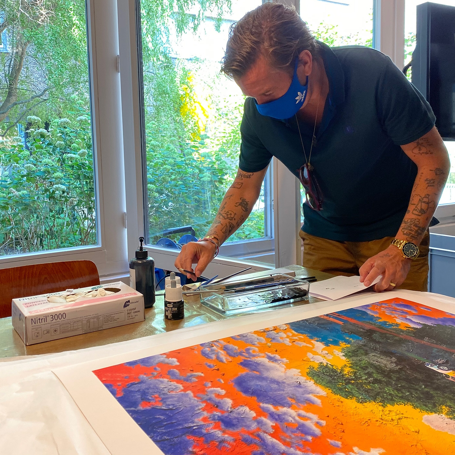 Die Kunst des Sprengel-Preisträgers lässt uns auf keinen Fall kalt. Wie die Wolken vor dem strahlenden Gelb und Orange in seiner Edition „I Am Easy to Find“ (2020) türmen sich die Emotionen auf vor einer solchen Kulisse. Als wüsste man nicht, dass der Sonnenuntergang täglich wiederkehrt. Selbst der Fluss und das abgelegen parkende Auto nehmen die Himmelsfarben auf. Wer immer da spricht, spricht auch aus uns. Kunath veranschaulicht universelle Gemütszustände – überbordend und leicht zugleich. Dabei hilft ihm vor allem ein Mittel: die Ironie. Den titelgebenden Schriftzug hat er mit schwarzer Tinte aufgetragen. Jedes Bild ist ein Unikat. Mal kommen Vögel, mal ein fliegendes Pizzastück, ein Ufo oder ein schnell skizzierter Sonnenuntergang hinzu. Mithilfe dieser Lakonie gelingt Kunath nicht weniger, als die Romantik hinüber in die zeitgenössische Kunst zu retten.