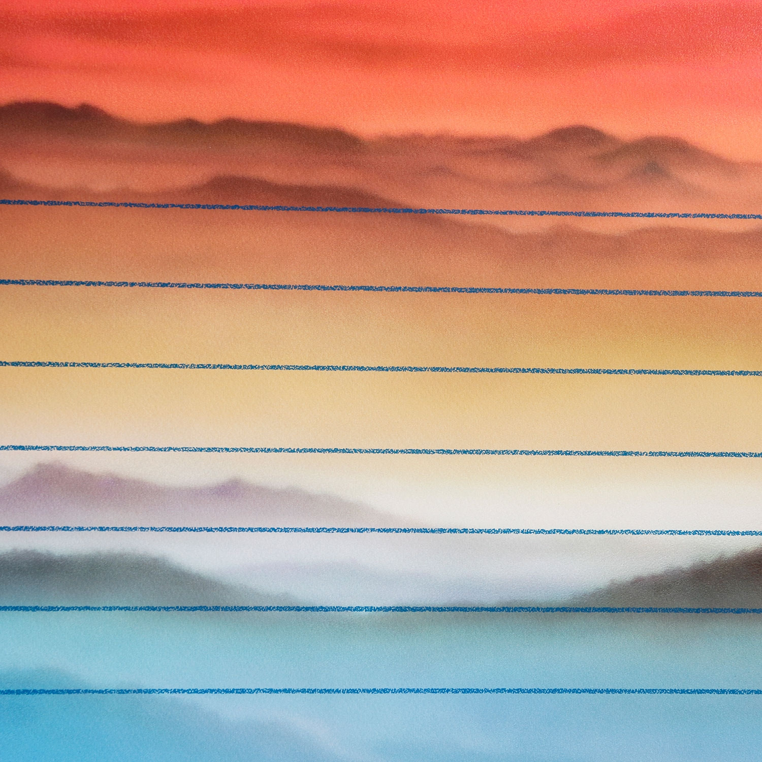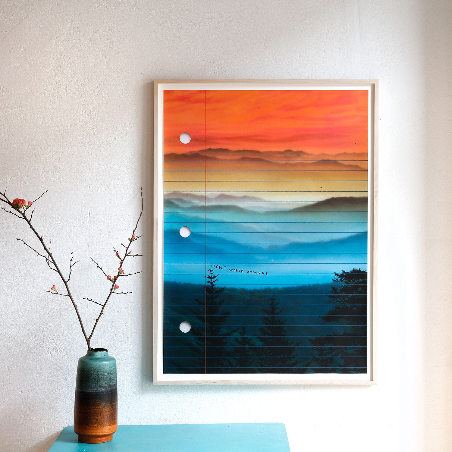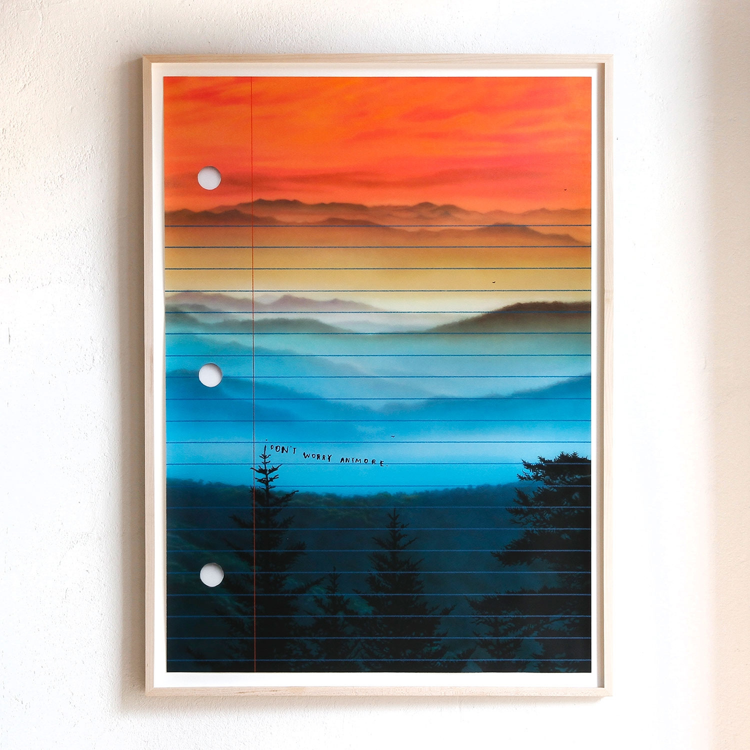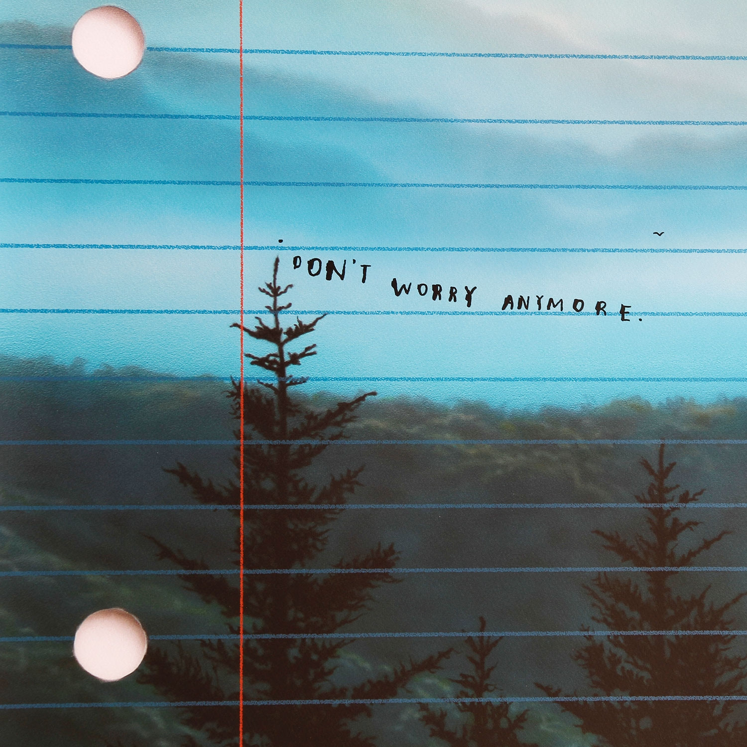 Ein Wald, still und schweigend, besetzt die untere Bildhälfte, hinter ihm erheben sich im Dunst Hügelketten, die in der Ferne in ein Gebirge übergehen ‒ eine Landschaft, die sich in einer unendlich anmutenden Staffelung bis in die Wolken zu entwickeln scheint. Über allem wölbt sich der von der Sonne gerötete Himmel. „Romantik“ ist ein Wort, das dem Betrachter sofort in den Sinn kommt, jedoch die Bildwirkung nicht annähernd beschreibt. Das Bild überwältigt in seiner Melancholie, man fühlt das Glück ganz nah. Danke, Friedrich Kunath! Niemand braucht sich mehr zu sorgen, einfach hineinschauen in das Licht und die Farbe. Es ist doch egal, wenn das Bildmotiv nicht dokumentarisch fotografiert ist: Nicht nur die Natur, auch die Kunst darf Seelenheil versprechen. „I don't worry anymore“ (2017).