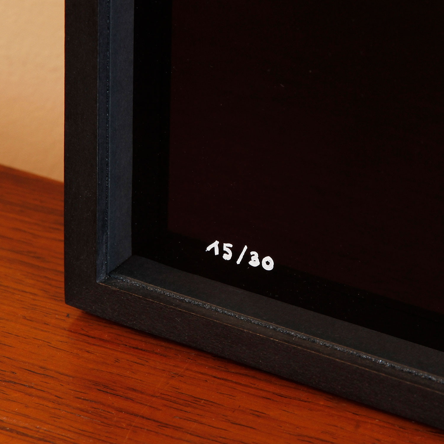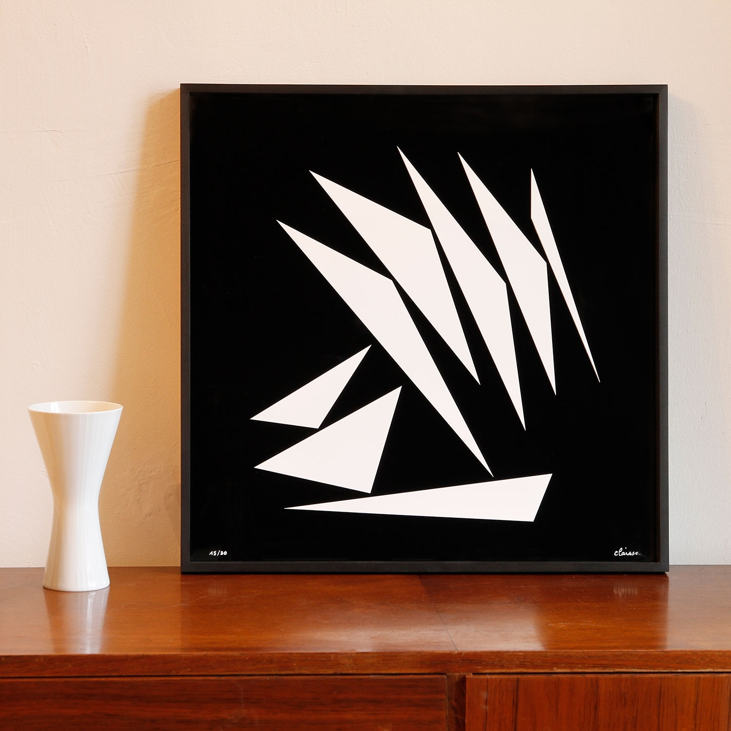 Geneviève Claisse Composition géometrique, 2016 Material Relief, weißes Acryl auf schwarzem Acryl Auflage 30 Maße 40 x 38 cm auf 50 x 50 cm Auflage 30 handsigniert und nummeriert Details zum Rahmen Handgefertigter schwarz gebeizter Holzrahmen, Fotomontage inkl. Mirogard/Museumsglas mit 10 mm Distanzleiste. Außenmaße ca. 51,6 x 51,6 cm. Inkl. Rückseitiger Aufhängung, staubdicht verschlossen. Die neue Art, Kunst zu kaufen Handverlesene, exklusive Editionen Limitierte, signierte Auflagen Top-KünstlerInnen und Rising Stars Schnell registrieren, um Preis und Verfügbarkeit zu sehen. Jetzt kostenlos Mitglied werden Bereits Mitglied? Über die Edition„Composition géometrique“ (2016) zeigt weiße dreieckige Flächen auf tiefschwarzem Grund. Die Dreiecke scheinen zu tanzen, bauen sich Spitze an Spitze übereinander auf. Es ist nicht vorstellbar, dass sich ein solches Gebilde als dreidimensionale Komposition im Raum selbst hielte. Diese Magie der Bewegung ist allein in einem Bild oder, wie in dieser Ausführung, in einem Relief möglich. Über die Künstlerin Die Französin Geneviève Claisse (*1935) starb in 2018 im Alter von 83 Jahren. Sie war die Grande Dame der geometrischen Abstraktion. Claisse studierte an der École des Beaux-Arts in Paris. Ihre erste Ausstellung hatte sie 1960, in der Folge wurde ihr Œuvre weltweit in Museen und Galerien gezeigt. Herausragend ist die Stabilität im Schaffen der Malerin, auf ihr Werk ist Verlass. Stets herrscht ein Ungleichgewicht der Formen, die auf einen makellosen Farbauftrag treffen. Bei Claisse wird die Farbfläche lebendig, die Künstlerin war immer auf der Suche nach Bewegung. Insbesondere kommt diese Suche in ihren dreidimensionalen Arbeiten zum Ausdruck. Ausstellungen (Auswahl) 2012, Galerie Denise René, Paris 2010, Sommer & Kohl, Berlin 2008, Frauenmuseum, Bonn 2005, Arithmeum, Bonn 2001, Centre Georges Pompidou, Paris 2001, Royal Academy of Arts, London 2000, Museum of Art, Ibataki 2000, Marugame Genichiro-Inokuma Museum of Contemporary Art, Kagawa Lesenswerte Artikel / Links Videodokumentation über die Arbeit von Geneviève Claisse Werke von Geneviève Claisse bei artnet Werke von Geneviève Claisse bei Galerie Fleury, Paris Mehr Kunst entdecken Bianca Kennedy Serie "Portraits of Taking a Bath in Movies": Enter the Void, 2021 Bianca Kennedy Serie "Portraits of Taking a Bath in Movies": Killing Eve, 2021 Bianca Kennedy Serie "Portraits of Taking a Bath in Movies": Knocked up, 2019