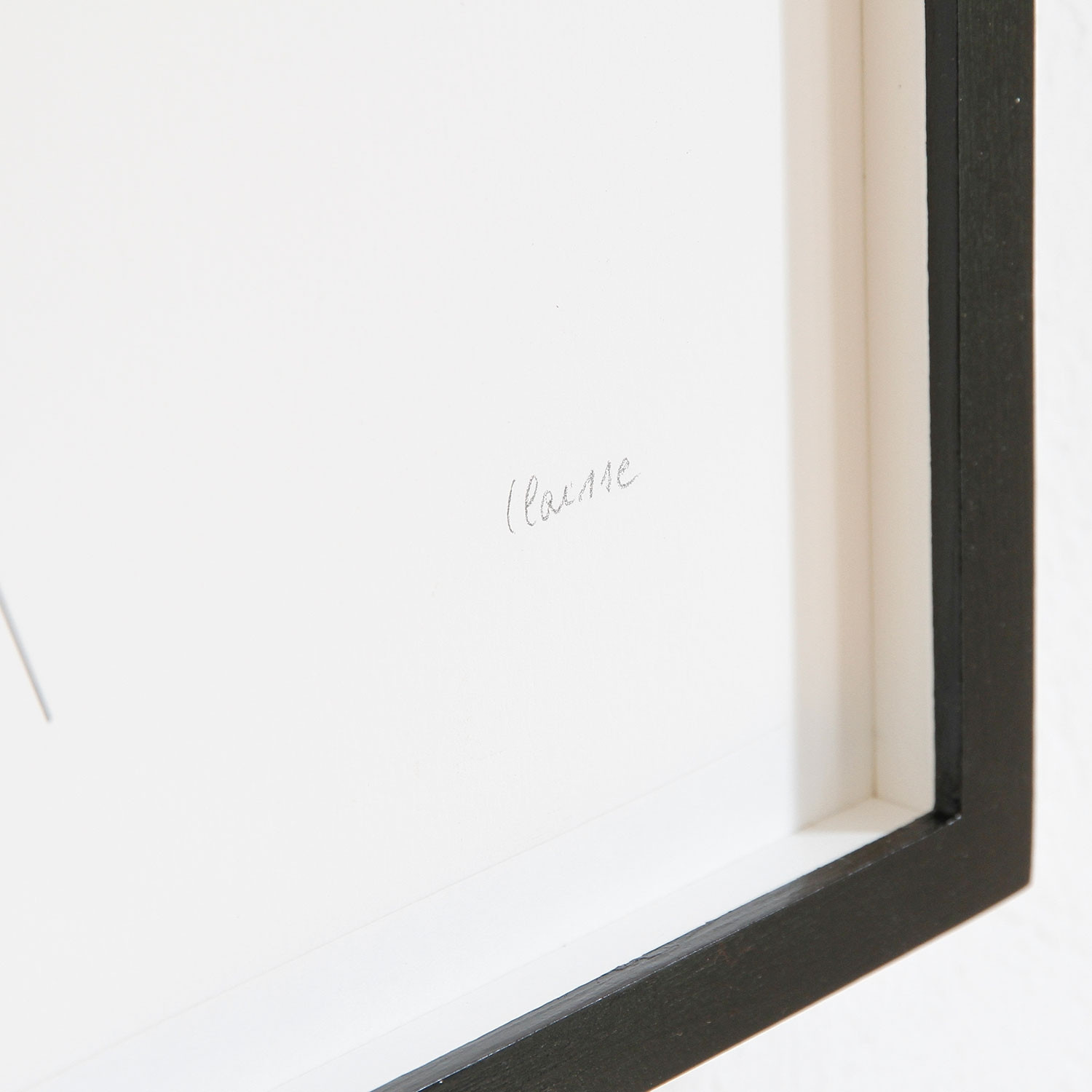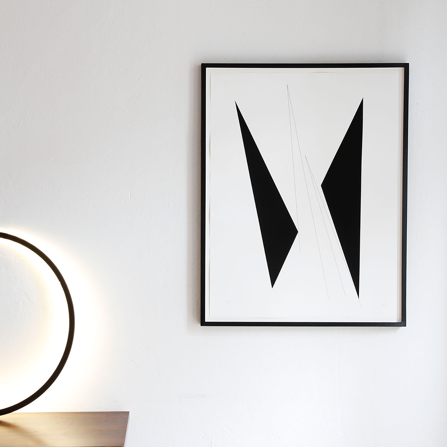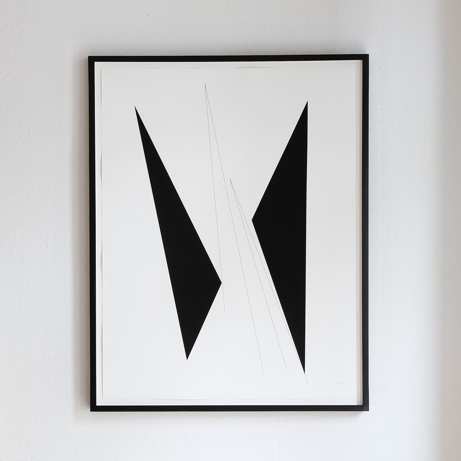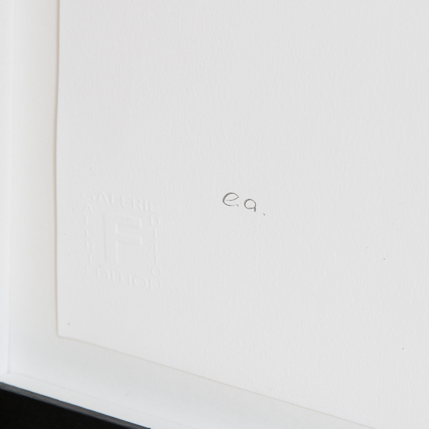 Geneviève Claisse Composition géometrique, 2015 Material 3D-Konstruktion Herstellungsmethode handsigniert Auflage 30 Maße 73 x 42 cm auf 80 x 61 cm Details zum Rahmen Handgefertigter schwarzer Holzrahmen, mit 10 mm Distanzleiste. Außenmaße ca. 67,9 x 86,5 cm. Inkl. Rückseitiger Hängeleiste, staubdicht verschlossen. Die neue Art, Kunst zu kaufen Handverlesene, exklusive Editionen Limitierte, signierte Auflagen Top-KünstlerInnen und Rising Stars Schnell registrieren, um Preis und Verfügbarkeit zu sehen. Jetzt kostenlos Mitglied werden Bereits Mitglied? Über die EditionIn der handsignierten Edition „Composition géometrique“ (2015) treffen schwarze Dreiecke auf gestrichelte, aufeinander zulaufende Linien. In dieser Arbeit dominiert die Farbe Schwarz den weißen Grund. Fast zufällig, möchte man meinen, begegnen sich hier Linie und Fläche, das Resultat ist ein fragiles, vibrierendes Spannungsverhältnis. Doch ist der Zufall in Claisses Werk überhaupt möglich? Ist es nicht ganz im Gegenteil ein bewusstes, perfekt beherrschtes Bewegungsspiel der Formen im Bild? Über die Künstlerin Die Französin Geneviève Claisse (*1935) starb im Jahr 2018 im Alter von 83 Jahren. Sie war die Grande Dame der geometrischen Abstraktion. Claisse studierte an der École des Beaux-Arts in Paris. Ihre erste Ausstellung hatte sie 1960, in der Folge wurde ihr Œuvre weltweit in Museen und Galerien gezeigt. Herausragend ist die Stabilität im Schaffen der Malerin, auf ihr Werk ist Verlass. Stets herrscht ein Ungleichgewicht der Formen, die auf einen makellosen Farbauftrag treffen. Bei Claisse wird die Farbfläche lebendig, die Künstlerin war immer auf der Suche nach Bewegung. Insbesondere kommt diese Suche in ihren dreidimensionalen Arbeiten zum Ausdruck. Ausstellungen (Auswahl) 2012, Galerie Denise René, Paris 2010, Sommer & Kohl, Berlin 2008, Frauenmuseum, Bonn 2005, Arithmeum, Bonn 2001, Centre Georges Pompidou, Paris 2001, Royal Academy of Arts, London 2000, Museum of Art, Ibataki 2000, Marugame Genichiro-Inokuma Museum of Contemporary Art, Kagawa Lesenswerte Artikel / Links Videodokumentation über die Arbeit von Geneviève Claisse Werke von Geneviève Claisse bei artnet Werke von Geneviève Claisse bei Galerie Fleury, Paris Mehr Kunst entdecken Geneviève Claisse Composition géometrique, 2016 Jim Avignon Minutenrestaurant, 2017 Moisès Villèlia La Sinfonia Celeste , 1991