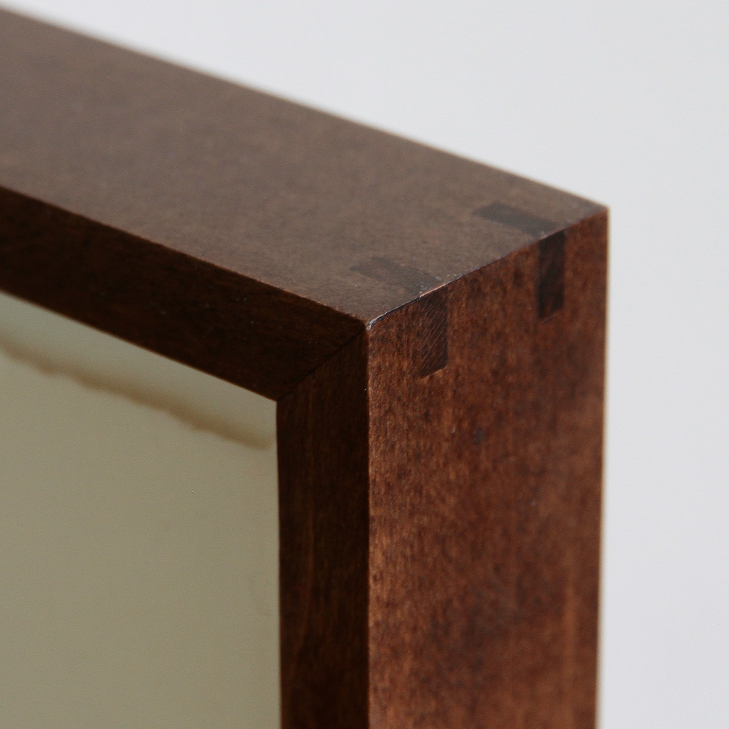 Handgefertigter Nussbaum-Holzrahmen, inkl. 8mm Distanzleiste, Außenmaße ca.27,5 x 25,5 cm, inkl. Museumsglas und rückseitiger Aufhängung, staubdicht verschlossen.