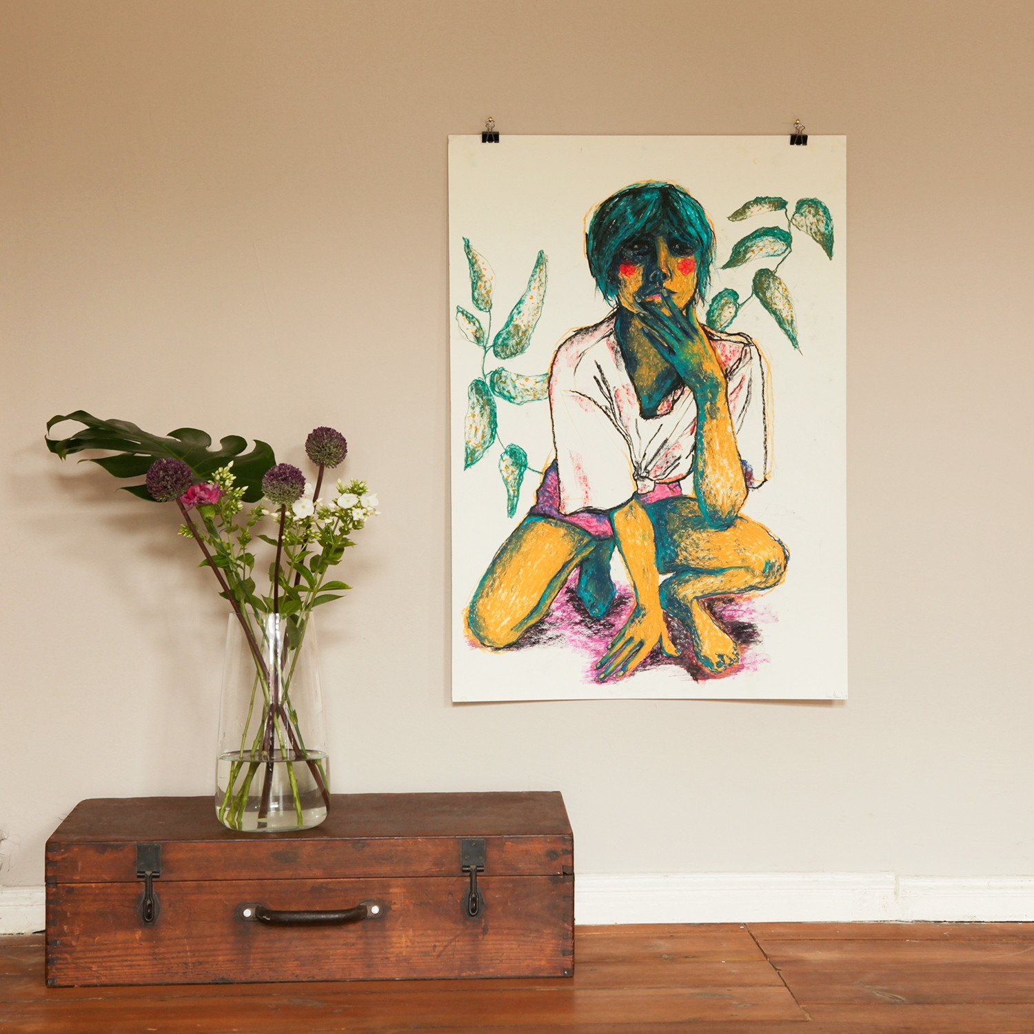 Irina Mmur Waiting for things to happen, 2021 Material Öl-Pastell auf 250gr Papier Auflage 1 Maße 59,4 x 84,1cm UNIKAT vorderseitig signiert und datiert Details zum Rahmen Handgefertigter Ahorn-Holzrahmen, gewachst und gebeizt, Außenmaße ca. 90,5 x 65,8 cm, Normalglas, inkl. Distanzleiste und Aufhängung Die neue Art, Kunst zu kaufen Handverlesene, exklusive Editionen Limitierte, signierte Auflagen Top-KünstlerInnen und Rising Stars Schnell registrieren, um Preis und Verfügbarkeit zu sehen. Jetzt kostenlos Mitglied werden Bereits Mitglied? Über das Werk Einem Klassiker der Gattung Malerei nähert sich die Künstlerin Irina Mmur auf immer neue Weise: dem Selbstporträt. In den drei Unikaten „Close on, close off“, „Waiting for things to happen“ und „Hold me carefully and see my inner dreams“ – alle 2021 entstanden – lassen sich an Körperhaltung, Kleidung und Bildfokus ganz unterschiedliche Situationen ablesen. Wobei vor allem die Bildtitel Aufschluss über emotionale Zustände geben, die wir sonst nur erahnen können. Die Werke lassen sich beschreiben als feministische Selbstbefragungen, die gleichermaßen behutsam wie selbstbewusst sind. Über die Künstlerin „The main component of my work is interaction between reality, subconsciousness and intuitive conversation with the image at the moment of creation“, schreibt die Malerin Irina Mmur in ihrem künstlerischen Statement. Die Entstehung des Kunstwerks sei ein intimer Moment des Eintauchens in eine Fantasiewelt, geprägt von Fragilität, Emotionen, Gefühlen, Neugierde, Sexualität und Ängsten, aber auch voller Power, sagt sie, und ordnet ihre Arbeiten dem figurativen Symbolismus zu. In Riga geboren (*1987), aufgewachsen in Berlin, studierte Mmur zunächst Grafikdesign im Lette Verein Berlin. Seit 2018 konzentriert sich die Malerin und Illustratorin vorrangig auf die Bildende Kunst. Ausstellungen (Auswahl) Werke von Irina Mmur waren 2022 in der Gruppenausstellung „never mind the burnout“, kuratiert von Katharina Schilling und Jim Avignon, im Haus am Lützowplatz in Berlin zu sehen. Im Jahr zuvor stellte sie in der Gruppenschau „Pavillon Russe“ in der Berliner Haze Galerie aus. Als „Pandemic Healing Arts“-Stipendiatin nahm Mmur zudem 2020 an der Ausstellung „Widerkunst“ auf dem Holzmarkt, Berlin, teil. Lesenswerte Artikel / Links Webseite von Irina Mmur Instagram-Account der Künstlerin Mehr Kunst entdecken Andrew Moore Cuba, 'Casa de verano, El Vedado', 1999/2012 Salvador Dalí Les Amourex – The Kingdom, 1980