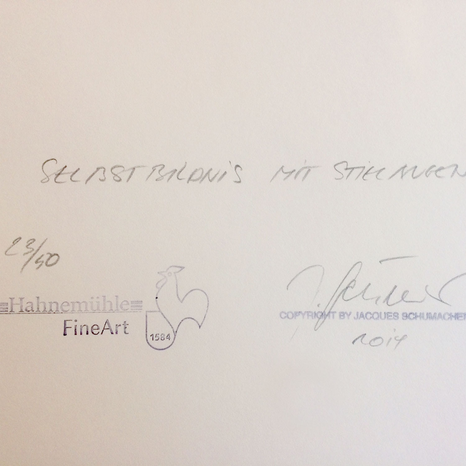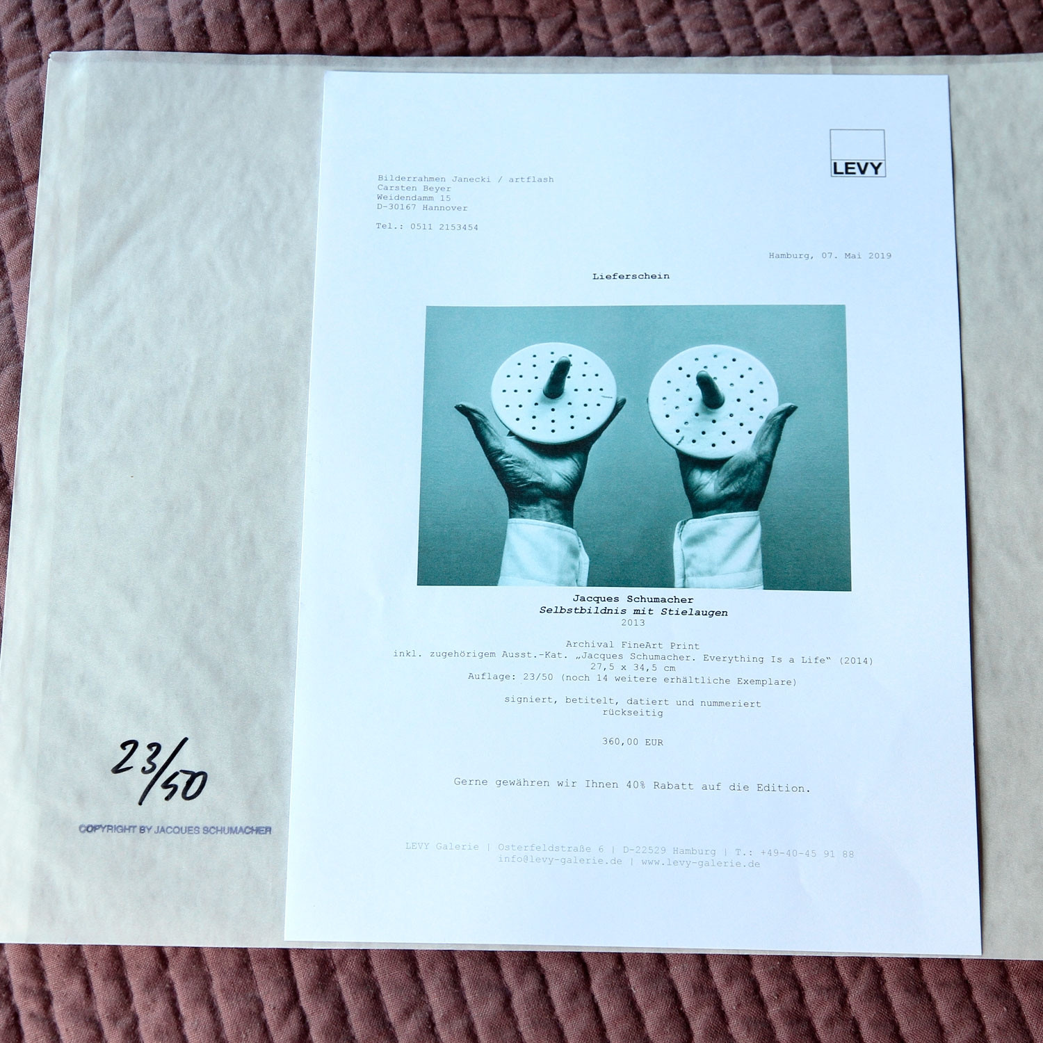 Jacques Schumacher Selbstbildnis mit Stielaugen, 2013 Material Archival Fine Art Print Herstellungsmethode rückseitig signiert, nummeriert und datiert Auflage 50 Maße 27,5 x 34,5 cm Inkl. zugehörigen Ausstellungskatalog „Jacques Schumacher. Every Thing Is A Life“ (2014) Details zum Rahmen Handgefertigter schwarz lackierter Natur-Ahornholzrahmen, inkl. entspiegeltem Museumsglas (Mirogard), Außenmaße ca. 44,6 x 37,3 cm. Inkl. rückseitiger Hängeleiste, staubdicht verschlossen. Die neue Art, Kunst zu kaufen Handverlesene, exklusive Editionen Limitierte, signierte Auflagen Top-KünstlerInnen und Rising Stars Schnell registrieren, um Preis und Verfügbarkeit zu sehen. Jetzt kostenlos Mitglied werden Bereits Mitglied? Anfrage senden Über die Edition Glaubt man dem Titel dieser fotografischen Arbeit, handelt es sich bei ihr um ein Porträt des Künstlers. „Selbstbildnis mit Stielaugen“ (2013) zeigt zwei Hemdärmel, aus denen Hände in die Höhe ragen, die Daumen sind abgespreizt, die Zeigefinger nach vorne, zum Betrachter gerichtet. Sie ragen jeweils aus einer weißen, löchrigen Scheibe heraus. Doch diese Bildbeschreibung fasst das Wesen der Fotografie nicht annähernd: Das Gesicht des Fotografen wird durch Hände und Gestik ersetzt ‒ die Daumen sind die Ohren, die Zeigefinger die langgezogenen Pupillen und die Lochscheiben die riesigen Augen eines unwirklichen Gesichtes. Diese Fotografie ist tatsächlich ein Selbstporträt des Künstlers, aber nicht im offensichtlichen Sinne einer realistischen Darstellung. Vielmehr ist die Bildidee das eigentliche Selbstbildnis. Denn Schumacher ist als Fotograf ein Virtuose der Verfremdung und Neukomposition der Dinge. „Every Thing Is A Life“ bestätigt auch in dieser Edition das Motto seiner Kunst. Über den Künstler Jaques Schumacher hat in der Porträt-, Akt,- Mode- und Lifestyle-Fotografie Karriere gemacht. Als freier Fotograf ist er zeitgenössischer Dadaist, erweckt tote Dinge und rückt sie in ein neues Licht. Seine Bilder überraschen und verwirren, sie sind rätselhaft und humorvoll. Schumacher wurde 1933 in Buitenpost, Holland, geboren. Seit 1963 arbeitet er von Hamburg aus als selbständiger Fotograf. 2001/02 hatte er eine Gastprofessur an der Universität der Künste Berlin inne.„Every Thing Is A Life“, so lautet der Titel von seinem jüngsten Bildband, herausgegeben 2014 beim Kerber Verlag. Mehr Kunst entdecken Jack Pierson YELLOW ROAD, 2018 Michael Sailstorfer P 99, 2016 Walter Dahn Édition Séparée Nr. 8 (Cowboy), 1997