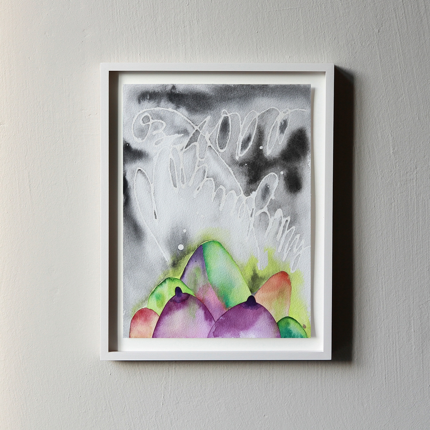 Als „Shadowland (signature edition)“ bezeichnet Jagoda Bednarsky ihre zehn – immer wieder anders kolorierten – Aquarelle, die alle Unikatcharakter besitzen. „Shadowland“ („Schattenland“), so heißt auch eine ganze Werkserie der Berliner Malerin, in der sie sich mit dem Bild der Frau und dem Muttersein auseinandersetzt. Den Titel hat sie einer 1919 in New York erstmalig erschienenen gleichnamigen Kulturzeitschrift entlehnt. Mal zeigt Bednarsky den konkreten Stillmoment ‒ Baby und Brust in Nahaufnahme ‒, mal wird die weibliche Brust zum ‚Schutzschirm‘ in einer Regenszenerie oder, wie in diesen Acrylarbeiten, zum aufragenden Gebirge inmitten einer Hügellandschaft. Die Realität hält Einzug in Bednarskys Werken – der kunstvoll geschwungene Schriftzug ihres Namens am Himmel deutet an, dass es in ihren Arbeiten auch um eigene Erfahrungen geht. Doch das Abstraktionsmoment ist stets stark genug, um assoziative Reflexionsprozesse wie jene über den weiblichen Körper oder tradierte Rollenklischees in Gang zu setzen. Selbstbewusstsein, Eigensinn und Ironie sprechen aus diesen genauso sinnlich-poetischen wie fantastisch-witzigen Werken. Text: Cara Wuchold