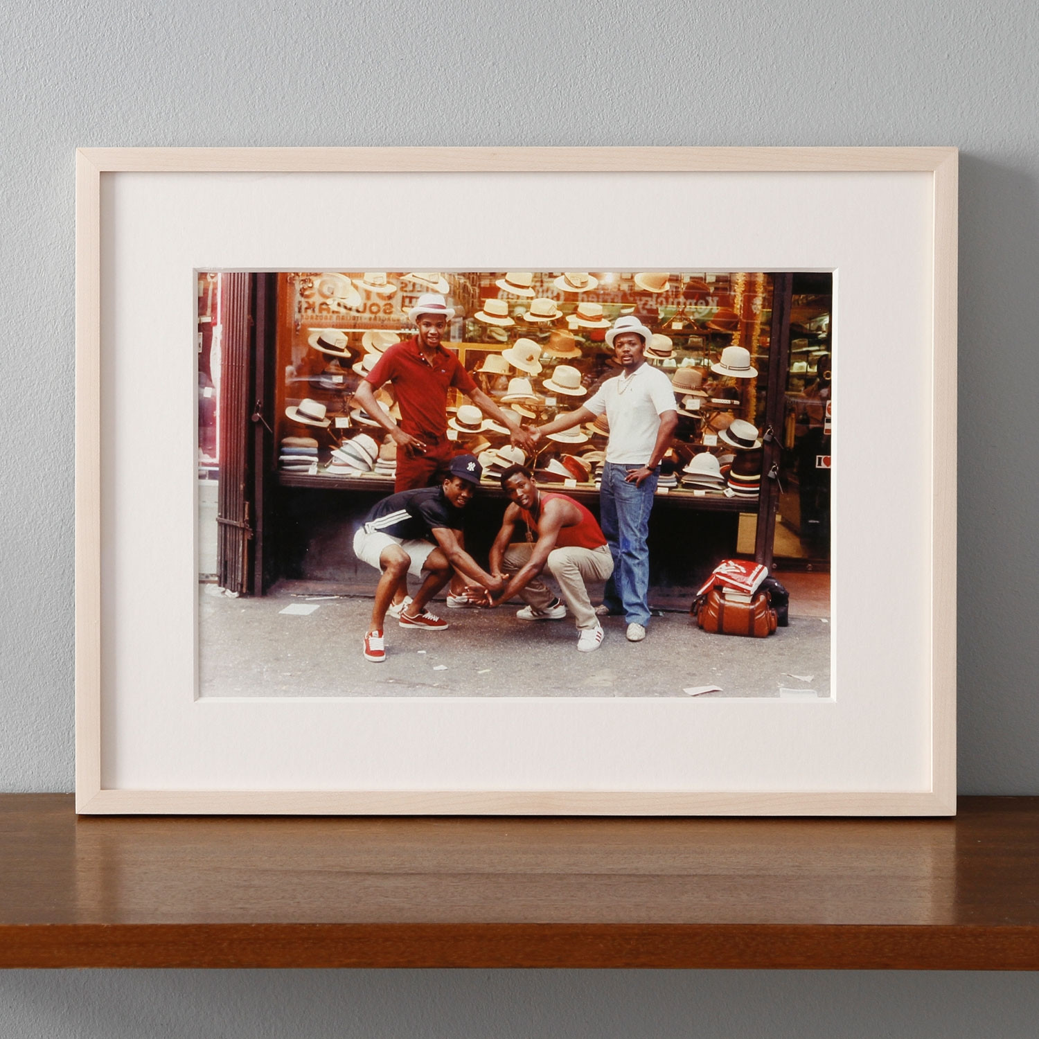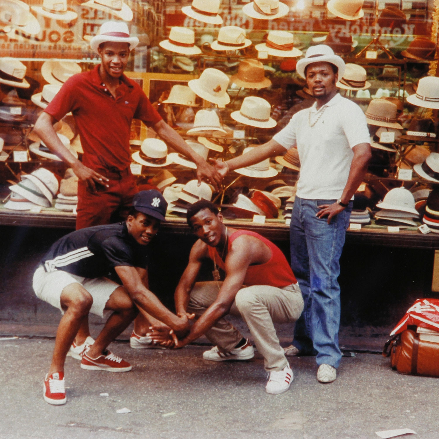 „Street Photographers of Times Square“ (1982) ist ein Gruppenporträt von Jamel Shabazz aus der Anfangszeit des Fotografen. Vier junge Afroamerikaner posieren vor dem mit Kopfbedeckungen aller Art (Hüte, Melonen, Schirmmützen etc.) vollgestopften Schaufenster eines Hutladens. Vermutlich befindet sich das Geschäft in der Nähe des New Yorker Times Square, zumindest suggeriert dies der Titel. Hier ist weniger an eine Momentaufnahme der Straßenfotografie im klassischen Sinn zu denken, sondern vielmehr an die Inszenierung eines Freundschaftsbildes in einer für die damalige Zeit eher ungewöhnlichen Situation.