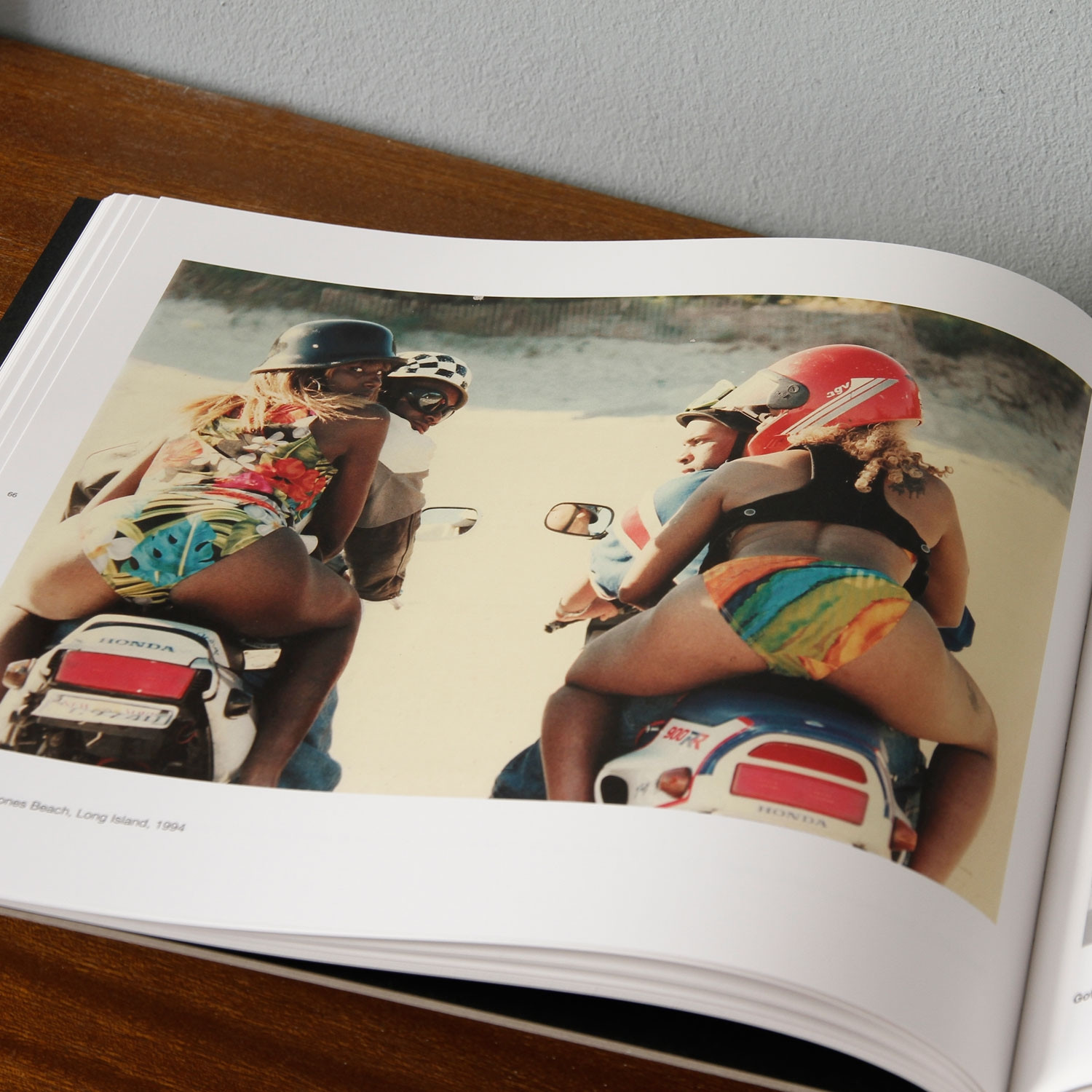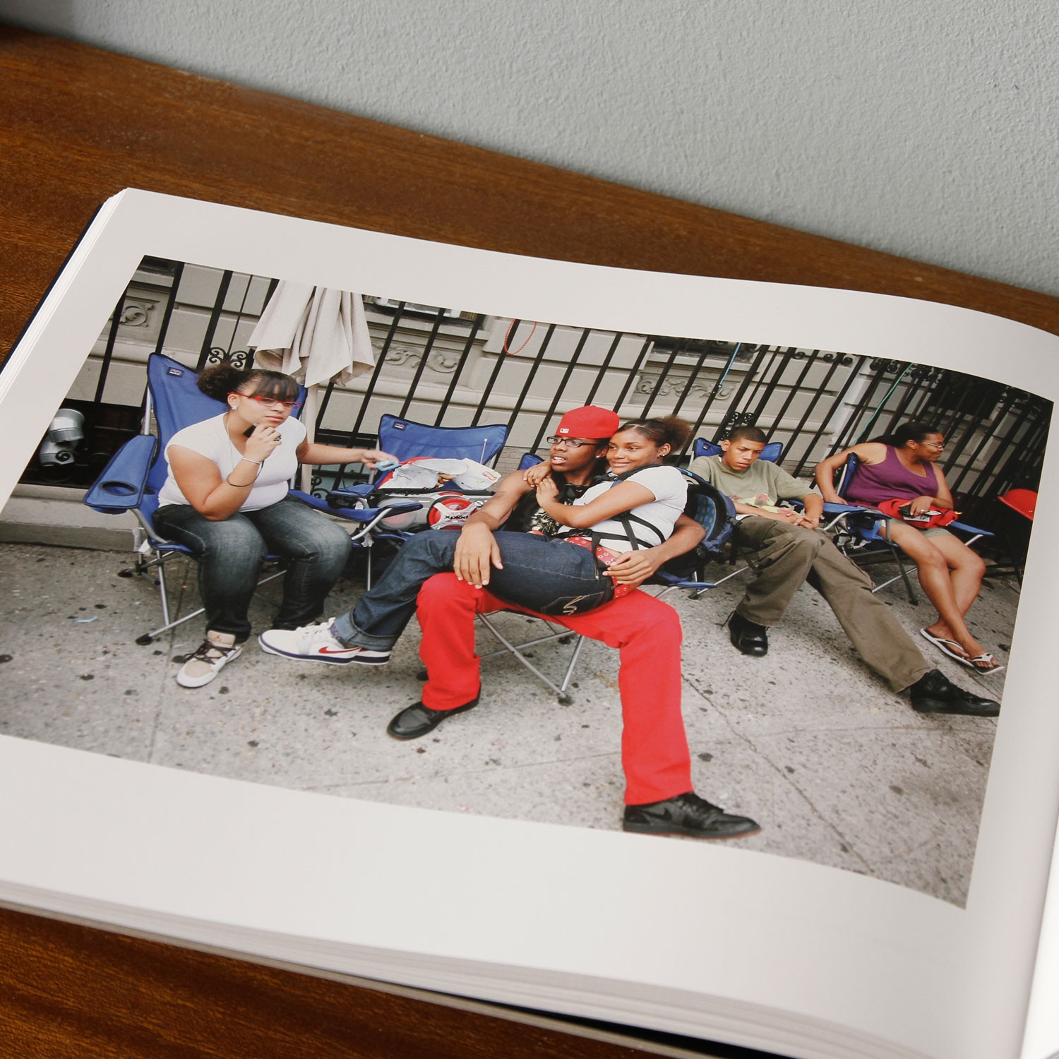 Das Bild ruft: Uns geht’s gut. Wir sind jung, glücklich, sportlich, schön und halten zusammen. Nur gibt es da ein Detail, das die ideale Inszenierung des Gruppenporträts stört: Die Tasche aus Leder, die Einkaufstüten aus Plastik am rechten Bildrand lassen vermuten, dass diese so perfekten Posen wohl doch einer im Moment entstandenen Idee zu verdanken sind. Vermutlich sind die Jungs gerade am Hutgeschäft vorbeigekommen, haben sich zwei weiße Panamahüte ausgeliehen, um dieses sympathische Foto zu schießen. Auch Straßenfotografie, so beweist es uns Shabazz, ist in der Lage, die Hochglanzästhetik der Werbung aufzugreifen, nur eben spontaner, mit einem sensiblen Gefühl für eine positive Lebensart.