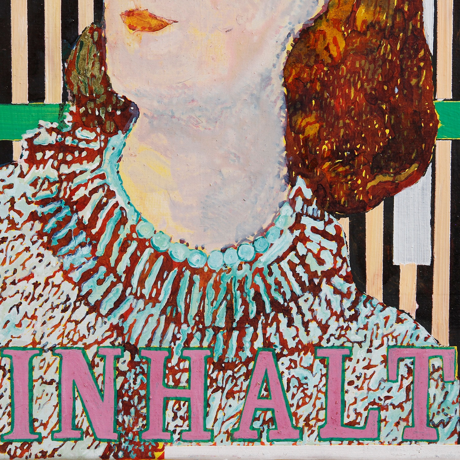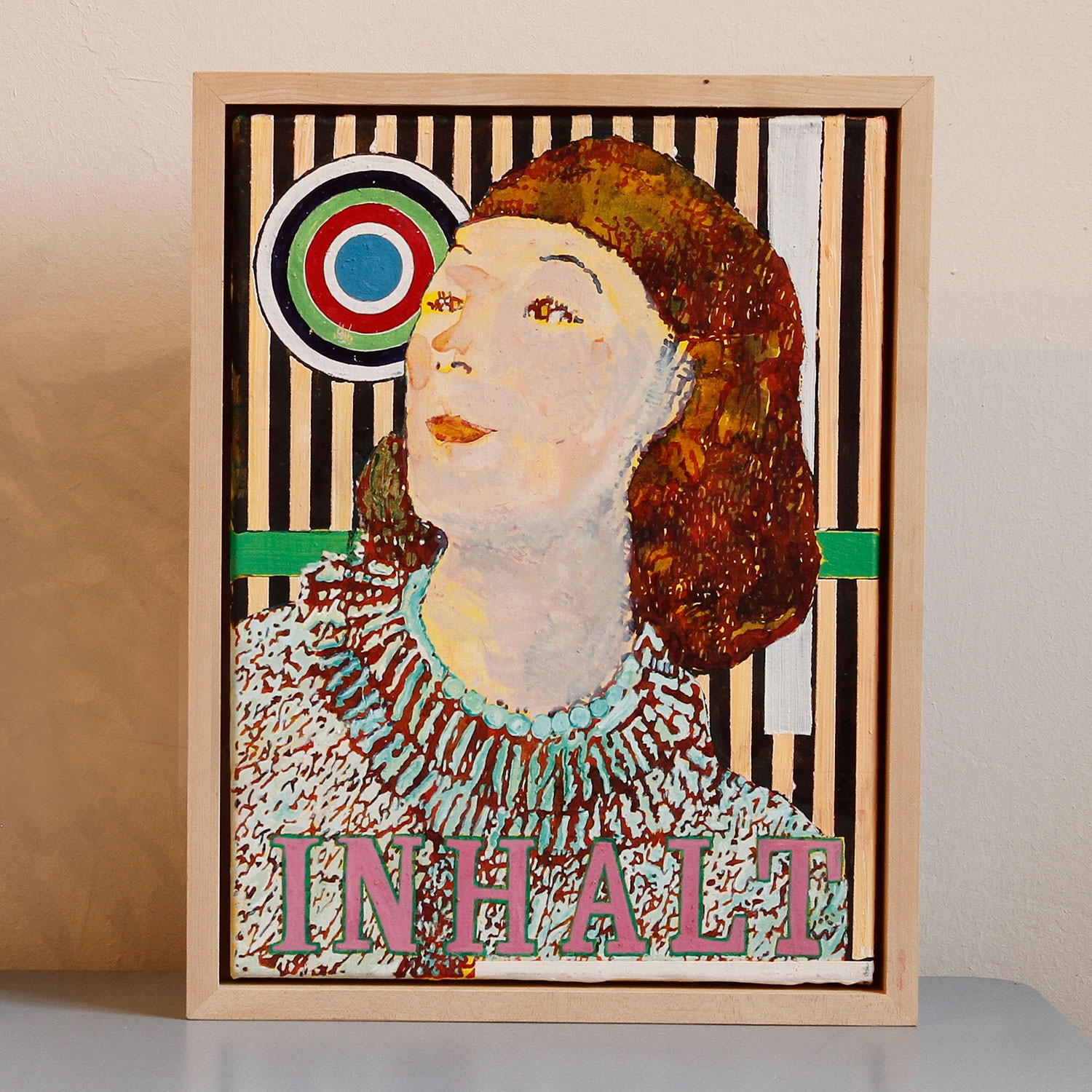 Muches Malerei dieser frühen Zeit zeichnet sich aus durch eine gesteigerte Buntheit, den gleichwertigen Einsatz von Texten und Bildern, eine besondere Art der Figurendarstellung und einen von der Architektur inspirierten Bildaufbau. Dies gilt auch für seine Gemälde „Bleich“, „Oxy“ und „Inhalt“. Sie zeigen jeweils eine Frau, die uns entweder direkt anschaut oder in eine unbestimmte Ferne blickt. Alle drei Darstellungen vermitteln Zuversicht und Selbstbewusstsein. Sind diese Frauen Kämpferinnen und wenn ja, wofür kämpfen sie? Die Farbpalette ist breit angelegt. Farben und Formen strukturieren nicht nur den Hintergrund, sondern greifen auch in die figurative Darstellung ein, durchkreuzen und überschneiden sie. Dieser Bruch mit den Konventionen der Porträtmalerei ist ‚Muche pur’! Darüber hinaus verwendet der Künstler mit dem Wort „Inhalt“ das Medium der Schrift, das sich jedoch einpasst in die malerische Gesamtgestaltung.