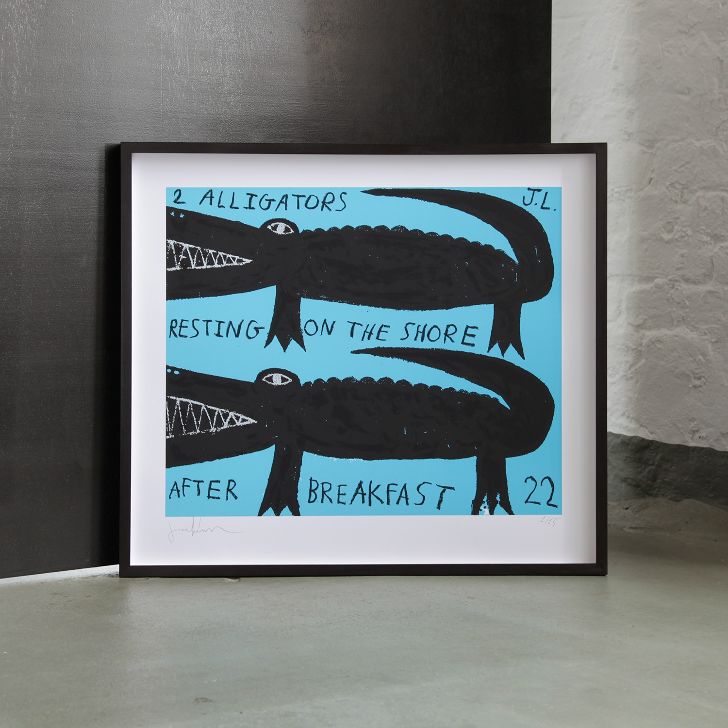 Joachim Lambrechts 2 alligators resting on the shore after breakfast - blue, 2021/2022 Material 4-farbiger Siebdruck auf 300gr Büttenpapier, handschriftlicher Text mit Ölkreide Herstellungsmethode Eine Edition exklusiv für artflash Auflage 15 Maße Blattmaß: ca. 58 x 65 cm Printmaß: ca. 55 x 62 cm Auflage 15 + 5 AP vorderseitig signiert & nummeriert Details zum Rahmen Handgefertigter, schwarz gebeizter und gewachster Ahorn-Holzrahmen, 10mm Distanzleiste, inkl. Normalglas, Außenmaße: ca. 60,2 x 67,2 cm, inkl. rückseitiger Aufhängung, staubdicht verschlossen. Die neue Art, Kunst zu kaufen Handverlesene, exklusive Editionen Limitierte, signierte Auflagen Top-KünstlerInnen und Rising Stars Schnell registrieren, um Preis und Verfügbarkeit zu sehen. Jetzt kostenlos Mitglied werden Bereits Mitglied? Anfrage senden Über die Edition „2 alligators resting on the shore after breakfast“ heißt es titelgebend auf dem exklusiv für artflash entstandenen Siebdruck, der in sandigem Gelb oder pastelligem Blau erhältlich ist. Diesen Satz hat Joachim Lambrechts nach dem Druck mit Ölkreide nebst der Signatur händisch ergänzt. Er integriert häufig Text, in dem sich der Humor seiner Arbeiten widerspiegelt und der beschreibt, was wir vermeintlich sehen, der ihm aber auch als formales Strukturierungselement dient. „Worte halten das Gemälde oft in der Balance“, sagt der Künstler, und manchmal seien sie fast so wichtig wie das Motiv selbst. Das für Lambrechts’ Werk typische Zweidimensional-Flächige der Krokodile unterstreicht noch einmal die Unbefangenheit, die dem Entstehungsprozess zugrunde liegt. Und seine Strategie geht auf: Uns bleibt gar nichts anderes übrig, als in der Serigrafie zwei frühstücksgesättigte Krokodile an der Küste zu sehen und ihren Anblick schmunzelnd zu genießen! Über den Künstler Joachim Lambrechts arbeitet ohne Skizzen ‒ anders als im Falle der riesigen Murals, die der Künstler, aus der Graffiti-Szene kommend, als Auftragsarbeiten in ganz Europa realisierte, bevor er sich ausschließlich der Leinwand verschrieb. In der Spontaneität findet der 1986 in Antwerpen geborene Maler die nötige Freiheit für seine Kreativität. Der frühere Drummer vergleicht seinen Umgang mit dem Pinsel mit dem Einsatz von Schlagzeugsticks: einfach freudvoll loslegen! Die Musik ist für ihn bis heute eine große Inspiration. Werke von Joachim Lambrechts sind u.a. Teil der Beth Rudin DeWoody Collection (USA) und der Sammlung von The House of KOKO (London). Ausstellungen (Auswahl) Werke von Joachim Lambrechts werden auf der art Karlsruhe zu sehen sein (7.‒10. Juli 2022). 2021 zeigte die „Allegro“-Ausstellung in der Berliner Niederlassung der Galerie Kristin Hjellegjerde Beispiele seines künstlerischen Schaffens. „Facing the Sun“ hieß die Gruppenausstellung im selben Jahr im Schloss Görne, in der ebenfalls Arbeiten von Lambrechts präsentiert wurden. Lesenswerte Artikel / Links Joachim Lambrechts auf Instagram Künstlerseite bei Galerie Kristin Hjellegjerde, London/Berlin/Nevlunghavn Joachim Lambrechts als Featured Artist des Munchies Art Club Video von Joachim Lambrechts über seine „Allegro“-Ausstellung (2021) Mehr Kunst entdecken Stefan Heyne Ohne Titel (Nr. 94 + Nr. 131 + Nr. 135), 2022 Heinrich Heidersberger VW Bad Wolfsburg, 1961, 1961 / 2022 Julio Le Parc Alchimie, 2018 Joachim Lambrechts 2 alligators resting on the shore after breakfast - yellow, 2021/2022 Bianca Kennedy Serie "Portraits of Taking a Bath in Movies": Curly Sue, 2022 Bianca Kennedy Serie "Portraits of Taking a Bath in Movies": Euphoria 3, 2022
