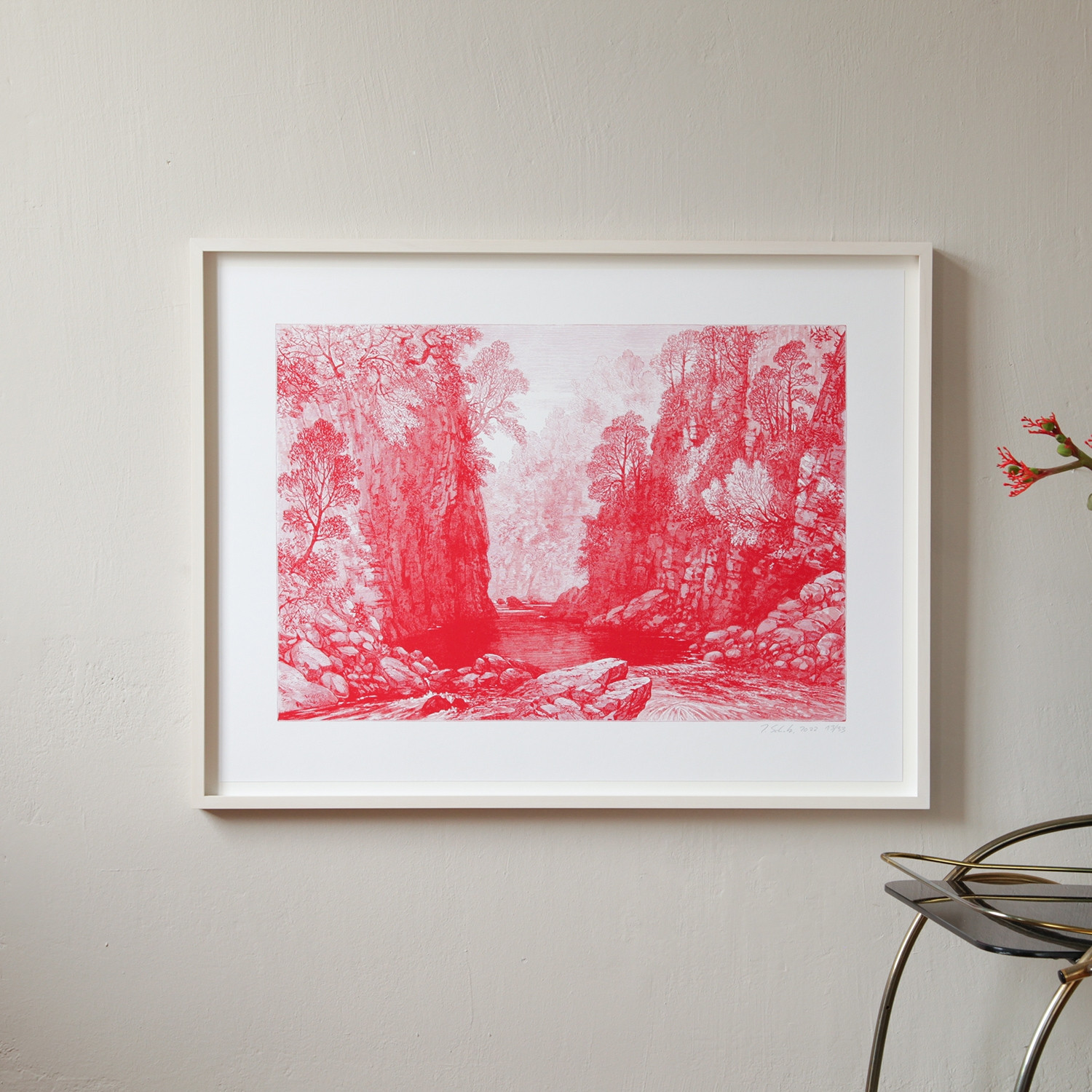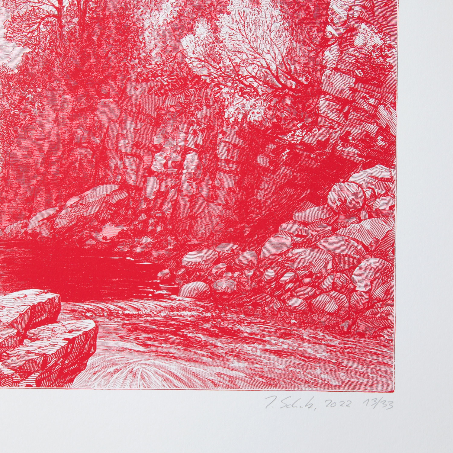 Josef Schulz Aus der Serie „Terra Incognita“ (Rot), 2022 Material Einfarbiger Siebdruck auf 300g Hahnemühle Papier Auflage 33 Maße Papierformat 60 x 80 cm Auflage 33 signiert und nummeriert Details zum Rahmen Handgefertigter Ahorn-Holzrahmen, weiß lasiert und gewachst, Außenmaße ca. 66,2 x 86,2 cm, inkl. Distanzleiste, hochgestellt montiert, inkl. Normalglas und rückseitiger Aufhängung. Auf Wunsch auch mit Museumsglas. Die neue Art, Kunst zu kaufen Handverlesene, exklusive Editionen Limitierte, signierte Auflagen Top-KünstlerInnen und Rising Stars Schnell registrieren, um Preis und Verfügbarkeit zu sehen. Jetzt kostenlos Mitglied werden Bereits Mitglied? Über die Edition Eine ganze Serie hat der Fotograf Josef Schulz der „Terra Incognita“ gewidmet. Er nähert sich diesen einst unbekannten, noch nicht kartierten Landmassen über Illustrationen aus Publikationen wie „Brehms Tierleben“, „Illustrated London News“ und „L’Universe Illustre“. Populärwissenschaftliche Bücher und Zeitschriften aus dem 19. Jahrhundert, die den Menschen in vortouristischen Zeiten die Welt nach Hause brachten, in Form vermeintlich realitätsgetreuer Abbildungen, deren Wahrheitsgehalt kaum jemand überprüfen konnte. Josef Schulz sitzt dieser Illusion nicht auf, legt den Entstehungsprozess offen. Er vergrößert die Motive auf mindestens das Zwanzigfache, so dass die einzelnen Striche der Radiernadel sichtbar werden, spielt mit Farbe, invertiert. Die in Rostrot getauchte felsige Flußlandschaft wird so zum Prototypen für einen Sehnsuchtsort, der sich so nur erträumen lässt und mindestens genauso viel wie über die ferne Welt, über uns Menschen verrät. Über den Künstler Seine Vorliebe für industriell geprägte Landschaften teilt der Fotograf Josef Schulz (*1966) mit einem seiner früheren Professoren an der Düsseldorfer Kunstakademie: Bernd Becher. Der dokumentierte gemeinsam mit seiner Frau Hilla Becher Bergwerke, Fördertürme, Gasbehälter, Hochöfen, Kraftwerke, Kühltürme, Getreidesilos und Lagerhäuser in Europa und Nordamerika. Josef Schulz – später Meisterschüler von Thomas Ruff – wurde bereits mehrfach ausgezeichnet, u.a. als Europäischer Architekturfotograf des Jahres 2001 und als CityARTist NRW 2020. Seine Werke sind in Ausstellungen weltweit zu sehen und gehören zum Bestand zahlreicher Sammlungen, darunter die Art Collection Deutsche Börse, die UBS Art Collection und das Aarhus Art Museum. Ausstellungen (Auswahl) 2023 nimmt Josef Schulz teil an der Artist-in-residence, Sulfur Studios, Savannah, USA. Beim 13. Festival für zeitgenössische Fotografie „OFF Bratislava“ 2022 stellte Josef Schulz unter dem Titel „Passage“ in der FOG Gallery aus. Ebenfalls 2022 zeigte die Galerie Fiebach & Minninger in Köln mit „Terra incognita“ eine Soloschau des Fotografen, zudem waren Werke von ihm in der Gruppenausstellung „Horizon, Interrupted“ in der Garage Rotterdam zu sehen. Im Jahr zuvor, 2021, beteiligte sich Schulz an der Schau „KM 52 ‒ Punto de fuga ‒ Vanishing Point“ im Centro de Arte UNLP im Rahmen der BIENALSUR 2021 in Buenos Aires. Lesenswerte Artikel / Links Webseite von Josef Schulz Josef Schulz bei Galerie Fiebach & Minninger, Köln Mehr Kunst entdecken Gert und Uwe Tobias o.T. (Rot), 2022 Gert und Uwe Tobias o.T. (Blau), 2022 Tony Clough 120 Horizontal Stripes in Slightly Different Colors, 2022 Candida Höfer Elbphilharmonie Hamburg Herzog & De Meuron Hamburg VIII 2016, 2020 Johannes Popp Sequenz 89, 2023