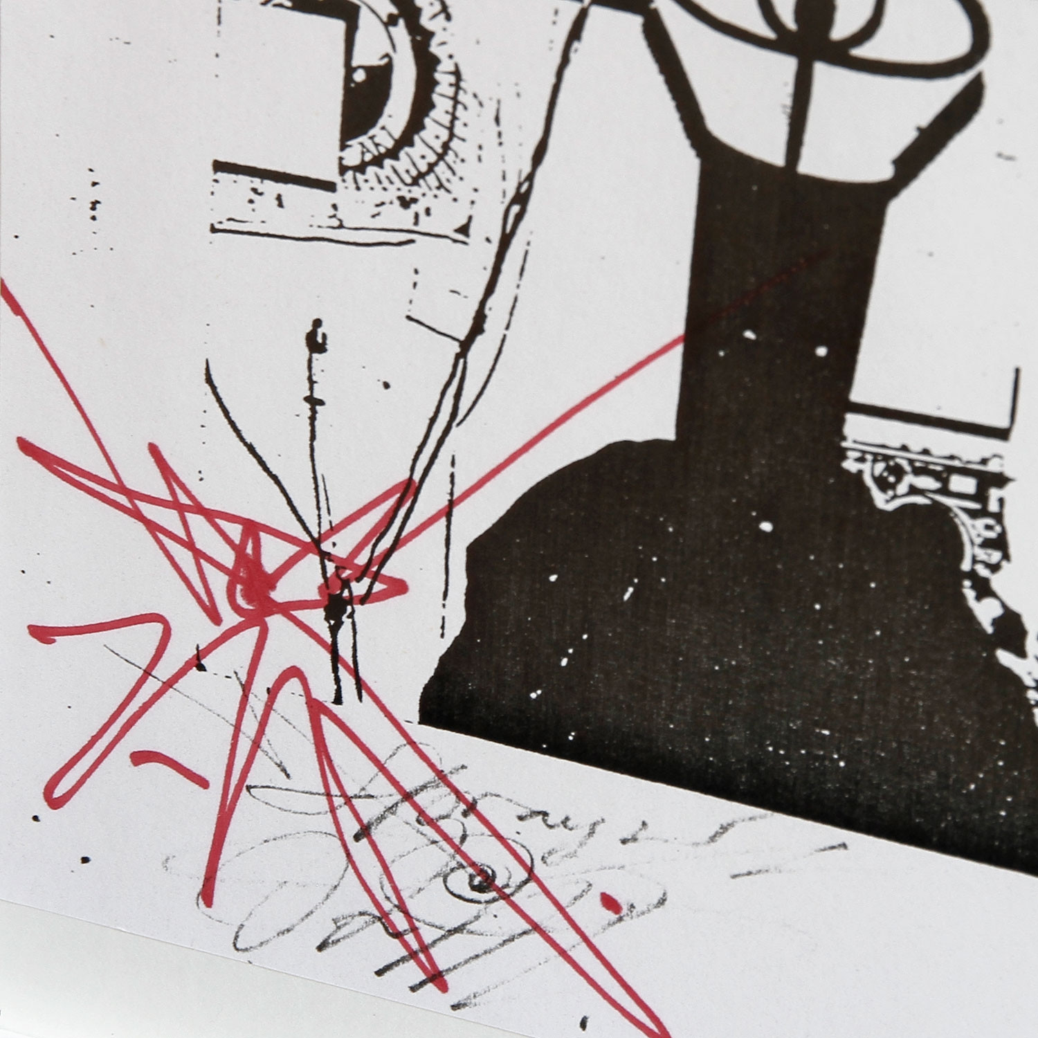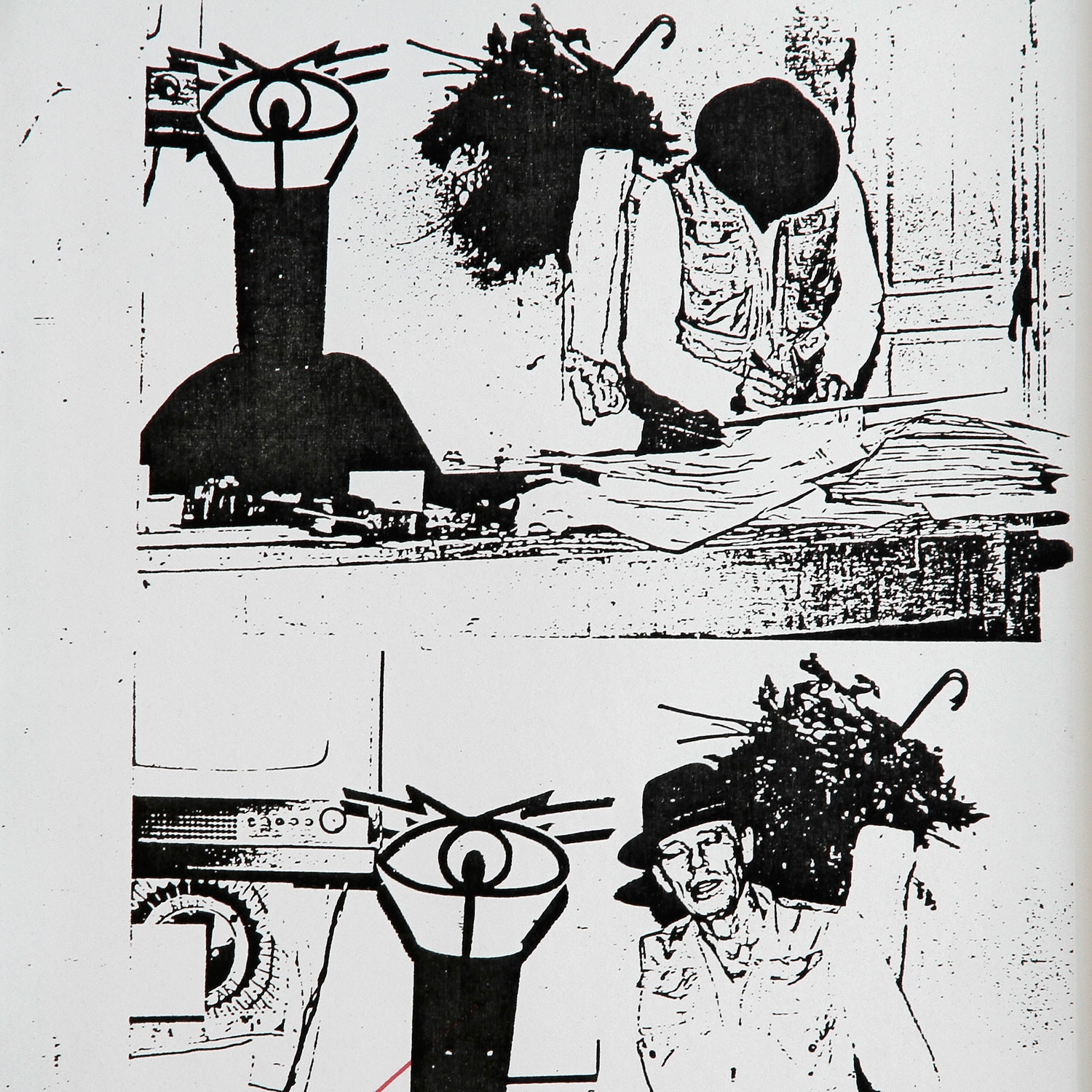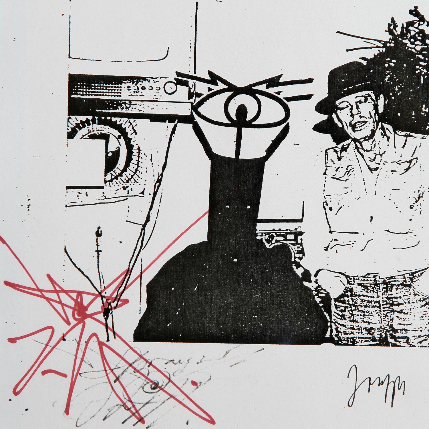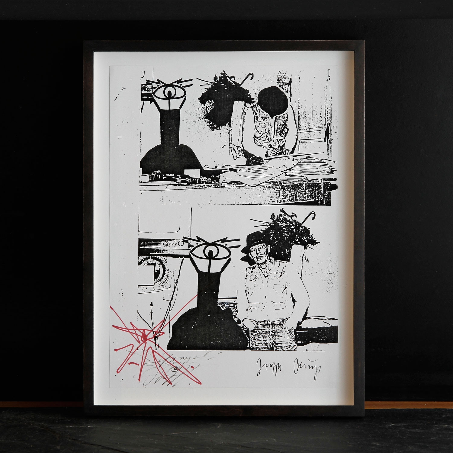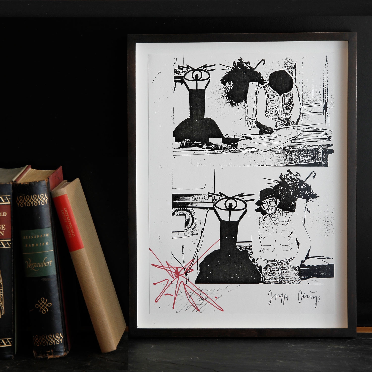 Die Edition „Wiedergeborene Höhlenmenschen“ ist ein berührendes Dokument dieser Freundschaft – und nimmt ein Stück Zeitgeschichte vorweg: Naegeli selbst trug in Riehen als eine Art Maske eine schwarze Kerze mit zwei Sehschlitzen über dem Kopf – wie die Figur neben Beuys. Über diesem schweben Filzumhang und Stock wie Beuys’ eigener Schatten und mit ihm die Erinnerung an die berühmte Kojoten-Performance des Künstlers in New York. Naegeli hat das handsignierte Blatt mit einer seiner unverwechselbaren Gestalten versehen, die er mit wenigen Strichen zu zauberhaftem Leben erweckt.