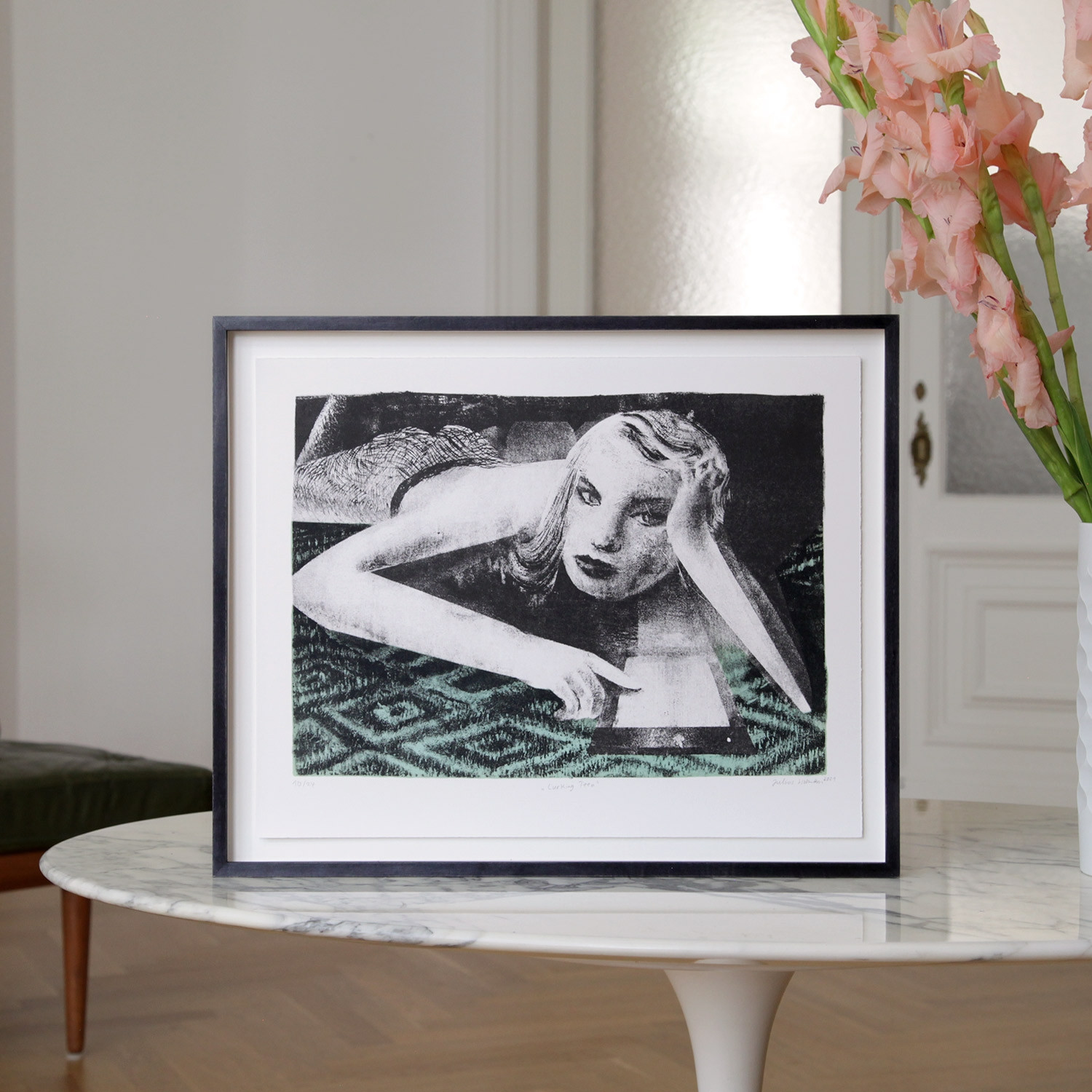 Julius Hofmann Lurking Teen, 2021 Material Lithografie Herstellungsmethode gedruckt bei Steinwerk Leipzig Auflage 24 Maße Blattgröße 42,5 x 33 cm, Motivmaß: 38 x 26,5 cm Auflage 24 signiert + nummeriert Details zum Rahmen Handgefertigter Ahorn-Holzrahmen, schwarz/shabby gebeizt, gewachst, inkl. 8mm Distanzleiste, Blatt ist hochgestellt montiert, Normalglas Außenmaße: ca. 38,4 x 48,0 cm, mit rückseitiger Aufhängung. Die neue Art, Kunst zu kaufen Handverlesene, exklusive Editionen Limitierte, signierte Auflagen Top-KünstlerInnen und Rising Stars Schnell registrieren, um Preis und Verfügbarkeit zu sehen. Jetzt kostenlos Mitglied werden Bereits Mitglied? Über die Edition Gelangweilt schaut er uns an ‒ oder eher: durch uns hindurch ‒, der weibliche „Lurking Teen“ von Julius Hofmann, den Finger auf dem Touchpad, den Kopf in die Hand gestützt. Mit geschminkten Augen und Lippen und trotzigem Selbstbewusstsein liegt das Mädchen da im Schein des Displays, ein wenig zu verführerisch, aber ebenso verführbar. Hofmanns Porträt spiegelt nicht nur die Fluidität der Gefühle des Coming of Age. Durch den Verweis auf unser digitales Zeitalter ist dieses klassische Sujet ohne die allgegenwärtige Bilderflut inklusive Selfie-Kultur, Voyeurismus und des Problemfelds sensibler Daten im Hinterkopf kaum mehr zu denken oder heutiger: zu konsumieren. Auf diese Weise schafft der Künstler einen spannenden Spagat und schmuggelt die Komplexität der bildergestützten Gegenwart in die alten, künstlerisch seit jeher bearbeiteten Fragen. Über den Künstler Julius Hofmann, geboren 1983, hat sich nichts weniger vorgenommen, als die Malerei mit digitalen Ästhetiken zu verschränken – und zwar vorwärts und rückwärts. Neben der klassischen Ausbildung als Schüler von Neo Rauch und Heribert C. Ottersbach an der Hochschule für Grafik und Buchkunst in Leipzig sind Video- und Computerspiele als weitere Inspirationsquellen für sein Werk nicht zu übersehen. Am direktesten zeigt sich dies an den an Superheroen angelehnten Figuren in seinen Videofilmen, nicht technisch perfekt, sondern spielerisch zusammengesetzt aus am Kubismus orientierten Formen. Ebenso nimmt uns auch seine Malerei mit in fantastische, nicht selten düstere Welten, wird zur Reflexionsfläche der animierten Bilder. Ausstellungen (Auswahl) Im anlaufenden Oktober 2021 stellt Julius Hofmann bei Althuis Hofland Fine Arts in Amsterdam aus. Zudem waren in diesem Jahr in der Gruppenausstellung „The ORGE.net“ in der Pariser Galerie Suzanne Tarasieve bereits Werke von ihm zu sehen. „Will of the Gods is Great Power‟ hieß 2020 die Soloausstellung des Künstlers in der Galerie Kleindienst auf dem Gelände der Spinnerei Leipzig. Lesenswerte Artikel / Links Webseite von Julius Hofmann Instagram-Account des Künstlers 2019 erhielt Julius Hofmann das Arbeitsstipendium der Bonner Stiftung Kunstfonds „Tagespiegel“-Artikel über die Ausstellung „Colors of Descents“ (2017) in der Leipziger G2 Kunsthalle Mehr Kunst entdecken Olaf Hajek Golden Tear, 2020 Martin Parr Glenbeigh Races, County Kerry, 1983 , 2021 Christo & Jeanne-Claude (Set-Angebot) Over the River I & II, 1994 Tal R Lillen, 2019 Tal R Blomster uden titel, 2019 Tal R Rajasthani poppets , 2019