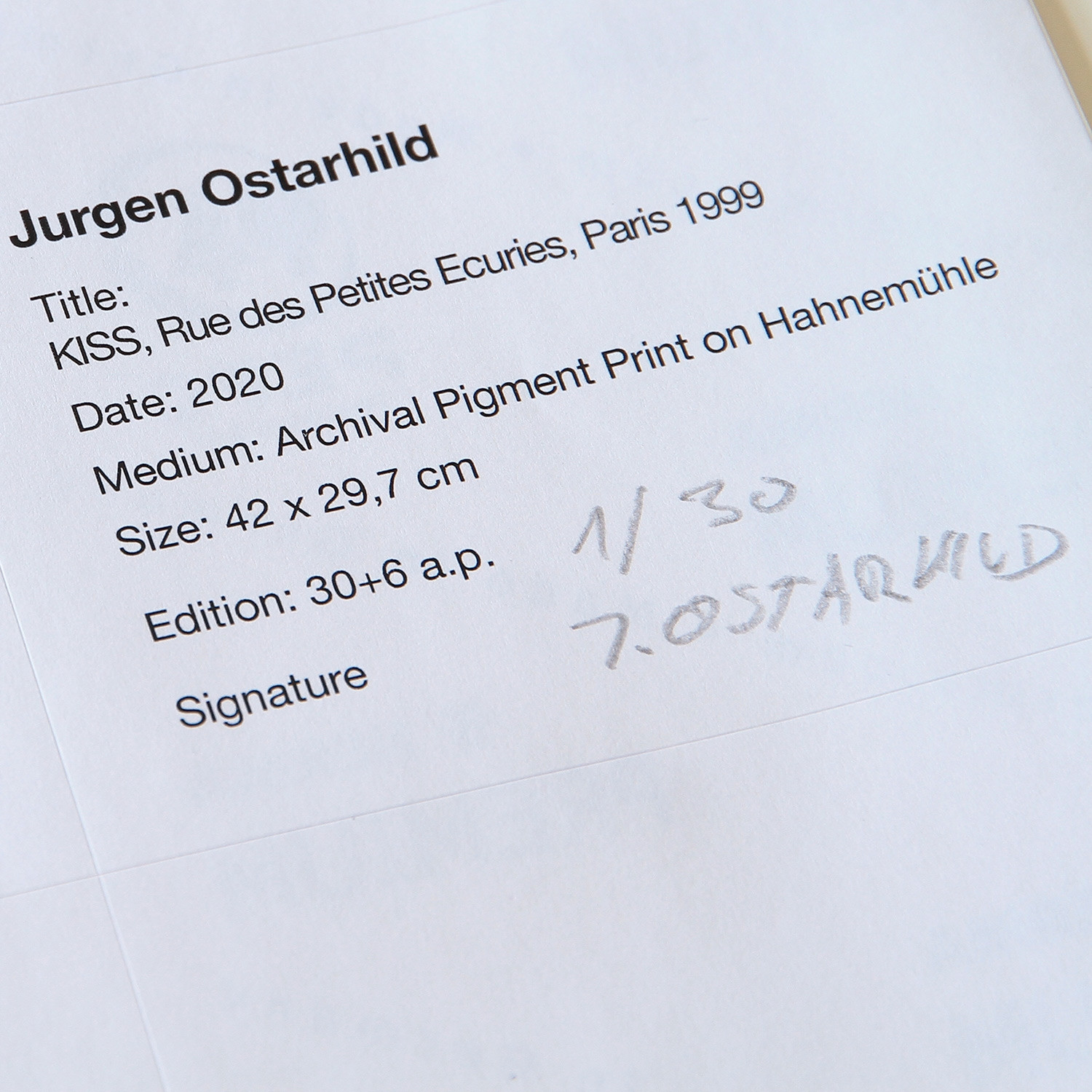 Jurgen Ostarhild KISS, Rue des Petites Ecuries, Paris 1999, c, 1999/2020 Material Archival Fine Art Print Auflage 30 Maße 29,7 x 42 cm Auflage 30 + 6 AP rückseitig signiert + separat auf Label signiert, datiert, nummeriert Details zum Rahmen Handgefertigter weiß lasierter Ahornholz-Rahmen, inkl. 8mm Distanzleiste, Außenmaße: 31,5 x 43,5 cm, inkl. Museumsglas. Inkl. rückseitiger Aufhängung Die neue Art, Kunst zu kaufen Handverlesene, exklusive Editionen Limitierte, signierte Auflagen Top-KünstlerInnen und Rising Stars Schnell registrieren, um Preis und Verfügbarkeit zu sehen. Jetzt kostenlos Mitglied werden Bereits Mitglied? Über die Edition Die 90er Jahre, dieses feier- und tanzwütige, hedonistische Dezennium am Ende des 20. Jahrhunderts ‒ einer, der zu seinem Soundtrack gehört, ist unbedingt Moby. Ihn traf der deutsche Konzeptkünstler Jurgen Ostarhild zum Shooting im Londoner South Kensington 1991, also genau zur richtigen Zeit. Ostarhild fotografierte damals für das in Bezug auf Bildsprache und Typografie richtungsweisende britische Lifestyle-Magazin „i-D“. Er nutzte den Schnappschuss als ernst zu nehmendes Mittel der Fotografie und schuf schonungslose, teils extrem hell ausgeleuchtete Porträts von großer Nähe und Intensität. Die Musiker Jamiroquai und Air, die Modedesigner John Galliano und Nicolas Ghesquière oder das Supermodel Kate Moss, damals zarte 18 Jahre alt, sie alle ließen sich von Ostarhild ablichten. Entstanden sind stilbildende Porträts, die den Geist der 90er Jahre authentisch und ungefiltert in die Gegenwart transportieren. Über den Künstler Seine Karriere begann Jurgen Ostarhild Ende der 70er Jahre als junger Assistent von Oliviero Toscani, später vieldiskutiert für seine kontroversen Benetton-Kampagnen. Im Sommer 1979 wechselte er nach New York, wo er als Studioassistent des britischen Mode- und Porträtfotografen Albert Watson arbeitete, dessen Arbeiten regelmäßig die Cover der „Vogue“ oder des „Rolling Stone“ schmückten. Zurück in Deutschland, gründete Ostarhild 1982 dann sein eigenes Studio. Später weltweit bekannten Fotografen wie Wolfgang Tillmans, Terry Richardson oder Juergen Teller ebnete er den Weg. Er hingegen ist bis heute zu Unrecht nur Insidern ein Begriff, dabei war seine Arbeit genrebildend. So erkannte er die Qualität des Schnappschusses als fotografisches Ausdrucksmittel, brachte die Action in die Modefotografie, schuf einzigartig intime, schonungslose Porträts und fotografierte superclose. Seit 2010 arbeitet Ostarhild an einer Serie von Werken, die den Hexadezimalcode seiner Digitalfotos zeigen. 2019 zeigte er Beispiele daraus in einer Ausstellung am Institut für Konstruktive Kunst und Konkrete Poesie (IKKP) in Rehau. Mit seinen Maschinenporträts, die er seit einiger Zeit auf Instagram veröffentlicht, hat er sich als Fotograf nun selbst abgeschafft. Die Kreativität steckt hier nicht mehr im Bild, sondern im – von ihm selbst erfundenen – Apparat und im Prozess. Die Bildproduktion ist entkoppelt vom Künstler. Algorithmen ermöglichen das Auslösen der Kamera, eine korrekte Belichtung, eine sofortige digitale Veröffentlichung und die Archivierung der produzierten Bilder. Ausstellungen (Auswahl) 2019 stellte Jurgen Ostarhild Arbeiten, die den Hexadezimalcode seiner Digitalfotos zeigen, am Institut für Konstruktive Kunst und Konkrete Poesie (IKKP) in Rehau aus. 2002 zeigte die Galerie Jerome de Noirmont in Paris in Ostarhilds erster Einzelausstellung unter dem Titel „Überbabes“ Porträts von Transgender-Avataren. Mit diesen mithilfe von Photoshop erstellten Collagen hat Ostarhild eine ganz neue Realität erschaffen. Lesenswerte Artikel / Links Webseite des Künstlers Webseite mit einem Überblick über das Schaffen Jurgen Ostarhilds Über Jurgen Ostarhilds fortlaufendes Kunstprojekt mit 144 Fichten in Berlin-Mitte Link zu Jurgen Ostarhilds Maschinenporträts auf Instagram Mehr Kunst entdecken Jurgen Ostarhild MARTIN KIPPENBERGER, bw, Hotel Chelsea, Köln, 1987, 2020 Jurgen Ostarhild JAMIROQUAI Gare du Nord, Paris, 1995, bw, 1995/2020 Jurgen Ostarhild JOHN GALLIANO, Hoxton Square, London, 1992, bw, 1992/2020 Jurgen Ostarhild KATE MOSS, bw, Camber Sands, 1992, bw, 1992/2020 Jurgen Ostarhild NICOLAS GHESQUIÈRE, Rue Oberkampf, Paris, 1991, bw, 1991/2020 Jurgen Ostarhild MOBY, South Kensington, London, 1991, bw, 1991/2020 Jurgen Ostarhild MOBY, South Kensington, London, 1991, 1991/2020 Jurgen Ostarhild KATE MOSS, c, Camber Sands, 1992, 1992/2020