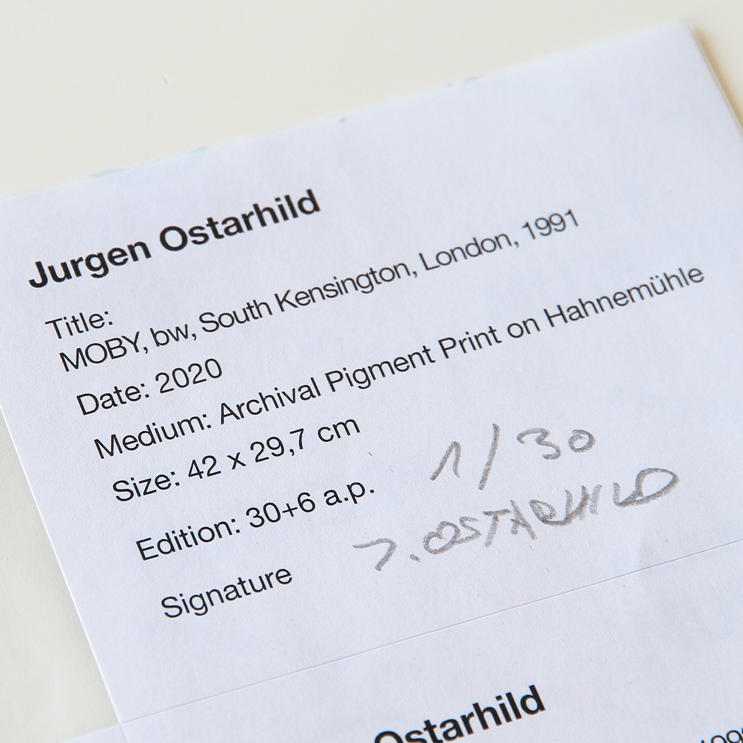 Jurgen Ostarhild MOBY, South Kensington, London, 1991, bw, 1991/2020 Material Archival Fine Art Print Herstellungsmethode rückseitig signiert + separat auf Label signiert, datiert, nummeriert Auflage 30 Maße 29,7 x 42 cm Auflage 30 + 6 AP Details zum Rahmen Handgefertigter schwarz gebeizter und gewachster Ahornholz-Rahmen, inkl. 8mm Distanzleiste, Außenmaße: 31,5 x 43,5 cm, inkl. Museumsglas. Inkl. rückseitiger Aufhängung Die neue Art, Kunst zu kaufen Handverlesene, exklusive Editionen Limitierte, signierte Auflagen Top-KünstlerInnen und Rising Stars Schnell registrieren, um Preis und Verfügbarkeit zu sehen. Jetzt kostenlos Mitglied werden Bereits Mitglied? Über die Edition Die 90er Jahre, dieses feier- und tanzwütige, hedonistische Dezennium am Ende des 20. Jahrhunderts ‒ einer, der zu seinem Soundtrack gehört, ist unbedingt Moby. Ihn traf der deutsche Konzeptkünstler Jurgen Ostarhild zum Shooting im Londoner South Kensington 1991, also genau zur richtigen Zeit. Ostarhild fotografierte damals für das in Bezug auf Bildsprache und Typografie richtungsweisende britische Lifestyle-Magazin „i-D“. Er nutzte den Schnappschuss als ernst zu nehmendes Mittel der Fotografie und schuf schonungslose, teils extrem hell ausgeleuchtete Porträts von großer Nähe und Intensität. Die Musiker Jamiroquai und Air, die Modedesigner John Galliano und Nicolas Ghesquière oder das Supermodel Kate Moss, damals zarte 18 Jahre alt, sie alle ließen sich von Ostarhild ablichten. Entstanden sind stilbildende Porträts, die den Geist der 90er Jahre authentisch und ungefiltert in die Gegenwart transportieren. Über den Künstler Seine Karriere begann Jurgen Ostarhild Ende der 70er Jahre als junger Assistent von Oliviero Toscani, später vieldiskutiert für seine kontroversen Benetton-Kampagnen. Im Sommer 1979 wechselte er nach New York, wo er als Studioassistent des britischen Mode- und Porträtfotografen Albert Watson arbeitete, dessen Arbeiten regelmäßig die Cover der „Vogue“ oder des „Rolling Stone“ schmückten. Zurück in Deutschland, gründete Ostarhild 1982 dann sein eigenes Studio. Später weltweit bekannten Fotografen wie Wolfgang Tillmans, Terry Richardson oder Juergen Teller ebnete er den Weg. Er hingegen ist bis heute zu Unrecht nur Insidern ein Begriff, dabei war seine Arbeit genrebildend. So erkannte er die Qualität des Schnappschusses als fotografisches Ausdrucksmittel, brachte die Action in die Modefotografie, schuf einzigartig intime, schonungslose Porträts und fotografierte superclose. Seit 2010 arbeitet Ostarhild an einer Serie von Werken, die den Hexadezimalcode seiner Digitalfotos zeigen. 2019 zeigte er Beispiele daraus in einer Ausstellung am Institut für Konstruktive Kunst und Konkrete Poesie (IKKP) in Rehau. Mit seinen Maschinenporträts, die er seit einiger Zeit auf Instagram veröffentlicht, hat er sich als Fotograf nun selbst abgeschafft. Die Kreativität steckt hier nicht mehr im Bild, sondern im – von ihm selbst erfundenen – Apparat und im Prozess. Die Bildproduktion ist entkoppelt vom Künstler. Algorithmen ermöglichen das Auslösen der Kamera, eine korrekte Belichtung, eine sofortige digitale Veröffentlichung und die Archivierung der produzierten Bilder. Ausstellungen (Auswahl) 2019 stellte Jurgen Ostarhild Arbeiten, die den Hexadezimalcode seiner Digitalfotos zeigen, am Institut für Konstruktive Kunst und Konkrete Poesie (IKKP) in Rehau aus. 2002 zeigte die Galerie Jerome de Noirmont in Paris in Ostarhilds erster Einzelausstellung unter dem Titel „Überbabes“ Porträts von Transgender-Avataren. Mit diesen mithilfe von Photoshop erstellten Collagen hat Ostarhild eine ganz neue Realität erschaffen. Lesenswerte Artikel / Links Webseite des Künstlers Webseite mit einem Überblick über das Schaffen Jurgen Ostarhilds Über Jurgen Ostarhilds fortlaufendes Kunstprojekt mit 144 Fichten in Berlin-Mitte Link zu Jurgen Ostarhilds Maschinenporträts auf Instagram Mehr Kunst entdecken Jurgen Ostarhild MARTIN KIPPENBERGER, bw, Hotel Chelsea, Köln, 1987, 2020 Jurgen Ostarhild JAMIROQUAI Gare du Nord, Paris, 1995, bw, 1995/2020 Jurgen Ostarhild JOHN GALLIANO, Hoxton Square, London, 1992, bw, 1992/2020 Jurgen Ostarhild KATE MOSS, bw, Camber Sands, 1992, bw, 1992/2020 Jurgen Ostarhild NICOLAS GHESQUIÈRE, Rue Oberkampf, Paris, 1991, bw, 1991/2020