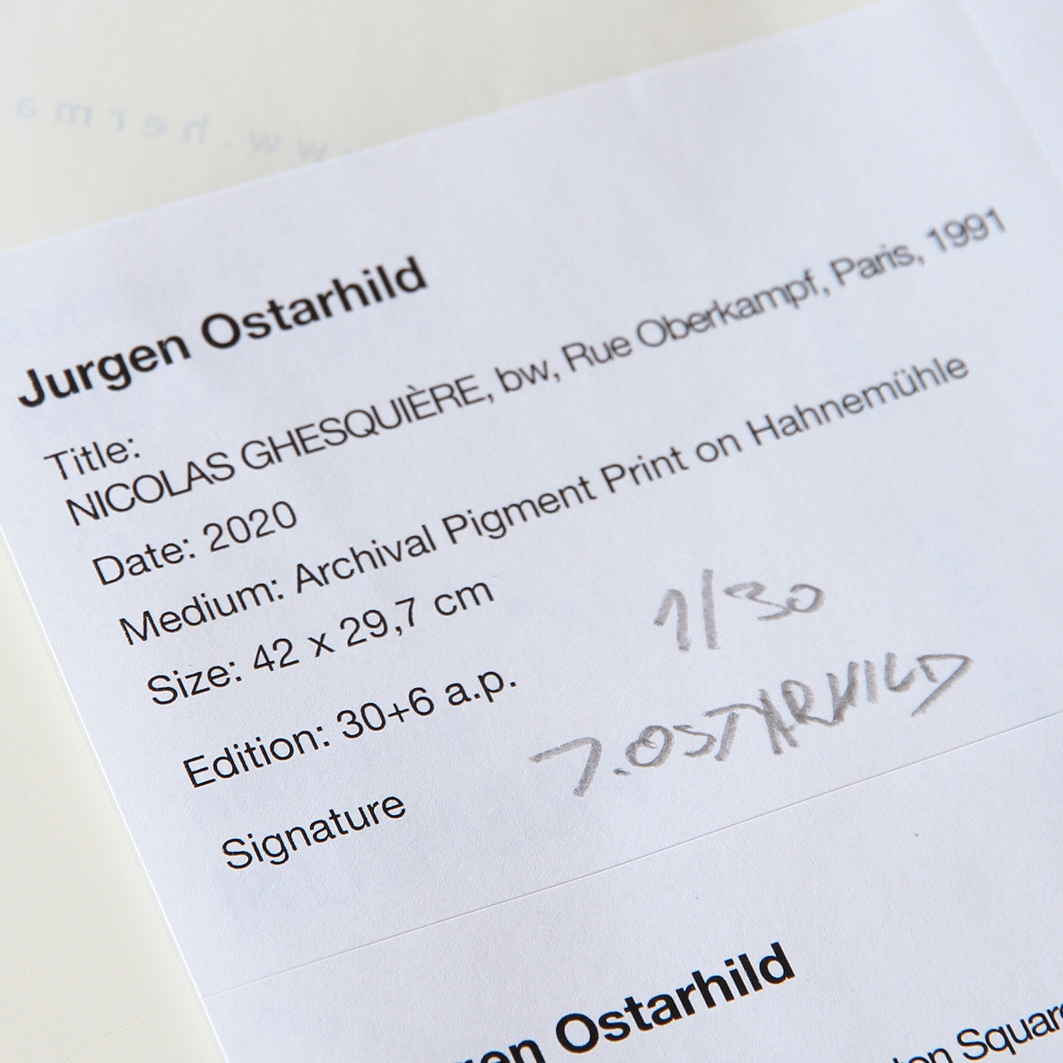 Jurgen Ostarhild NICOLAS GHESQUIÈRE, Rue Oberkampf, Paris, 1991, bw, 1991/2020 Material Archival Fine Art Print Herstellungsmethode rückseitig signiert + separat auf Label signiert, datiert, nummeriert Auflage 30 Maße 29,7 x 42 cm Auflage 30 + 6 AP Details zum Rahmen Handgefertigter schwarz gebeizter und gewachster Ahornholz-Rahmen, inkl. 8mm Distanzleiste, Außenmaße: 31,5 x 43,5 cm, inkl. Museumsglas. Inkl. rückseitiger Aufhängung Die neue Art, Kunst zu kaufen Handverlesene, exklusive Editionen Limitierte, signierte Auflagen Top-KünstlerInnen und Rising Stars Schnell registrieren, um Preis und Verfügbarkeit zu sehen. Jetzt kostenlos Mitglied werden Bereits Mitglied? Über die Edition Die 90er Jahre, dieses feier- und tanzwütige, hedonistische Dezennium am Ende des 20. Jahrhunderts ‒ einer, der zu seinem Soundtrack gehört, ist unbedingt Moby. Ihn traf der deutsche Konzeptkünstler Jurgen Ostarhild zum Shooting im Londoner South Kensington 1991, also genau zur richtigen Zeit. Ostarhild fotografierte damals für das in Bezug auf Bildsprache und Typografie richtungsweisende britische Lifestyle-Magazin „i-D“. Er nutzte den Schnappschuss als ernst zu nehmendes Mittel der Fotografie und schuf schonungslose, teils extrem hell ausgeleuchtete Porträts von großer Nähe und Intensität. Die Musiker Jamiroquai und Air, die Modedesigner John Galliano und Nicolas Ghesquière oder das Supermodel Kate Moss, damals zarte 18 Jahre alt, sie alle ließen sich von Ostarhild ablichten. Entstanden sind stilbildende Porträts, die den Geist der 90er Jahre authentisch und ungefiltert in die Gegenwart transportieren. Über den Künstler Seine Karriere begann Jurgen Ostarhild Ende der 70er Jahre als junger Assistent von Oliviero Toscani, später vieldiskutiert für seine kontroversen Benetton-Kampagnen. Im Sommer 1979 wechselte er nach New York, wo er als Studioassistent des britischen Mode- und Porträtfotografen Albert Watson arbeitete, dessen Arbeiten regelmäßig die Cover der „Vogue“ oder des „Rolling Stone“ schmückten. Zurück in Deutschland, gründete Ostarhild 1982 dann sein eigenes Studio. Später weltweit bekannten Fotografen wie Wolfgang Tillmans, Terry Richardson oder Juergen Teller ebnete er den Weg. Er hingegen ist bis heute zu Unrecht nur Insidern ein Begriff, dabei war seine Arbeit genrebildend. So erkannte er die Qualität des Schnappschusses als fotografisches Ausdrucksmittel, brachte die Action in die Modefotografie, schuf einzigartig intime, schonungslose Porträts und fotografierte superclose. Seit 2010 arbeitet Ostarhild an einer Serie von Werken, die den Hexadezimalcode seiner Digitalfotos zeigen. 2019 zeigte er Beispiele daraus in einer Ausstellung am Institut für Konstruktive Kunst und Konkrete Poesie (IKKP) in Rehau. Mit seinen Maschinenporträts, die er seit einiger Zeit auf Instagram veröffentlicht, hat er sich als Fotograf nun selbst abgeschafft. Die Kreativität steckt hier nicht mehr im Bild, sondern im – von ihm selbst erfundenen – Apparat und im Prozess. Die Bildproduktion ist entkoppelt vom Künstler. Algorithmen ermöglichen das Auslösen der Kamera, eine korrekte Belichtung, eine sofortige digitale Veröffentlichung und die Archivierung der produzierten Bilder. Ausstellungen (Auswahl) 2019 stellte Jurgen Ostarhild Arbeiten, die den Hexadezimalcode seiner Digitalfotos zeigen, am Institut für Konstruktive Kunst und Konkrete Poesie (IKKP) in Rehau aus. 2002 zeigte die Galerie Jerome de Noirmont in Paris in Ostarhilds erster Einzelausstellung unter dem Titel „Überbabes“ Porträts von Transgender-Avataren. Mit diesen mithilfe von Photoshop erstellten Collagen hat Ostarhild eine ganz neue Realität erschaffen. Lesenswerte Artikel / Links Webseite des Künstlers Webseite mit einem Überblick über das Schaffen Jurgen Ostarhilds Über Jurgen Ostarhilds fortlaufendes Kunstprojekt mit 144 Fichten in Berlin-Mitte Link zu Jurgen Ostarhilds Maschinenporträts auf Instagram Mehr Kunst entdecken Jurgen Ostarhild MARTIN KIPPENBERGER, bw, Hotel Chelsea, Köln, 1987, 2020 Jurgen Ostarhild JAMIROQUAI Gare du Nord, Paris, 1995, bw, 1995/2020 Jurgen Ostarhild JOHN GALLIANO, Hoxton Square, London, 1992, bw, 1992/2020