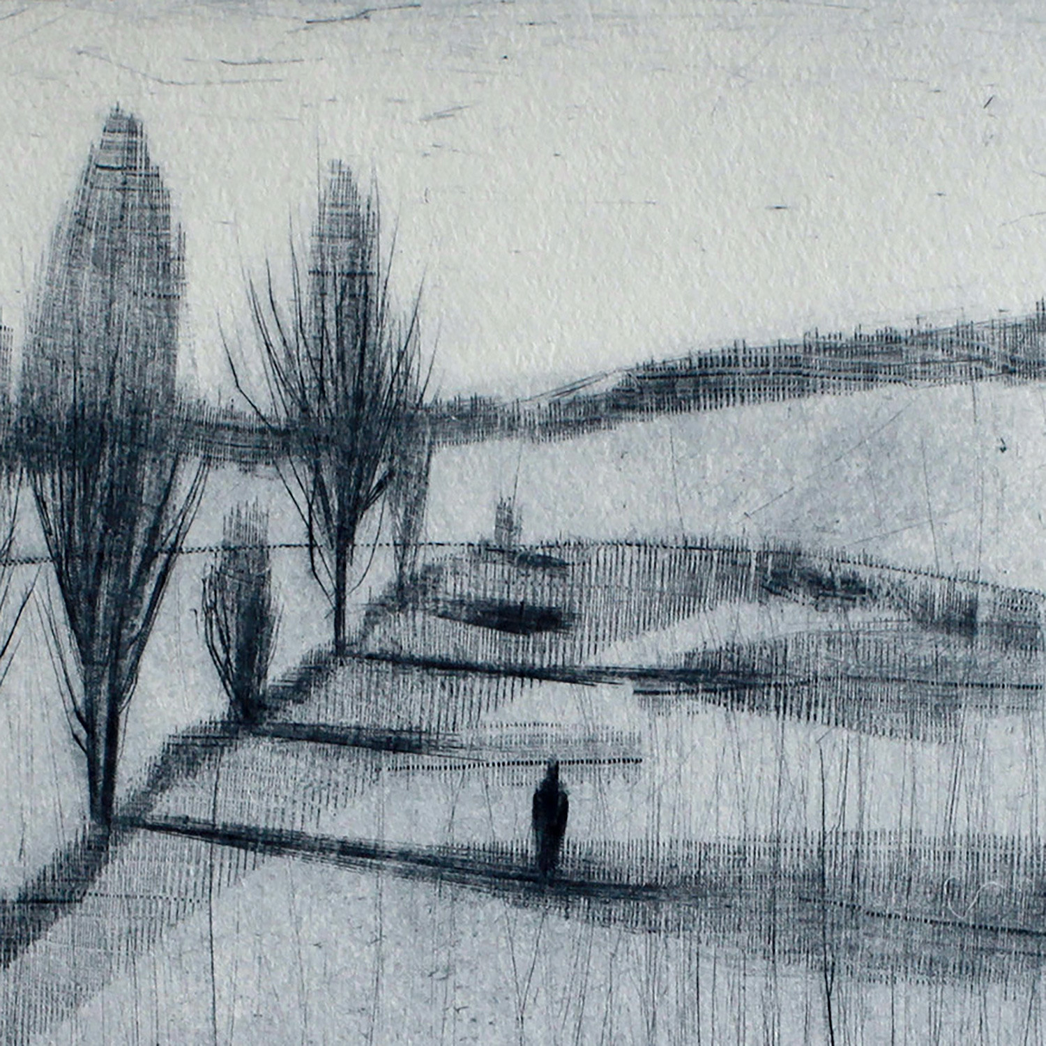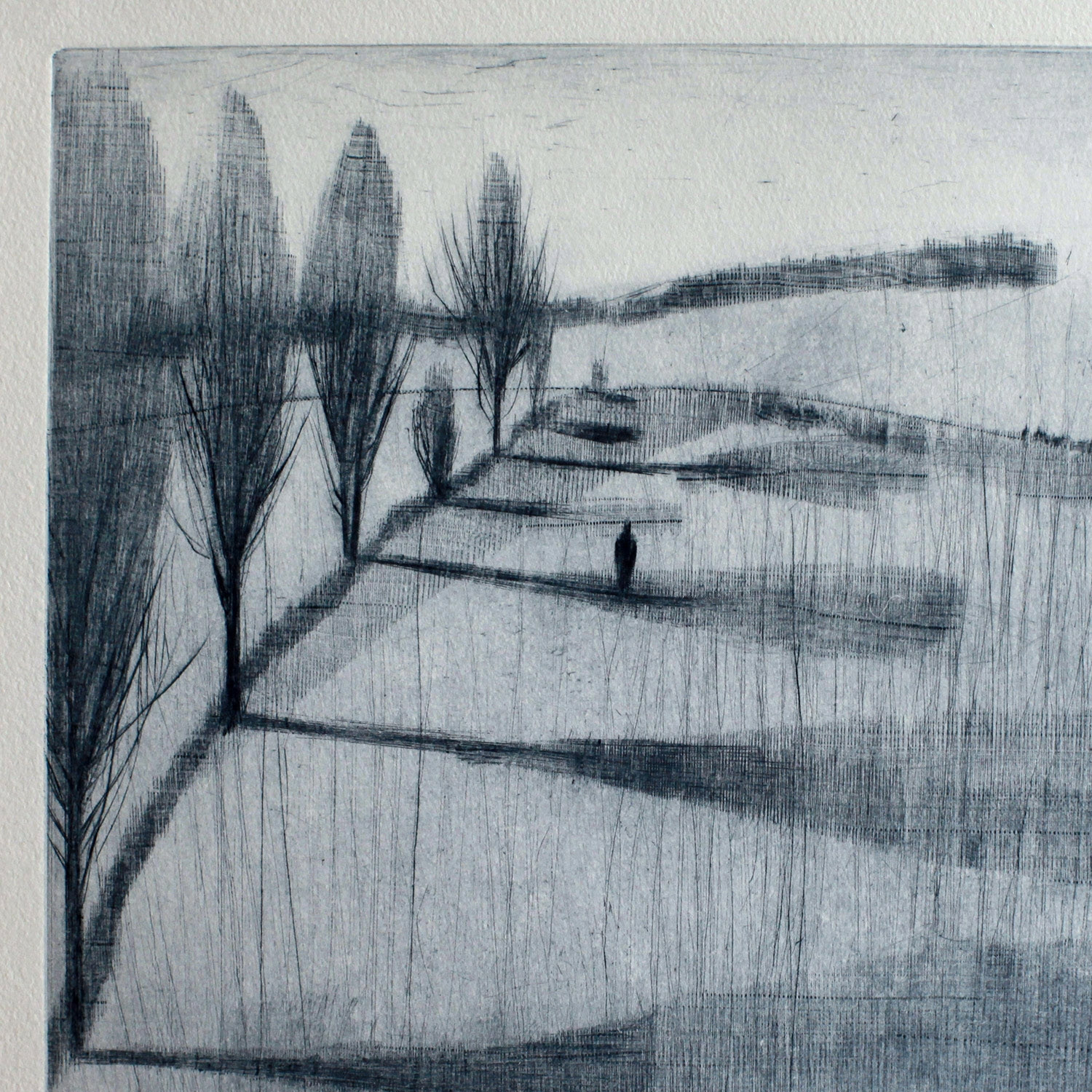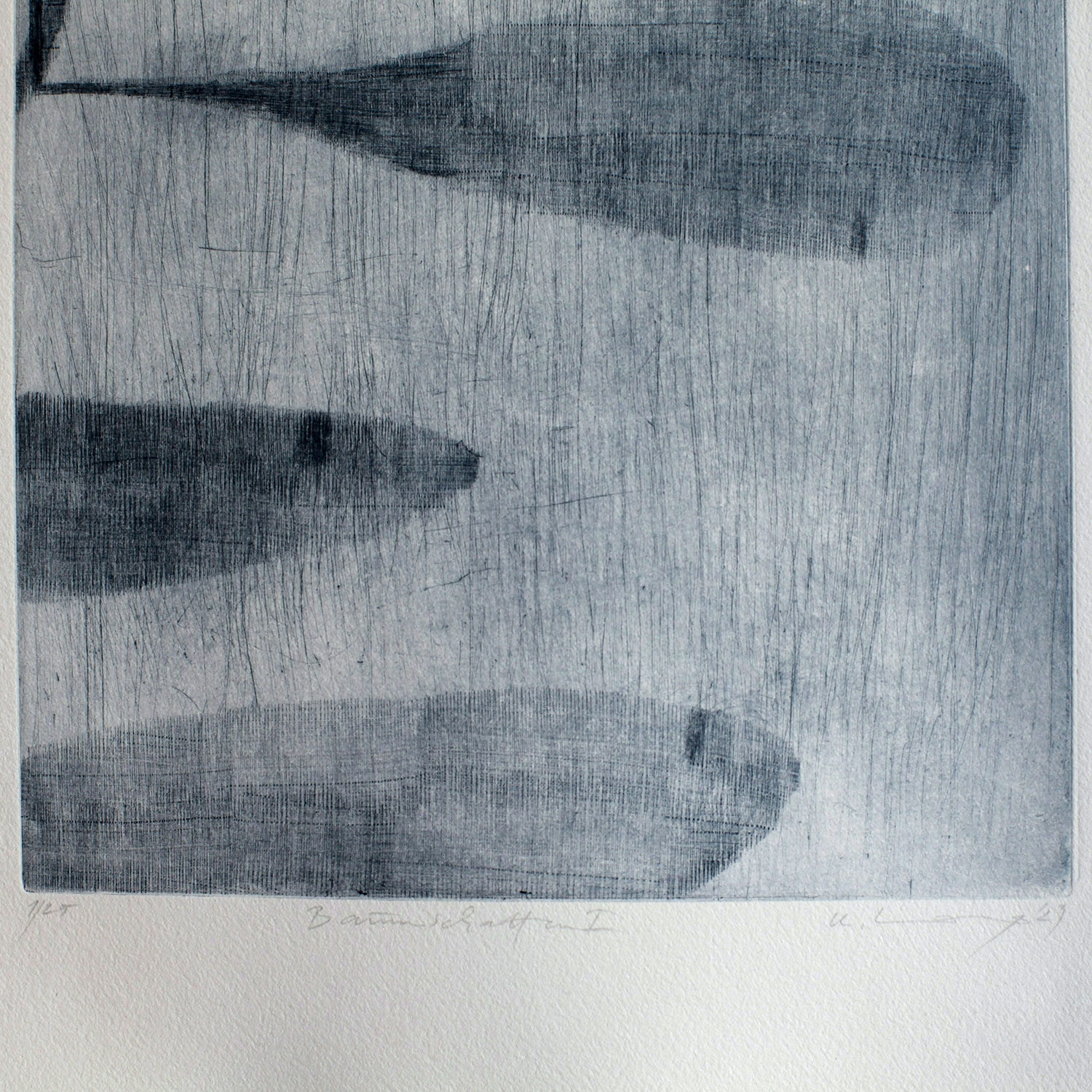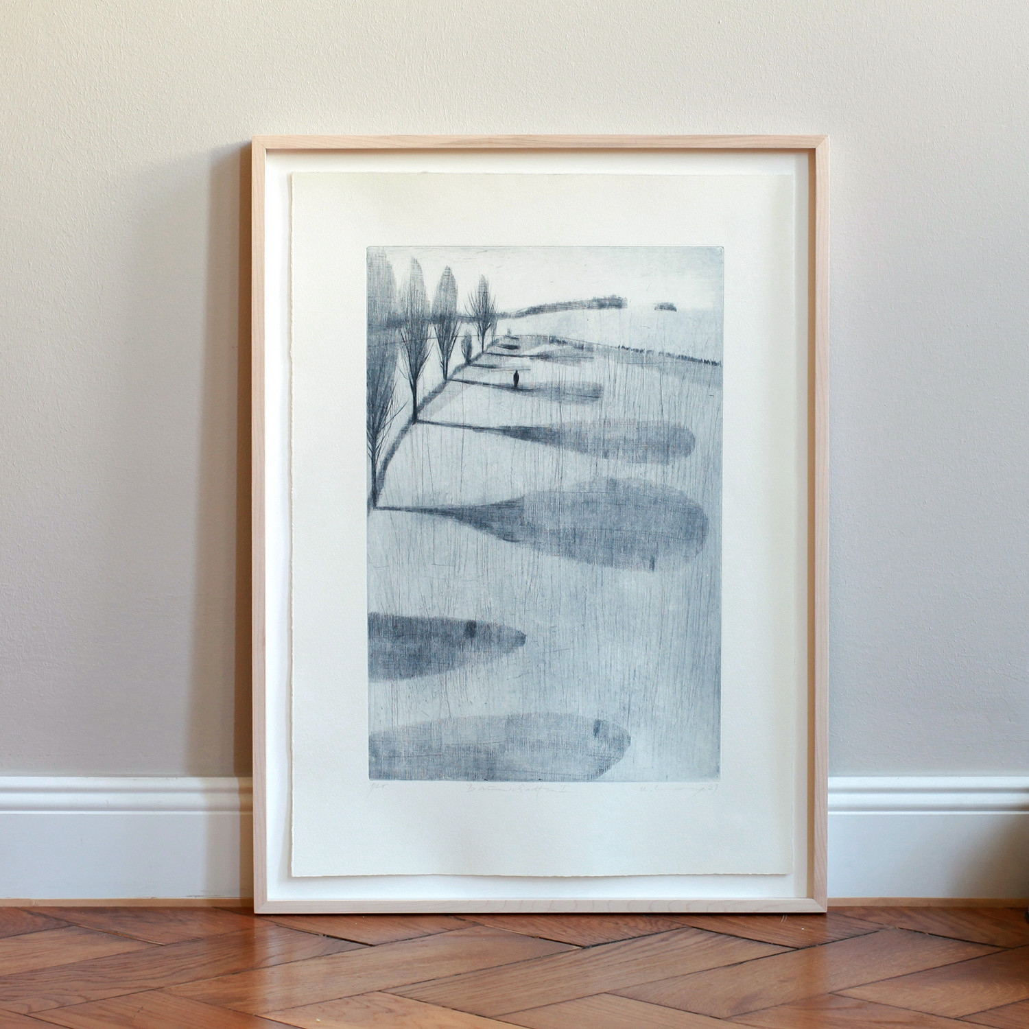 Katja Lang Baumschatten I, 2023 Material Kaltnadelradierung auf Hahnemühle Alt Worms 230g Herstellungsmethode exklusiv für artflash Auflage 25 Maße 40 x 26,5 cm auf 57 x 37 cm Auflage 25 + 2 AP Vorderseitig signiert, nummeriert und datiert Details zum Rahmen Handgefertigter gebeizter und gewachster Ahornrahmen, 10mm Distanzleiste, Außenmaße des Rahmens ca. 57,2 x 42,2 cm. Inkl. rückseitiger Aufhängung Die neue Art, Kunst zu kaufen Handverlesene, exklusive Editionen Limitierte, signierte Auflagen Top-KünstlerInnen und Rising Stars Schnell registrieren, um Preis und Verfügbarkeit zu sehen. Jetzt kostenlos Mitglied werden Bereits Mitglied? Über die Edition Dunkelzart strecken sich die blätterlosen Äste in die Höhe. Doch der Titel der 2023 entstandenen Kaltnadelradierung von Katja Lang lenkt unseren Blick auf die „Baumschatten“. Irritierend rund, fast ballonartig, rückt die Künstlerin sie ins Zentrum des Bildes. Sie strukturieren die weite, winterlich anmutende Landschaft, auf die wir herunterblicken. Darin die schwarze Silhouette eines einzelnen Menschen. Katja Lang nutzt Figuren als Maßstabgeber – und als Identifikationsangebote: Welche mögliche Geschichte tut sich hier auf? Die sparsam bevölkerten, Stille verheißenden Räume werden so zugleich zum Resonanzboden für eigene Stimmungen und Erzählungen. Langs Werke schaffen Platz für Gedanken, wie ein tatsächlicher Spaziergang raus in die Landschaft fernab der Stadt. Über die Künstlerin Katja Lang wurde 1968 im heutigen Chemnitz geboren. Die Künstlerin studierte bis 1993 Architektur an der Technischen Universität Dresden und 2007 bis 2009 Malerei und Grafik an der Hochschule für Bildende Künste Dresden. Schon im Meisterstudium bei der Malerin und Grafikerin Elke Hopfe hat sie sich auf Kaltnadelradierungen spezialisiert. Werke von Lang sind in zahlreichen öffentlichen Sammlungen vertreten, u.a. in der Neuen Sächsischen Galerie, der Deutschen Nationalbibliothek Leipzig und der Staatsbibliothek zu Berlin. Ausstellungen (Auswahl) „Mein Schatten mit mir heimging“ hieß die Doppelausstellung von Katja Lang und Wiebke Steinmetz in der Galerie Art+Form 2023 in Dresden. Werke von Katja Lang waren 2023 auch in der Ausstellung „The Way I Came“ bei THALER Originalgrafik in Leipzig zu sehen. Lesenswerte Artikel / Links Webseite der Künstlerin Video-Interview mit Katja Lang Mehr Kunst entdecken Henri Haake Honey Lotion, 2022 Françoise Pétrovitch Twins, 2011 Per Adolfsen Der Sundsee in Faaborg, 2020