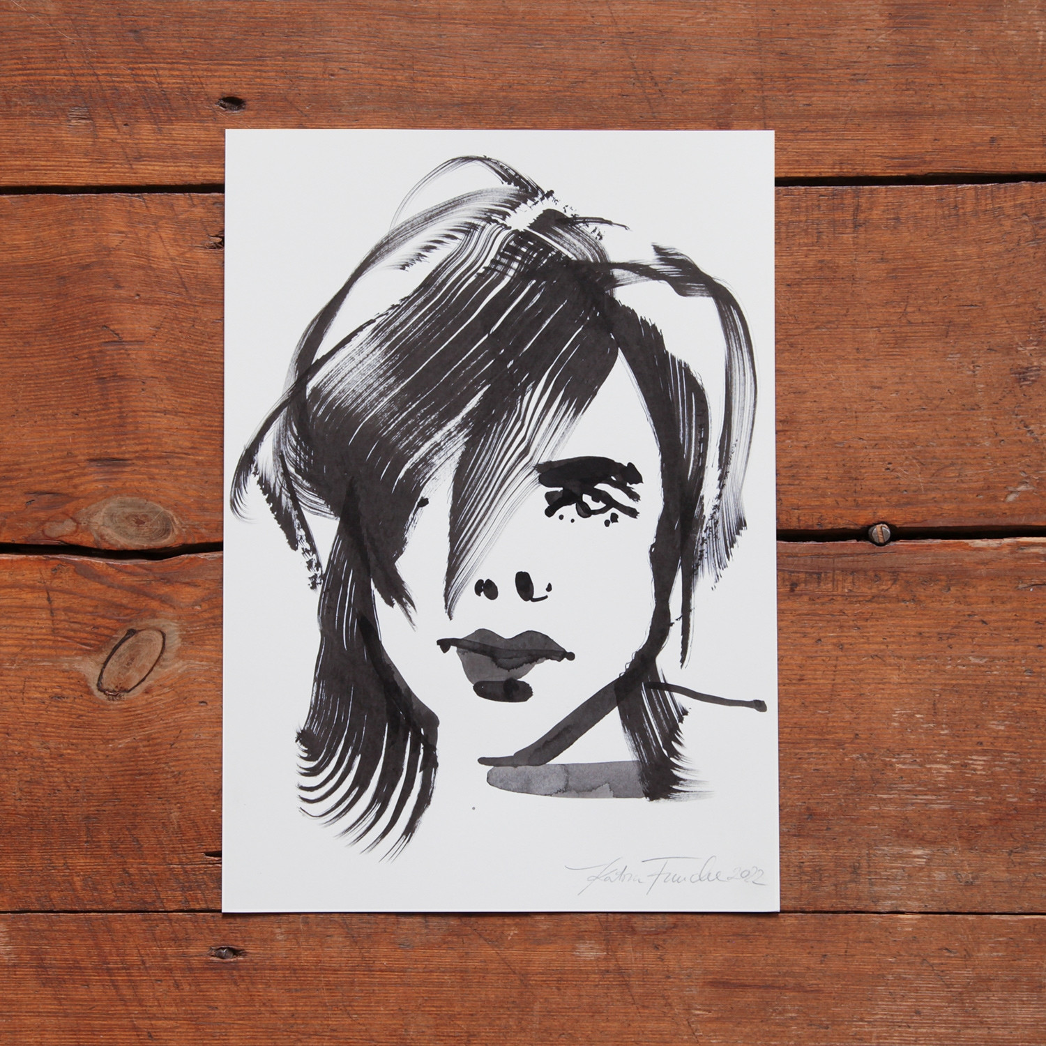 Katrin Funcke The Shage, 2022 Material Tusche auf Papier Auflage 1 Maße 29,7 x 21 cm Unikat signiert und datiert Details zum Rahmen Handgefertigter schwarz lasierter und gewachster Ahorn-Holzrahmen, ca. 34,9 x 26,2 cm, inkl. Distanzleiste, das Werk ist hochgestellt montiert, inkl. Museumsglas und rückseitiger Aufhängung Die neue Art, Kunst zu kaufen Handverlesene, exklusive Editionen Limitierte, signierte Auflagen Top-KünstlerInnen und Rising Stars Schnell registrieren, um Preis und Verfügbarkeit zu sehen. Jetzt kostenlos Mitglied werden Bereits Mitglied? Über die Künstlerin und das Werk Menschen sind das Lieblingsmotiv der Künstlerin und Illustratorin Katrin Funcke (*1970 in Bielefeld). In ihrer signierten Unikat-Porträtserie aus den Jahren 2022/23 verleiht sie den von ihr in Tusche auf Papier skizzierten Frauen liebevolle Titel: „The Bouffant“ trägt die berühmte Jackie-Kennedy-Frisur, „The Parted“ akkuraten Mittelscheitel, „The Stripey“ ein Streifenshirt. Aber es sind nicht nur diese offensichtlichen, äußeren Merkmale, die Funcke hier einfängt. Auch Haltung, Pose, Gesichtsausdruck und Accessoires fixiert sie mit wenigen Strichen – und schafft somit überzeugende Charakterstudien, die vor Lebendigkeit und Coolness nur so sprühen. „Expressiv, rau und elegant. Ich bin sehr glücklich, wenn mir das alles auf einmal gelingt“, so beschreibt Funcke ihr selbst gestecktes Ziel. Bei den Tusche-Köpfen gelingt ihr das, so scheint es zumindest, mit großer Leichtigkeit ‒ auch wenn sie selbst verrät: „Alles, was locker aussieht, ist harte Arbeit.“ Das mag man ihr kaum glauben. Katrin Funcke wurde mehrfach ausgezeichnet, u.a. mit einer Art Director’s Club-Goldmedaille, dem Künstlerinnenpreis des Landes Nordrhein-Westfalen und dem 4. Fashion Illustration and Drawing (FIDA) Award. Sie stellt in zahlreichen Institutionen und Galerien in Deutschland aus. Ausstellungen (Auswahl) „ZU MENSCH – Skizzen und Blicke zurück auf Herbert Grönemeyers Album ‚Mensch‘“ mit Illustrationen von Katrin Funcke ist 2022 im Verlag Antje Kunstmann erschienen. Funcke gehörte zudem 2021 zu den Gewinner*innen des 4. Fashion Illustration and Drawing (FIDA) Award. Drei Jahre zuvor, 2018, zeigte die Galerie Mitte in Bremen in der Ausstellung „Paula ‒ Requiem für eine Freundin“ Werke von Funcke und ihrer Künstler*innengruppe „Bettine“. Lesenswerte Artikel / Links Webseite von Katrin Funcke Katrin Funcke bei Art Act Mehr Kunst entdecken Nadine Wölk Shut Up (Studie), 2020 Nadine Wölk High Noon II.1, 2019 Nadine Wölk High Noon V (Studie), 2022