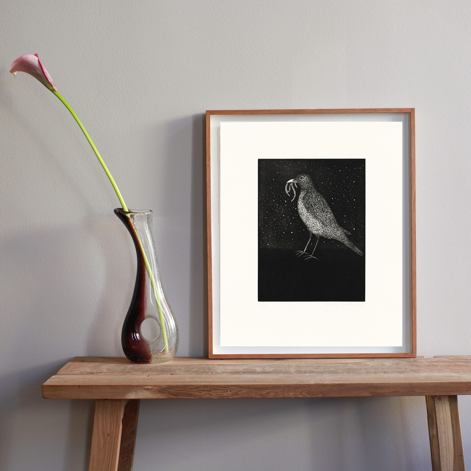 Kiki Smith Sooner, 2018 Material Strichätzung und Aquatinta auf Hahnemühle Bütten 300g, jedes Blatt mit Blattpaladium (Platinmetall) collagiert, handcoloriert Auflage 45 Maße Blatt 47 x 38,3 cm, Bild 30 x 22,4 cm Auflage 45 + 6AP + 3PP signiert und nummeriert Details zum Rahmen Handgefertigter Ahornrahmen, mit 10 mm Distanzleiste, Außenmaße ca. 52,2 x 43,5 cm, inkl. Museumsglas und rückseitiger Aufhängung Die neue Art, Kunst zu kaufen Handverlesene, exklusive Editionen Limitierte, signierte Auflagen Top-KünstlerInnen und Rising Stars Schnell registrieren, um Preis und Verfügbarkeit zu sehen. Jetzt kostenlos Mitglied werden Bereits Mitglied? Über die Edition In den ersten Jahrzehnten ihres künstlerischen Schaffens konzentrierte sich die Wahl-New-Yorkerin Kiki Smith (*1954) vor allem auf den menschlichen Körper im Kontext politischer und sozialer Fragen in Hinsicht auf Aids, Gender, Feminismus. Schonungslos stülpte sie das Innere nach außen, nahm in ihren Arbeiten Bezug auf Körpersäfte, Verdauungsorgane und Exkremente, um sich der Conditio humana auf ihre Weise anzunähern. Erst später begannen Tiere ihr Werk zu dominieren, darunter Wölfe, Katzen, Rehe, Schlangen oder Adler. Vögel haben für die Künstlerin einen besonderen Stellenwert. Sie träume viel von ihnen, beobachte die Veränderung ihrer Lebensbedingungen, ihr Verschwinden, sagt Smith. Über die Künstlerin Mensch und Tier, Natur und Kosmos – das sind zentrale Themen im Werk der US-amerikanischen Künstlerin Kiki Smith. Der Vogel vor dem leuchtenden Sternenhimmel, Würmer im Schnabel, verweist nicht nur auf unser Verortetsein im Universum, sondern auch auf die Endlichkeit allen Daseins. „Sooner“, so der Titel der Druckgrafik, oder eben „later“ erwischt es jede und jeden, auch Humor blitzt hier auf. Das Grafische steht bei Smith gleichberechtigt neben ihrem skulpturalen Werk. Ihre Lithografien und Stiche nennt sie „das Fundament meiner Arbeit“, die auch Malerei und Zeichnung, Fotografie und Textil umfasst. Das atmosphärische Blatt „Sooner“ ist entstanden anlässlich einer großen Retrospektive im Haus der Kunst in München im Jahr 2018. Smiths Arbeiten sind in den renommiertesten Museen weltweit zu sehen, zudem war sie auf der Documenta in Kassel und der Biennale in Venedig zu Gast. Ihre Werke sind international in Sammlungen vertreten, u.a. im Centre Georges Pompidou, Paris, im MoMA, im Whitney Museum of American Art, im Solomon R. Guggenheim Museum und im Metropolitan Museum of Art, New York, im Moderna Museet, Stockholm, sowie in der Tate Gallery in London. Ausstellungen (Auswahl) Mit der Ausstellung „From My Heart“ gratuliert die Staatliche Graphische Sammlung München Kiki Smith aktuell zu ihrem 70. Geburtstag am 18. Januar 2024. Schon 2019 erwies dieselbe Institution der Künstlerin mit der Ausstellung „TOUCH. Prints by Kiki Smith“ in der Pinakothek der Moderne ihre Reverenz für deren Schenkung des gesamten in Auflage erschienenen druckgrafischen Werks. „Red Standing Moon“ hieß wiederum die Soloschau bei der Berliner Galerie Thomas Schulte im Jahr 2022. Im Haus der Kunst in München war zudem 2018 die Einzelausstellung „Kiki Smith. Procession“ zu sehen, die später auch im Belvedere Museum Wien und im Sara Hildén Art Museum im finnischen Tampere Station machte. Lesenswerte Artikel / Links Kiki Smith bei „Arte TRACKS“ Kiki Smith im „VOGUE“-Interview (2019) Mehr Kunst entdecken Joachim Lambrechts Marilyn Monroe in New York, 2022/2023 Jordan Sullivan Californias`s Young Pill Poppers, 2022 Nadine Wölk Nightswimming IV, 2020 Stefan Marx Love Letter, 2023 Coco Kühn Vierheit, verletzt, vergoldet, 2023 Henri Haake Honey Lotion, 2022
