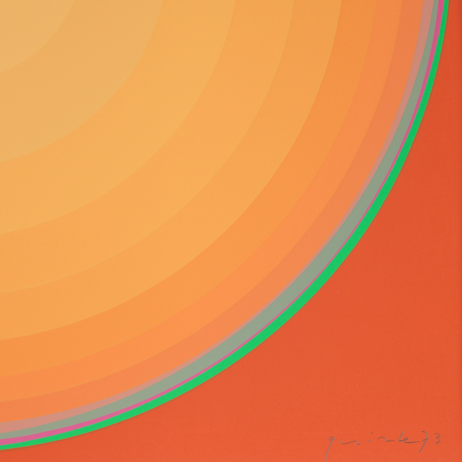 Lothar Quinte Quasar (orange Variante), 1973 Material 13-farbige Serigrafie Auflage 125 Maße 50 x 50 cm Auflage 125 handsigniert, datiert und nummeriert Details zum Rahmen Handgefertigter titan-weiss lasierter und gewachster Ahorn-Holzrahmen, Außenmaße des Rahmens ca. 51,4 x 51,4 cm. Inkl. 10mm Distanzleiste, das werk ist hochgestellt montiert. Inkl. rückseitiger Aufhängung und Museumsglas. Die neue Art, Kunst zu kaufen Handverlesene, exklusive Editionen Limitierte, signierte Auflagen Top-KünstlerInnen und Rising Stars Schnell registrieren, um Preis und Verfügbarkeit zu sehen. Jetzt kostenlos Mitglied werden Bereits Mitglied? Über die Edition Auch in Lothar Quintes Serigrafien-Serie „Quasar“, entstanden in der Hochphase seines künstlerischen Schaffens Mitte der 70er Jahre, wird Kunst zum optischen Erlebnis. Die geometrische Form des Kreises dominiert neben Falt-, Fächer- und Schlitzbildern bereits ab etwa 1965 sein Werk. Durch leuchtende Farben, etwa Gelb, Pink oder Türkis, wirken die Kreisformen wie illuminiert. Assoziationen mit Himmelskörpern wie der Sonne werden geweckt. Dazu täuschen Hell-Dunkel-Effekte eine Tiefendimension vor, deren Sog wir uns als Betrachter*innen kaum entziehen können. Der Titel verrät die Spur: Quasare gehören als helle, aktive Zentren einer Galaxie zu den mächtigsten Energiequellen unseres Universums. In ihrer Mitte befindet sich ein Schwarzes Loch. „An der Malerei interessiert mich einzig und allein das optische Ereignis“, hat Quinte über seine Kunst gesagt. Ein Ereignis sind seine Kreisbilder allemal, ebenso wie eine verlockende Einladung zur Kontemplation. Über den Künstler Bei seiner steten Suche nach einem Ausdruck für die Tiefen und Untiefen des Seins kam Lothar Quinte (geb. 1923 im oberschlesischen Neisse, heute Nysa; gest. 2000 in Wintzenbach im Elsass) ganz ohne Figuren aus. Zeit seines Lebens verzichtete er auf jede Form von Gegenständlichkeit. In seiner frühen Schaffensphase dominierte die gestische Malerei – Quinte wollte seinem Lehrer HAP Grieshaber etwas entgegensetzen. Er pflegte enge Kontakte zu Informel-Künstlern wie Pierre Soulages, Hans Hartung oder Wols und wurde selbst einer der Protagonisten dieser abstrakten Richtung der Malerei, wie er sich auch der Bewegung simulierenden Op-Art zugehörig fühlte. „Was ich male, bin ich“, sagte der documenta-Künstler einmal. Weil er jedoch jedwede figurative Festlegung vermied, werden seine Werke gleichzeitig zum Spiegel für den*die Betrachter*in. Ausstellungen (Auswahl) In der Galerie Rottloff in Karlsruhe werden Werke von Lothar Quinte seit Beginn der 60er Jahre in vielen Einzelausstellungen präsentiert. 1977 nahm der Künstler an der documenta 4 in Kassel teil. Er gehörte außerdem zu den insgesamt 68 Maler*innen und Bildhauer*innen, die in der Ausstellung „Recent Acquisitions“ 1966 im New Yorker MoMA zu sehen waren. Lesenswerte Artikel / Links Webseite zu Lothar Quinte 1997 erhielt Lothar Quinte den Lovis-Corinth-Preis der KünstlerGilde Esslingen Mehr Kunst entdecken George Byrne Desert Pit Stop, 2018/2023 George Byrne Santa Clarita #2, 2018/2023 George Byrne Santa Clarita #2 & Desert Pit Stop / SET, 2018/2023 Lothar Quinte Quasar (schwarze Variante), 1973 Lothar Quinte Quasar (weisse Variante), 1973 Lothar Quinte Quasar (gelbe Variante), 1973