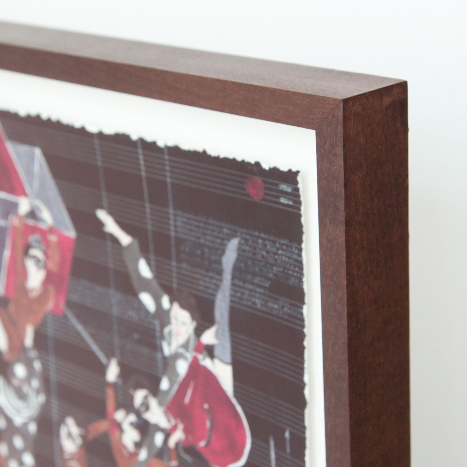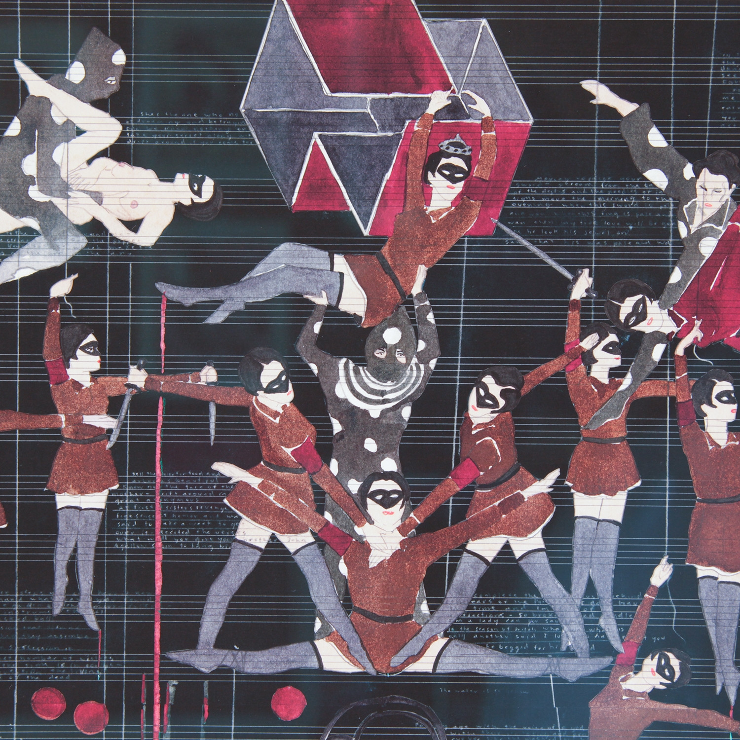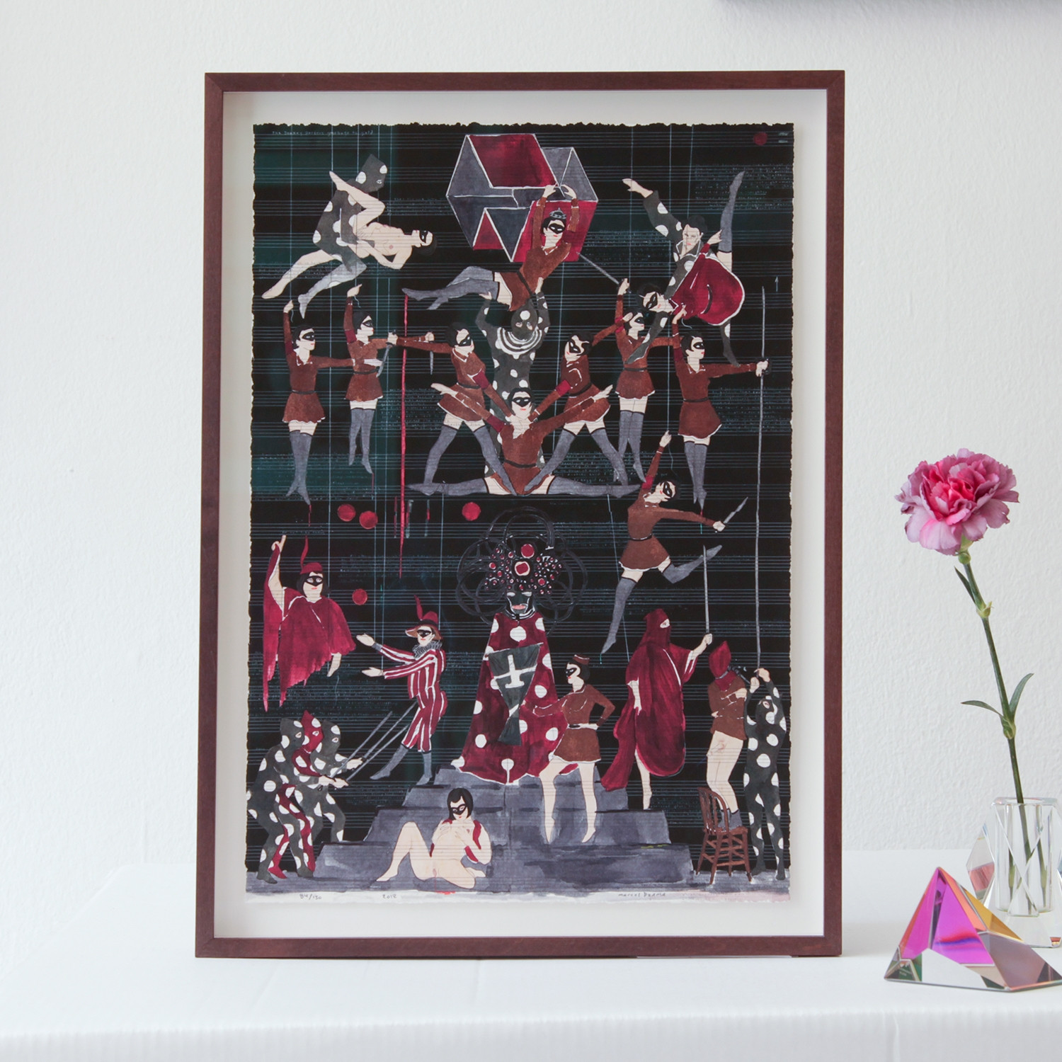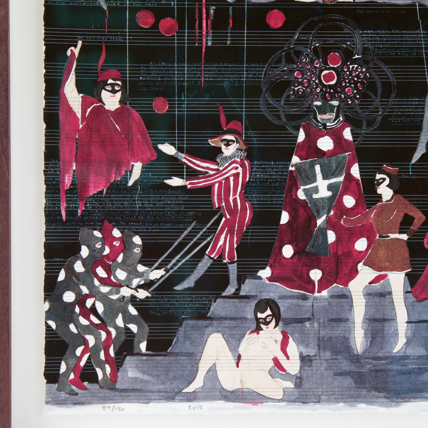 Marcel Dzama Where All Harmonies Are Tuned, 2011 Material Druck mit archivalischen Pigmenten auf Fine-Art-Rag-Papier mit mattem Finish Auflage 150 Maße 43,2 x 30,5 cm signiert und nummeriert Details zum Rahmen Handgefertigter Palisander gebeizter und gewachster Ahorn-Holzrahmen, inkl. 10mm Distanzliste, Außenmaße ca. 48,3 x 35,9 cm. Inkl. Museumsglas und rückseitiger Aufhängung. Die neue Art, Kunst zu kaufen Handverlesene, exklusive Editionen Limitierte, signierte Auflagen Top-KünstlerInnen und Rising Stars Schnell registrieren, um Preis und Verfügbarkeit zu sehen. Jetzt kostenlos Mitglied werden Bereits Mitglied? Über die Edition „Where All Harmonies Are Tuned“, der Titel der 2011 entstandenen, nummerierten und signierten Edition von Marcel Dzama könnte sinnbildlich für ein Leitmotiv in den doppelbödigen Werken des Kanadiers stehen: den Horror, der sich hinter vordergründigem Spaß und Verspieltheit auftut. Die Zirkusperformerinnen sind hier zum Mitmachen verdammt: an Fäden hängende Puppen, animiert von verhüllten Wesen – die Augenmasken und gepunkteten Kostüme sind immer wieder auftauchende Motive in Dzamas Arbeiten. Der imaginäre Klang: düster. Die Figuren tanzen vor blassen Notenlinien auf schwarzem Grund. Ob Varieté, Bauhaus oder Manga ‒ die Anleihen in Dzamas Werk sind zahlreich, und doch entsteht eine ureigene, eigenwillige künstlerische Handschrift mit hohem Wiedererkennungswert. Über den Künstler Marcel Dzama, 1974 in Winnipeg geboren, ist bekannt für seine detaillierten, feingliedrigen Zeichnungen. Gedämpfte Farben, obskure Figuren, erotische Motive und psychosexuelle Themen machen sein Werk unverwechselbar. Der kanadische Künstler arbeitet darüber hinaus mit Skulptur, Malerei und Video, zudem sucht er immer wieder die Möglichkeit zur Kooperation mit Kolleg*innen wie Raymond Pettibon, Kim Gordon, Spike Jonze und Dave Eggers. Marcel Dzama wird in New York und London von dem renommierten Galeristen David Zwirner vertreten. Seine Werke sind Teil zahlreicher internationaler Sammlungen, u.a. im MoMA und im Solomon R. Guggenheim Museum in New York, im Centre Georges Pompidou in Paris, in der Tate Gallery in London und im Museo Nacional Centro de Arte Reina Sofía in Madrid. Ausstellungen (Auswahl) 2022 waren bzw. sind Arbeiten von Marcel Dzama u.a. in Soloausstellungen in der Galerie David Zwirner in London, der Galerie Sies + Höke in Düsseldorf und im Museo de Arte Zapopan (Mexiko) zu sehen. Lesenswerte Artikel / Links Marcel Dzama bei David Zwirner, New York/London Marcel Dzama bei Galerie Sies + Höke, Düsseldorf Marcel Dzama im Interview, artnet 2022 Mehr Kunst entdecken Harald Hermann Außerhalb der Zeit, 2015 Christoph Niemann Courtyard (Andalucia), 2020 Roman Manikhin Black Ladies II, 2018 Antoni Tàpies Clau del Foc XIII, 1973