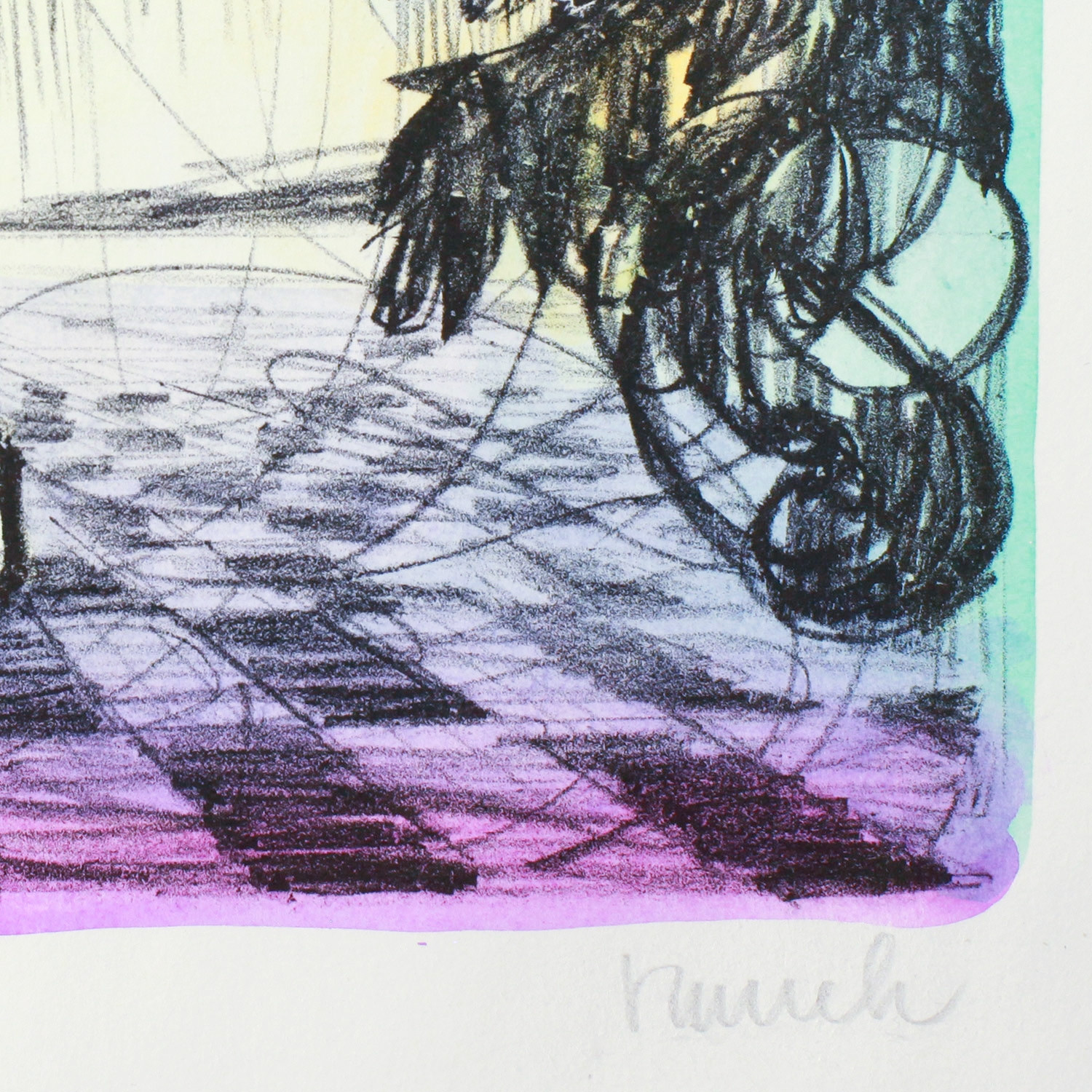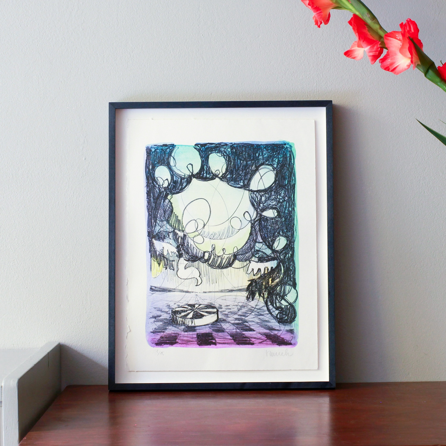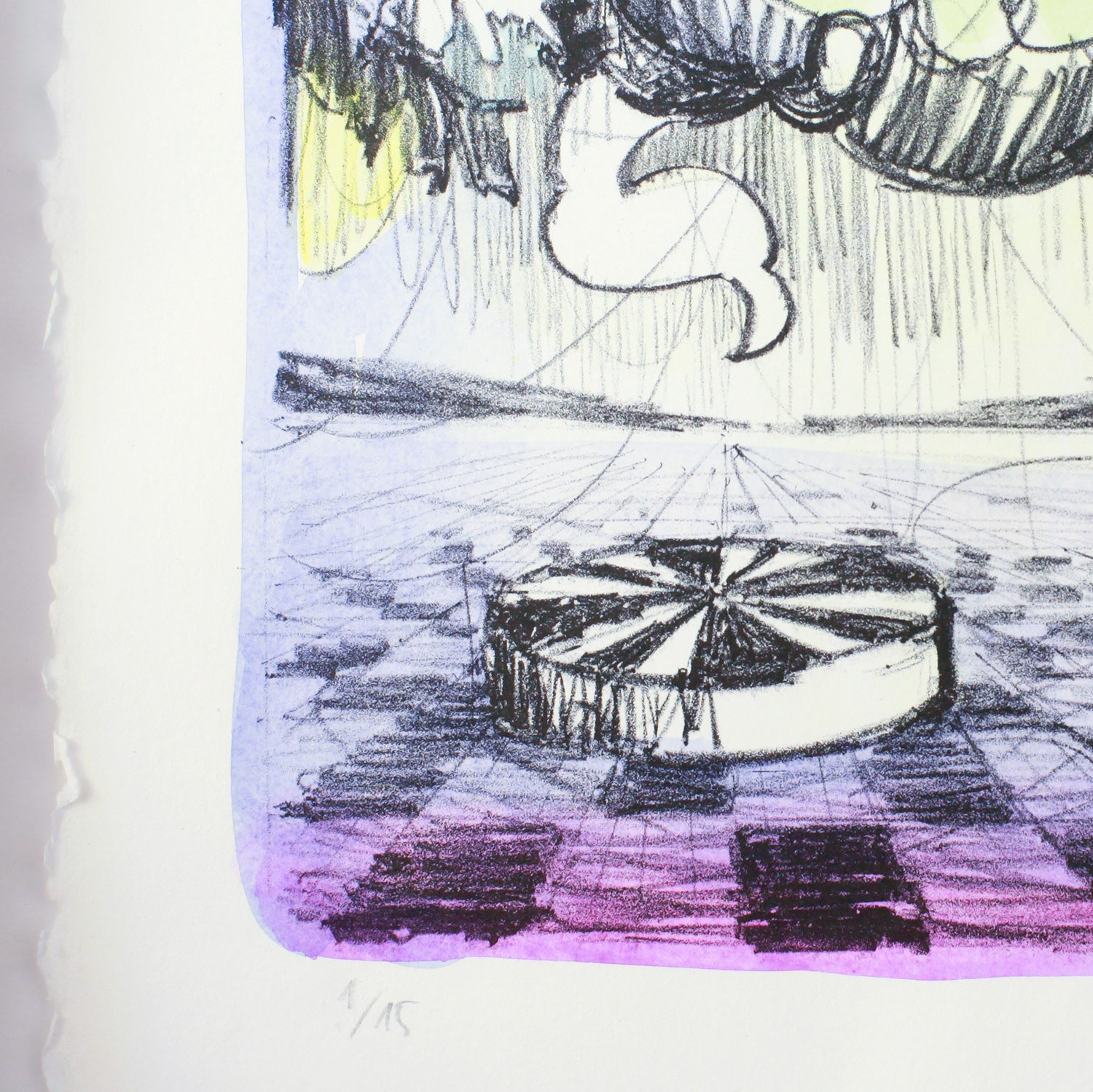 Matthias Moravek Circulation, 2023 Material Lithografie, handkoloriert Auflage 15 Maße 38 x 28 cm Auflage 15 signiert und nummeriert Details zum Rahmen Handgefertigter gebeizter und gewachster Ahornrahmen, inkl. 10mm Distanzleiste und Normalglas, Außenmaße des Rahmens ca. 43,2 x 33,8 cm. Inkl. rückseitiger Aufhängung Die neue Art, Kunst zu kaufen Handverlesene, exklusive Editionen Limitierte, signierte Auflagen Top-KünstlerInnen und Rising Stars Schnell registrieren, um Preis und Verfügbarkeit zu sehen. Jetzt kostenlos Mitglied werden Bereits Mitglied? Über die Edition Die Erforschung des Himmels mit Mitteln der Malerei – so beschreibt Matthias Moravek einen der künstlerischen Ausgangspunkte in seinem Werk. Phänomene wie Wolken und Wirbel tauchen immer wieder auf. Ihn interessieren dabei Assoziationsreichtum und Form gleichermaßen. In seiner in zarten Farben handkolorierten Lithografie „Circulation“ aus dem Jahr 2023 ähneln die Wolken einer Sprechblase, die sich bildbestimmend über einer Art Zirkuspodest ausbreitet. Bedrohlich fast türmt sich hier etwas auf. Die horizontalen schwarzen Linien und das Schachbrettmuster skizzieren zudem einen kulissenhaften Raum: eine „bühnenartige Landschaft“ in den Worten des Malers selbst. In anderen Arbeiten des Künstlers entweichen Sprechblasen Trichtern, die aussehen, wie jene von Grammophonen. Eine Reminiszenz an eine andere, vergangene Zeit. „Ich suche meist nach einem Zustand zwischen Auslesbarkeit und Verrätselung“, sagt Matthias Moravek. Was wird hier also verhandelt, was gespielt? Sowohl die bildkompositionelle Wirkung als auch die kulturell konnotierten Motive der menschenleeren Szene beflügeln unsere eigenen Fantasien. Über den Künstler Der Wahlberliner Matthias Moravek (*1976) studierte Bildende Kunst an der Kunstakademie Karlsruhe und an der Universität der Künste Berlin. Stipendien brachten ihn u.a. nach Los Angeles (2018), Istanbul (2014), in den Senegal (2013) und nach Ahrenshoop (2010). Seine Werke werden in zahlreichen nationalen und internationalen Ausstellungen gezeigt und finden sich in Sammlungen im In- und Ausland. Ausstellungen (Auswahl) "TALES FROM A THIRD SPACE" heißt die Ausstellung, an der Matthias Moravek in der Galerie El Palmar, Mexico City teilnimmt, 30.03.-15.04.2024. Werke von Matthias Moravek waren bis Januar 2024 in der Ausstellung „Die Obiger Galaxis – Compiling Caspar David“ bei Axel Obiger, einem von Künstler:innen betriebenen Raum für zeitgenössische Kunst in Berlin zu sehen. „Turning Your Orbit Around“ hieß die Malereiausstellung 2023 bei KASKO, einem Raum für aktuelle Kunst, Performance und Vermittlung in Basel, mit Werken von Matthias Moravek. Die Frankfurter Galerie Greulich zeigte 2022 die Einzelausstellung „Revue Tropique“ von Matthias Moravek. Lesenswerte Artikel / Links Webseite des Künstlers Der Künstler auf Instagram FAZ-Artikel zur Einzelausstellung „Revue Tro¬pique“ in der Frankfurter Galerie Greulich (2022 Mehr Kunst entdecken Joachim Lambrechts Marilyn Monroe in New York, 2022/2023 Henri Haake Duschende, 2022 Katja Lang Baumschatten I, 2023 Giselle Monzón Calero Nocturnal Animals, 2016 Katharina Ziemke Eugenie Clark, 2024 Nina Backman Ode to Surrealism, 2024