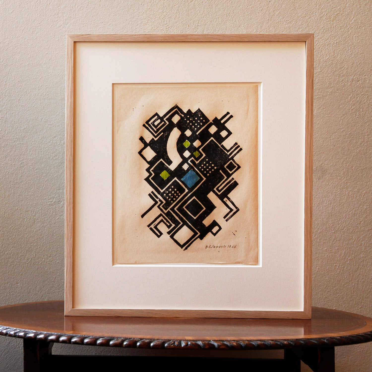 Max Olderock Abstrakte Komposition, 1966 Material Holzschnitt und Aquarell Herstellungsmethode vorderseitig signiert Auflage 230 Maße 27 x 17.5 cm geringfügige Alterungsspuren Details zum Rahmen Handgefertigter gewachster Eichenholzrahmen, mit eierschalefarbenem Passepartout, Außenmaße ca. 23 x 29,9 cm. Inkl. rückseitiger Hängeleiste, staubdicht verschlossen. Die neue Art, Kunst zu kaufen Handverlesene, exklusive Editionen Limitierte, signierte Auflagen Top-KünstlerInnen und Rising Stars Schnell registrieren, um Preis und Verfügbarkeit zu sehen. Jetzt kostenlos Mitglied werden Bereits Mitglied? Über die Edition „Es gibt wohl inmitten der Langeweile wenig Langweiligeres als die krampfhafte Bemühung ,fortschrittlicher‘ Kreise um den verharmlosten und salonfähig zurechtgestutzten Avantgardismus. Neben den Ahnungslosen rasen die Ewig-Verspäteten von Vernissage zu Konzert und bedienen sich aller Hilfsmittel zur Beseitigung der Verdauungsbeschwerden beim vorsichtigen Genießen der ‚modernen‘ Kunst“ ‒ so beginnt das 1958 von 30 Künstlern und Intellektuellen unterschriebene „Manifest gegen den Avantgardismus“. Treibende Kraft dahinter ist der aus Ungarn stammende Basler Kunsthändler, Sammler und Psychoanalytiker Carlo Laszlo. Es ist bezeichnend, dass es auch Laszlo ist, der nur zwei Jahre später und in Fortsetzung dann noch einmal 1965 und 1977 ein Sammelportfolio ediert, das unter dem Titel „La Lune en Rodage“ insgesamt 180 Kunstwerke führender Künstler der europäischen Avantgarde zwischen den 1920er und den 1970er Jahren präsentiert. Die heute hier vorgestellten Arbeiten sind eine Auswahl aus den drei Ausgaben. Visuell eindrucksvoll erinnern sie an die Aufbruchstimmung und den Willen zur Erneuerung jener Jahrzehnte. Über den Künstler Max Olderocks (1895‒1972) Holzschnitte „Komposition mit Häusern“, und „Abstrakte Komposition“ sind auf sehr feinem Papier gedruckt und nachträglich aquarelliert, was jedem Werk Unikat-Charakter verleiht! Mehr noch: Kleine schwarze Striche und Punkte abseits des Motivs auf dem Papier offenbaren sich als Spuren, die beim Druckprozess entstanden sind und Olderocks Arbeiten eine ganz besondere Note verleihen. Der in Hamburg geborene Künstler war Mitglied des Deutschen Werkbundes und mit dem Bauhaus-Meister Lothar Schreyer in Kontakt. Während des „Dritten Reichs“ hatte Olderock Malverbot und seine in öffentlichen Sammlungen befindlichen Werke wurden zerstört. Wir schätzen uns umso glücklicher, Ihnen heute im Rahmen von „La Lune en Rodage“ diese zwei Holzschnitte aus dem Jahr 1966 zu präsentieren! Lesenswerte Artikel / Links Max Olderock bei Wikipedia Mehr Kunst entdecken Philip Grözinger Calamity, 2017 Christian Schad Varietéprobe, 1925 Marcello Morandini Ohne Titel, 1977 Andreas Christen Ohne Titel, 1966 Getulio Alviani Ohne Titel, 1977 Augustin Tschinkel Personnage, 1934 Gerd Arntz Bespiegelungen II, 1930 Joachim Albrecht Ohne Titel, 1966 Max Olderock Komposition mit Häusern, 1966