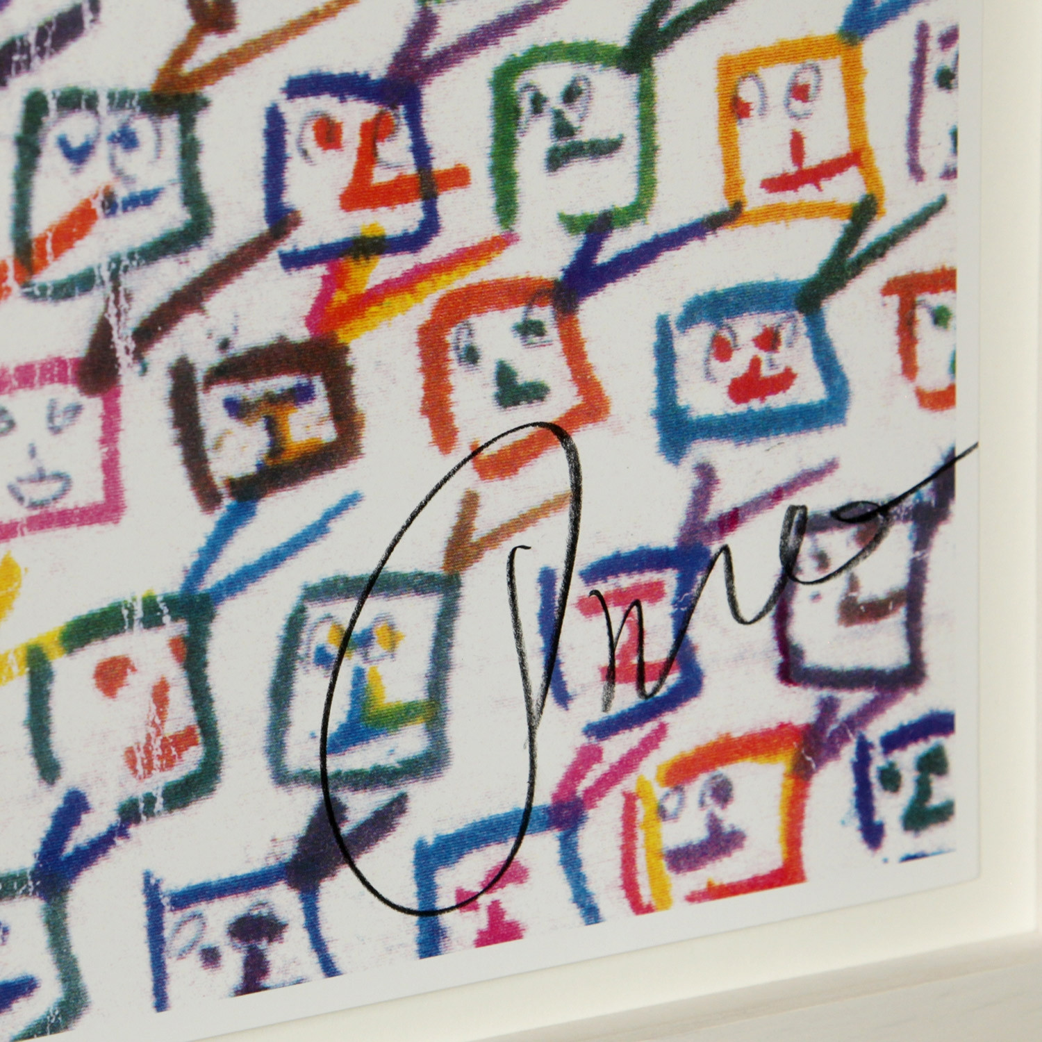 Nam June Paik o.T. – aus der Sydney Mappe, 1990 Material 4 Farb-Offset Lithografie Auflage 105 Maße 100 x 70 cm signiert, inkl. Zertifikat Auflage 105 + 35 AP Details zum Rahmen Handgefertigter weiß lasierter und gewachster Ahorn-Holzrahmen, Außenmaße: 106 x 76 cm, inkl. 10mm Distanzleiste und Normalglas und rückseitiger Aufhängung, staubdicht verschlossen. Die neue Art, Kunst zu kaufen Handverlesene, exklusive Editionen Limitierte, signierte Auflagen Top-KünstlerInnen und Rising Stars Schnell registrieren, um Preis und Verfügbarkeit zu sehen. Jetzt kostenlos Mitglied werden Bereits Mitglied? Über die Edition Nam June Paiks meditierender, im Fernsehen sein eigenes Bild betrachtender „TV-Buddha“ (1974) ist eine Ikone der Videokunst. Schon ein Jahrzehnt früher hatte der Medienkünstler eine der ersten tragbaren Videokameras gekauft und verkündet: „Das Fernsehen hat uns ein Leben lang attackiert, jetzt schlagen wir zurück und machen unser Fernsehen selbst.“ Die TV-Monitore bevölkerten bereits früh und nachhaltig sein Werk. Mit der signierten Lithografie „o.T.“ (1990) schuf Paik ein fröhliches, farbenfrohes Gewimmel lächelnder Monitore. Die Edition entstand im Rahmen der von René Block kuratierten 8. Sydney Biennale „The Readymade Boomerang – Certain Relations in 20th Century Art‟ und ist Teil einer Grafikmappe gleichen Namens. Ersetzt man die viereckigen Geräte gedanklich durch hochkantige Displays, werden sie zum Sinnbild heutiger Vernetzung. Auch ebendiese Vernetzung hat der visionäre Künstler seinerzeit vorhergesehen: Schon 1974 sprach Paik von der Entwicklung eines „elektronischen Superhighways, eines Breitband-Kommunikationsnetzwerks“. Sein „Internet Dream“ – ein Werk aus dem Jahr 1994 – bestand dann aber wiederum aus: 52 Monitoren. Über den Künstler Ursprünglich begann Nam June Paik (1932‒2006) seine künstlerische Laufbahn als Komponist. Sein Lehrer Wolfgang Fortner hielt den gebürtigen Koreaner allerdings für eine „so extraordinäre Erscheinung“, dass er sich nicht für ihn zuständig fühlte und ihn an das Studio für Elektronische Musik beim WDR in Köln empfahl. Hier traf er auf Karlheinz Stockhausen und auch Joseph Beuys wurde zu seinem künstlerischen Wegbegleiter. Entscheidend war die Begegnung mit dem amerikanischen Komponisten John Cage 1958. Danach ging Nam June Paik mit seiner Aktionsmusik ganz neue Wege – und als „destruction artist“ in die Kunstgeschichte ein. „Das Klavier ist ein Tabu. Es muss zerstört werden.“ Das ist so ein Paik-Satz aus dieser Zeit. Dazu gehören auch seine Experimente mit neuen Technologien, er gilt nicht zuletzt als Pionier der Videokunst. „Ich wollte das Fernsehen zu einer Kunstform erheben, die ebenso hoch geschätzt wird wie die Musik von Johann Sebastian Bach“, sagte er rückblickend auf sein reiches und vielbeachtetes Werk. Nam June Paik vertrat Deutschland 1993 gemeinsam mit Hans Haacke auf der Biennale in Venedig und gewann den Goldenen Löwen für den besten Länderpavillon. Die Werke des Künstlers sind in zahlreichen Sammlungen zu sehen, u.a. im LACMA ‒ Los Angeles County Museum of Art, dem Centre Georges Pompidou, Paris, dem Hamburger Bahnhof ‒ Museum für Gegenwart ‒ Berlin sowie dem Düsseldorfer K21. Ausstellungen (Auswahl) Nam June Paik, San Francisco Museum of Modern Art (SFMOMA), San Francisco (bis Oktober 2021) Look at This, Pinakothek der Moderne, München (bis September 2021) Writing the History of the Future, Die Sammlung des ZKM, Karlsruhe (bis Januar 2022) Einen Überblick über die Ausstellungsvita von Nam June Paik finden Sie hier: Lesenswerte Artikel / Links Webseite zum Vermächtnis des Künstlers Kunst von Nam June Paik auf „UbuWeb“ Nachruf in der „taz“ (2006) „Spiegel“-Interview mit Nam June Paik (2000) Website der Sydney Biennale 1990 Mehr Kunst entdecken John Cage Mozart Mix, 1991