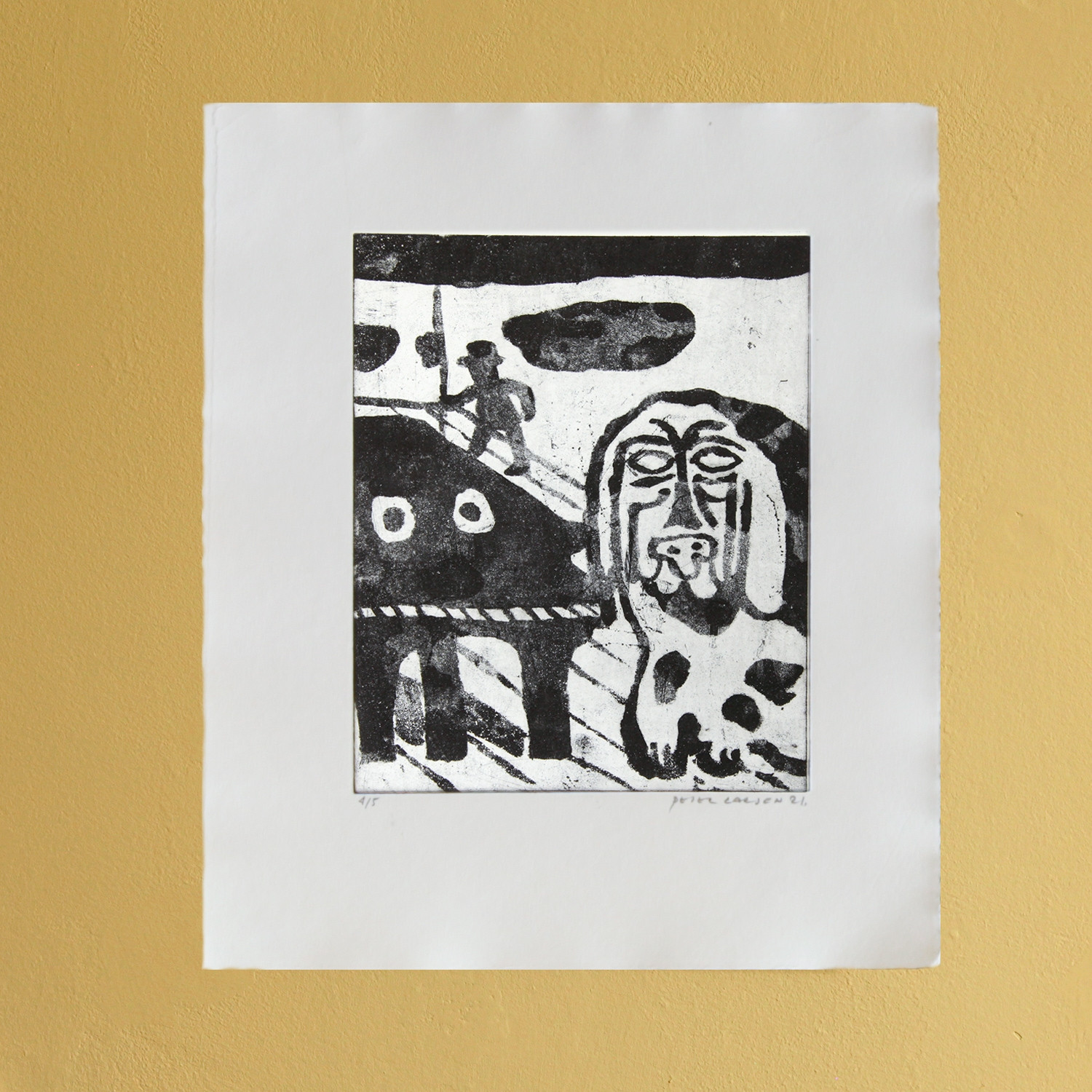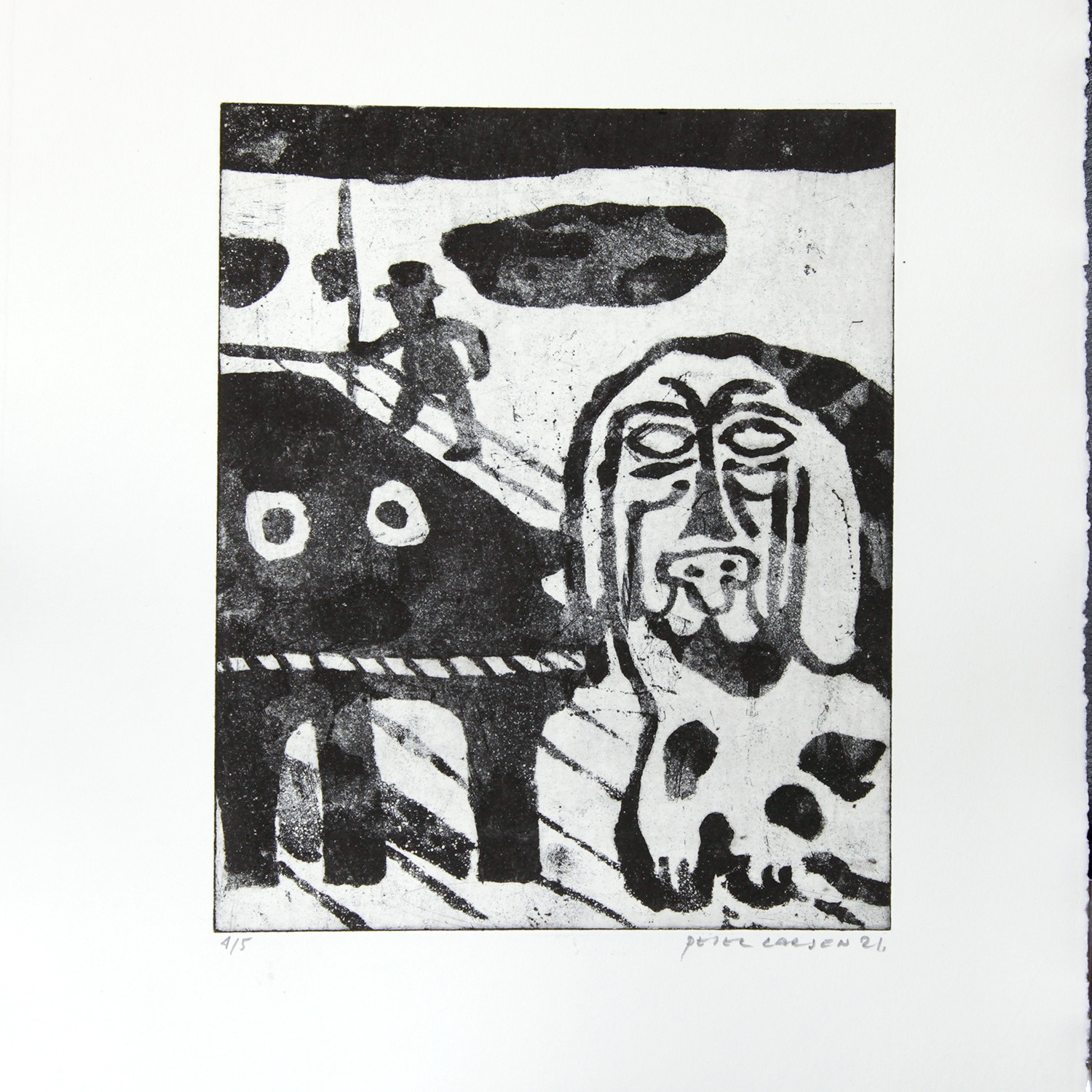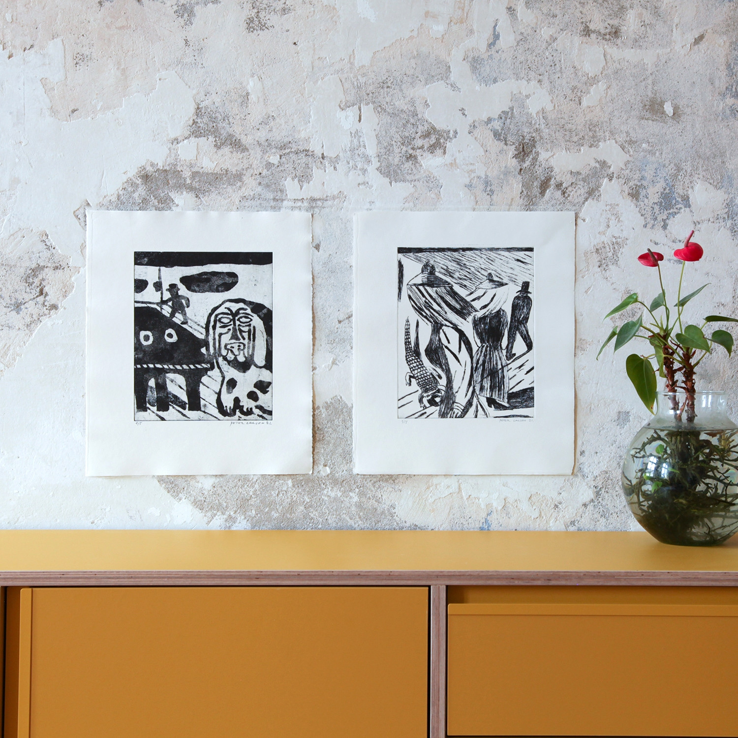 Peter Larsen Ohne Titel (3), 2021 Material Linoldruck auf 300 g bkf Rives Bütten Papier Auflage 50 Maße 32,5 x 38 cm Auflage 5 vorderseitig signiert, nummeriert und datiert Details zum Rahmen Handgefertigter, schwarz gewachster Ahorn-Holzrahmen, 10mm Distanzleiste, Außenmaße ca. 37,7 x 44,2 cm, inkl. Normalglas und rückseitiger Aufhängung Die neue Art, Kunst zu kaufen Handverlesene, exklusive Editionen Limitierte, signierte Auflagen Top-KünstlerInnen und Rising Stars Schnell registrieren, um Preis und Verfügbarkeit zu sehen. Jetzt kostenlos Mitglied werden Bereits Mitglied? Über den Künstler und die Edition „Somehow caught between two worlds, as if awake but stuck in a dream“, so beschreibt die Kopenhagener Galerie Bricks die Werke von Peter Larsen. Und tatsächlich entführen uns die vier signierten und nummerierten Schwarz-Weiß-Linoldrucke „o.T.“ (2021) des dänischen Künstlers in surreale Bilderwelten. Der Teufel, die Schlange, die Chimäre oder auch der Mond und ein Augenpaar – Larsens Arbeiten sind kunstgeschichtlich und mythologisch aufgeladen. Darüber gelingt ihnen ein wundersamer Spagat: Die figurativen Szenen wirken gleichermaßen aus der Zeit gefallen wie absolut gegenwärtig. Menschheitsthemen werden hier verhandelt, mehr noch: alles, was zwischen Himmel, Hölle und Erde passt. Dabei ist Larsen auch ein Meister der Form, der sich allerdings nie in seinem Können verliert, weil er um die Kraft unserer Gedanken weiß. Peter Larsen graduierte 2013 an der Royal Danish Academy of Fine Arts. Seine Werke sind in zahlreichen Einzel- und Gruppenausstellungen in Dänemark wie auch auf internationaler Ebene u.a. in London und Belgrad zu sehen. Ausstellungen (Auswahl) Aktuell sind Werke Peter Larsens in einer Doppelausstellung mit Mugi Takei in der Galerie Pulp in Holyoke (Mass.) zu sehen. Zudem werden Arbeiten von ihm derzeit unter dem Titel „Why the Long Face“ bei FRMD in London gezeigt. „Hocus Pocus Therapy“ hieß die Soloschau des Künstlers, die 2022 in der Galerie Bricks in Kopenhagen stattfand. Lesenswerte Artikel / Links Instagram-Account des Künstlers Künstlerseite von Peter Larsen bei Galerie Bricks, Kopenhagen Mehr Kunst entdecken Juan de la Rica Saltadora, 2022 Bettina Krieg EASE, 2022 Peter Larsen Ohne Titel (1), 2021 Peter Larsen Ohne Titel (2), 2021 Peter Larsen Ohne Titel (4), 2021 Peter Larsen Ohne Titel (5), 2021 Peter Larsen Ohne Titel (6), 2021