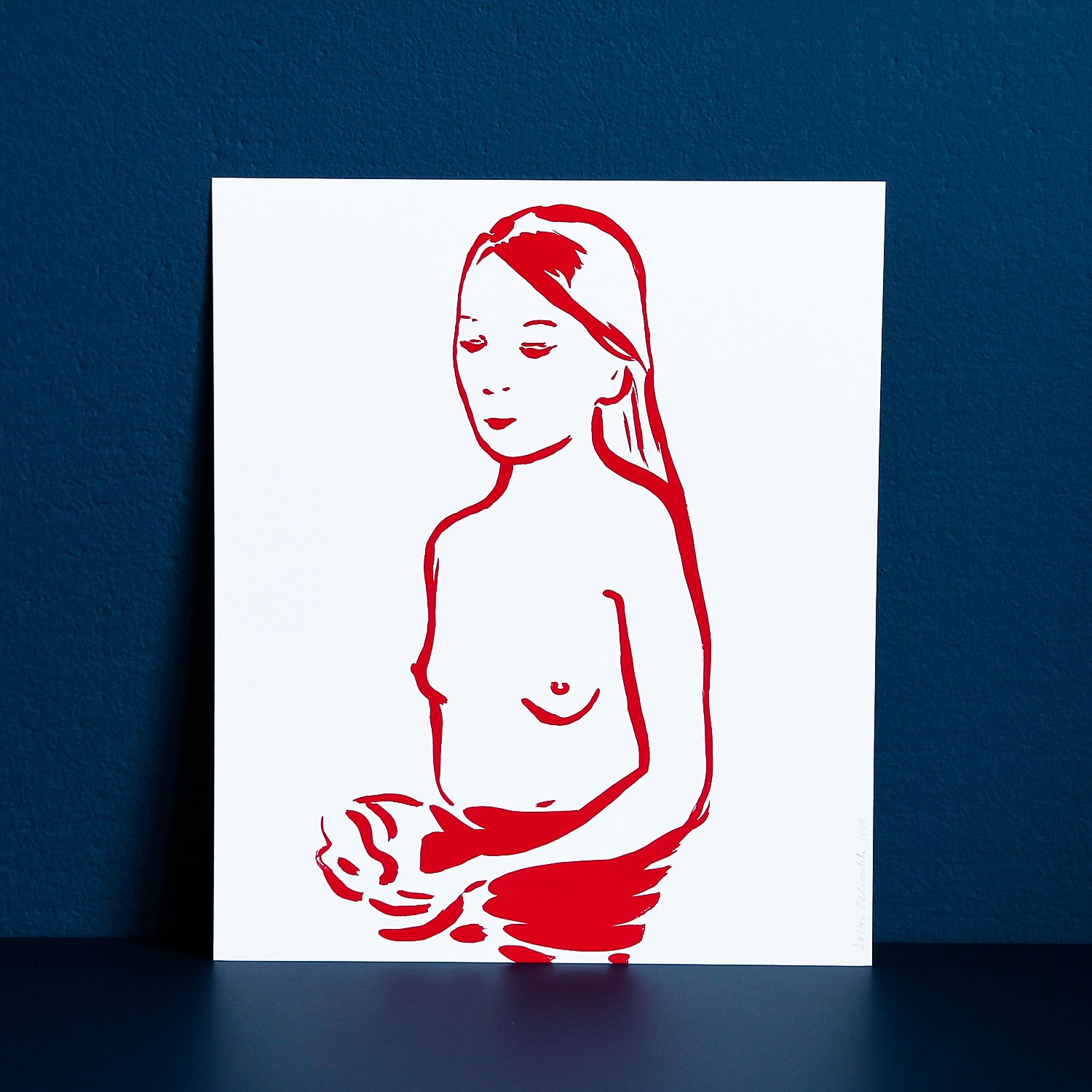 „Rougir“, deutsch „erröten“, so heißt eine ganze Serie von Siebdrucken der Künstlerin Françoise Pétrovitch. Mit der Grundfarbe Rot, einer Farbe, die Emotionen und Gefahr symbolisiert, wurde diese Arbeit gedruckt. Weiß ist die zweite Hauptfarbe des Bildes, nicht nur als Hintergrund.