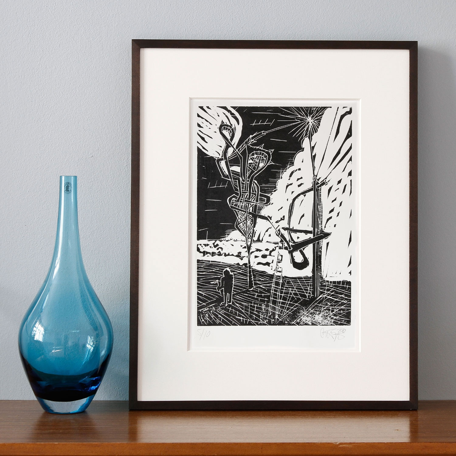 Philip Grözinger Ohne Titel IV, 2016 Material Linolschnitt Herstellungsmethode vorderseitig handschriftlich signiert und nummeriert Auflage 10 Maße 37,3 x 48,2 cm Details zum Rahmen Handgefertigter bothor gewachster Holzrahmen, inkl. Passepartout, Außenmaße ca. 38,7 x 49,6 cm. Inkl. rückseitiger Hängeleiste, staubdicht verschlossen. Die neue Art, Kunst zu kaufen Handverlesene, exklusive Editionen Limitierte, signierte Auflagen Top-KünstlerInnen und Rising Stars Schnell registrieren, um Preis und Verfügbarkeit zu sehen. Jetzt kostenlos Mitglied werden Bereits Mitglied? Über die Edition Als Kind las sich Philip Grözinger durch die Science-Fiction-Regale der Stadtbibliothek in Braunschweig. Hier entdeckte der spätere Künstler auch „Solaris“-Autor Stanisław Lem für sich – um später bei den Dystopien russischer Filmemacher aus den 70er Jahren zu landen. Seinen Bilderwelten sind diese frühen Leidenschaften auch heute noch anzusehen. Merkwürdige Wesen und Maschinen bevölkern die apokalyptisch anmutenden Landschaften in seinen handsignierten Linolschnitten, die Werke mit einem großen Erzählpotenzial sind. Grözinger selbst beschreibt den künstlerischen Schaffensprozess als eine Reise nach innen: „Ich muss meinen Weg erfühlen, als wäre ich in einem Labyrinth“, so der Künstler in einem „artfridge“-Interview. „Dieses Den-Weg-Erfühlen ist es, was mir das größte Vergnügen bereitet.“ Über den Künstler Der in Berlin lebende, international bekannte Künstler Philip Grözinger wurde 1972 in Braunschweig geboren. Er studierte freie Kunst an der Hochschule für Bildende Künste Braunschweig. Sein Werk umfasst Malerei, Zeichnung, Grafik und Skulptur. Grözingers künstlerisches Universum ist reich an Figuren, Kreaturen, Hybriden zwischen Mensch und Maschine. Als Künstler ist er ein Erfinder. Seine Bilder sind Visionen einer anderen Welt. Sie erzählen uns von der Zukunft und von den Weiten des Weltraumes gleich einem visuellen Science-Fiction-Roman. Humorvoll, sarkastisch, poetisch, so lässt sich Grözingers Werk beschreiben. Sein Farbauftrag ist expressiv, sein Kolorit mal grell, mal zurückhaltend. 2014 nahm er an einem „Artist in Residence“-Programm des CCA Andratx, Mallorca, teil. Ausstellungen (Auswahl) 2018, Heldentage. Dekaden voller Mythen und Mysterien, Kemenate Hagenbrücke, Braunschweig 2017, The Awakening of the Somnambulist, Galerie Maïa Muller, Paris 2016, From Here to Now and Back Again, Galerie Sexauer, Berlin 2014, A Sense of Delight, Kunstverein Dillingen, Dillingen 2013, Sunny Side Up, Galerie Christian Ehrentraut, Berlin 2012, Why Are You So Odd?, Galerie Mikael Andersen, Kopenhagen 2011, Ebenbein und Elfenholz, Galerie Christian Ehrentraut, Berlin Lesenswerte Artikel / Links Website von Philip Grözinger Werke von Philip Grözinger auf artsy.net Interview mit Philip Grözinger auf artfridge.de Videokunst von Philip Grözinger Mehr Kunst entdecken Philip Grözinger Ohne Titel I, 2013 Philip Grözinger Ohne Titel II, 2016 Philip Grözinger Ohne Titel III, 2016 Philip Grözinger Ohne Titel V, 2016 Simone Haack Maskenmann, 2012 Simone Haack Die Andere, 2012