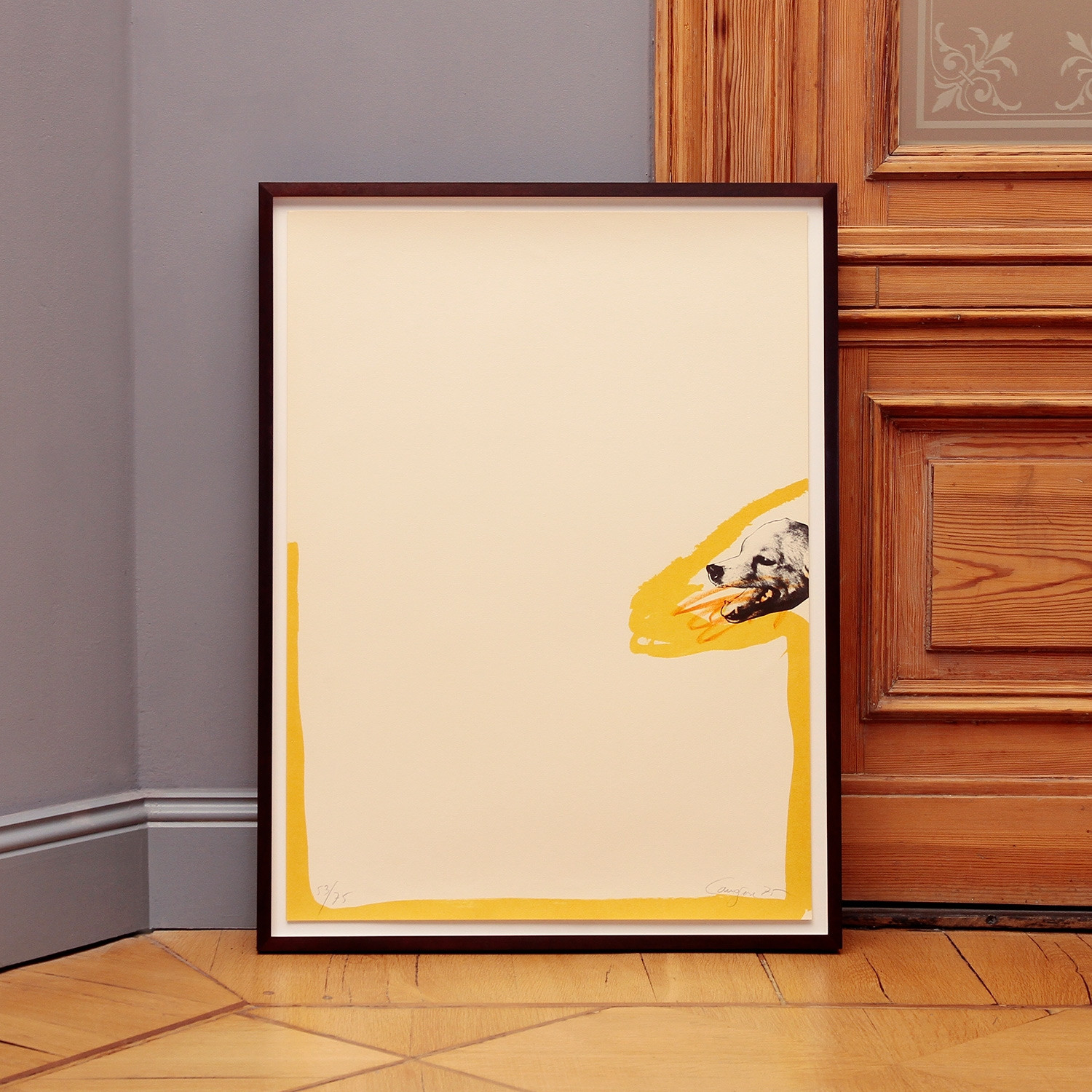 Rafael Canogar Homenaje a Goya (Huldigung an Goya), 1975 Material Farblithografie mit Fotolithografie Herstellungsmethode vom Künstler auf der Vorderseite signiert und nummeriert Auflage 75 Maße Papier 76 x 56 cm, Platte 76 x 56 cm Details zum Rahmen Handgefertigter nussbaum dunkel gewachster Ahorn-Holzrahmen, mit 8mm Distanzleiste, das Blatt wird hochgestellt. Außenmaße ca. 82 x 62 cm. Inkl. Rückseitiger Aufhängung, staubdicht verschlossen. Die neue Art, Kunst zu kaufen Handverlesene, exklusive Editionen Limitierte, signierte Auflagen Top-KünstlerInnen und Rising Stars Schnell registrieren, um Preis und Verfügbarkeit zu sehen. Jetzt kostenlos Mitglied werden Bereits Mitglied? Anfrage senden Über die Edition „Es creo una de las obras más elegantes […].“ Der spanische Maler und Bildhauer Rafael Canogar hält „El Perro (Der Hund)“ von Francisco de Goya für das eleganteste und brillanteste Werk aus dessen Reihe der zwischen 1820 und 1823 entstandenen „Pinturas Negras“, der sogenannten Schwarzen Gemälde. In seiner „Homenaje a Goya (Huldigung an Goya)“ bezieht sich Canogar auf ebendieses Gemälde, das heute im Museo del Prado in Madrid hängt. Für ihn ist es das erste Werk der westlichen Welt, das dem Symbolismus zugeschrieben werden kann – einer Kunstrichtung, die ihre subjektiven, mehrdeutigen, teils absichtlich rätselhaften Botschaften mithilfe von Symbolen vermittelte und so umso mehr zum Nachdenken anstiftete. „Geheimnisvoll“ sei dieses Werk – und wie Goya selbst lässt auch Canogar viel Raum für die Fantasie des Betrachters. Wen adressiert der Hund, was ist ihm widerfahren, für was steht er hier? Alarmiert scheint er, und entstanden ist die handsignierte Farblithografie tatsächlich in aufwühlenden Zeiten: im Jahr 1975, in dem die spanische Franco-Diktatur endete. Seitdem scheint das Werk kein bisschen gealtert, mühelos lässt sich der zart rosa grundierte Freiraum des Bildes gedanklich füllen mit den Herausforderungen unserer Tage, mit den Zumutungen und Möglichkeiten unserer Zeit. Über den Künstler Rafael Canogar, 1935 in Toledo geboren, war Mitbegründer der Künstlerbewegung „El Paso“ und etablierte das Informel als geeignetes Ausdrucksmittel für die spanische Avantgarde. Der vielfach ausgezeichnete Künstler ist international in bedeutenden Sammlungen vertreten, darunter das New Yorker MoMA, das Museo Nacional Centro de Arte Reina Sofía in Madrid, das National Art Museum of China ‒ Ludwig Hall of International Art in Peking sowie das Museum für Moderne Kunst in Frankfurt am Main. Ausstellungen (Auswahl) Werke von Rafael Canogar waren Teil der Ausstellung „New Spanish Painting and Sculpture“ im Jahr 1960 im New Yorker MoMA: https://www.moma.org/calendar/exhibitions/2555 1972 gewann er den Ersten Preis der IX. Biennale von São Paulo, Brasilien. Canogar war mehrfach auf der Biennale in Venedig vertreten. So beteiligte er sich auch 1958 an der für die internationale Wahrnehmung der spanischen Kunst nach 1945 wegweisenden Ausstellung im Spanischen Pavillon: https://www.fg-art.org/en/exhibition-loans/venezia-1958-a-selection-of-artworks-from-the-spanish-pavill Lesenswerte Artikel / Links Webseite über Rafael Canogar Rafael Canogar im Jahr 1982 über Goyas Wandgemälde „El Perro (Der Hund)“, auf das er sich in seiner Grafik bezieht Mehr Kunst entdecken Pipilotti Rist Du wirst sorglos sein, 2015 Pat Rosenmeier Delta #2, 2008 Martin Parr Be Bold With Bananas (Collector´s Edition), 2015