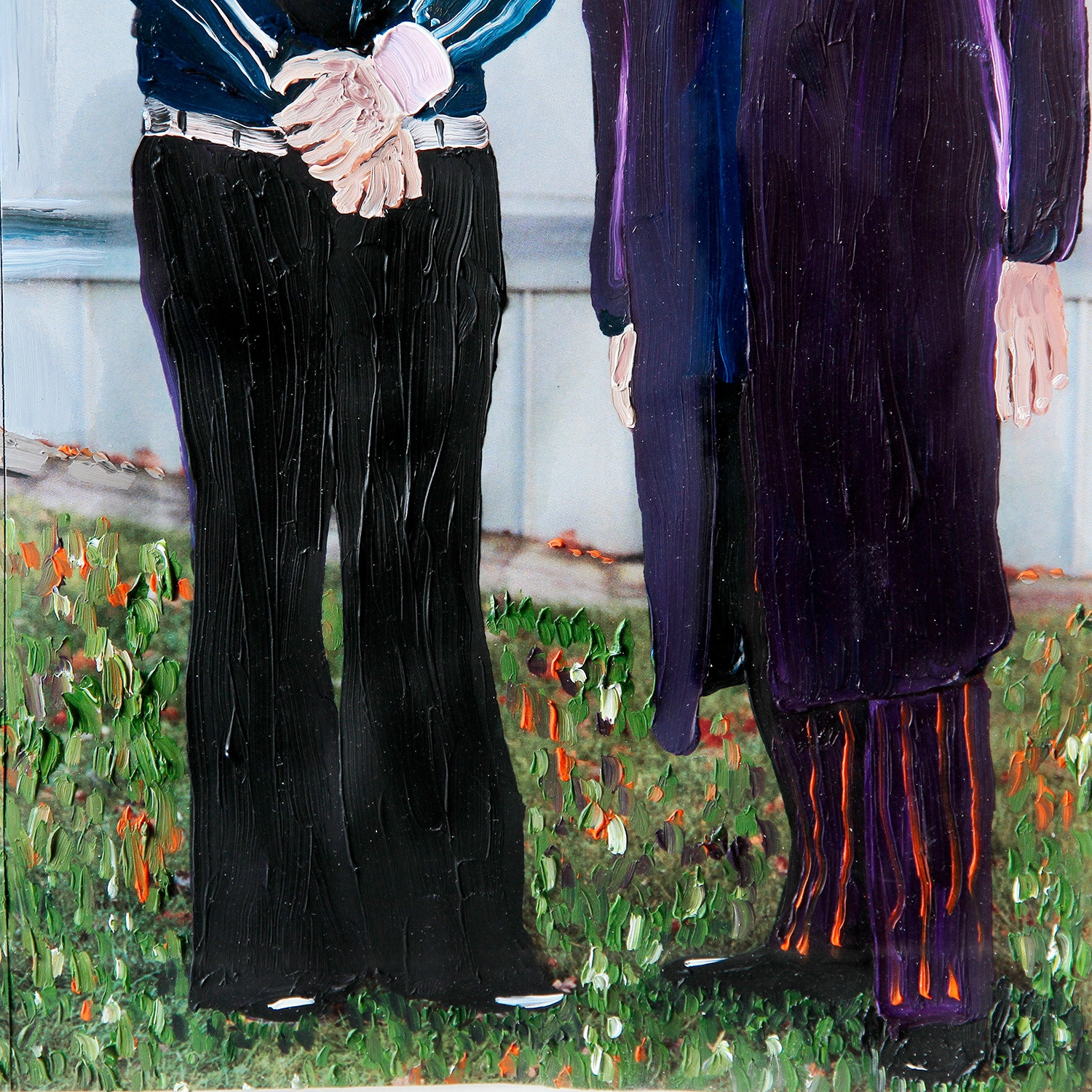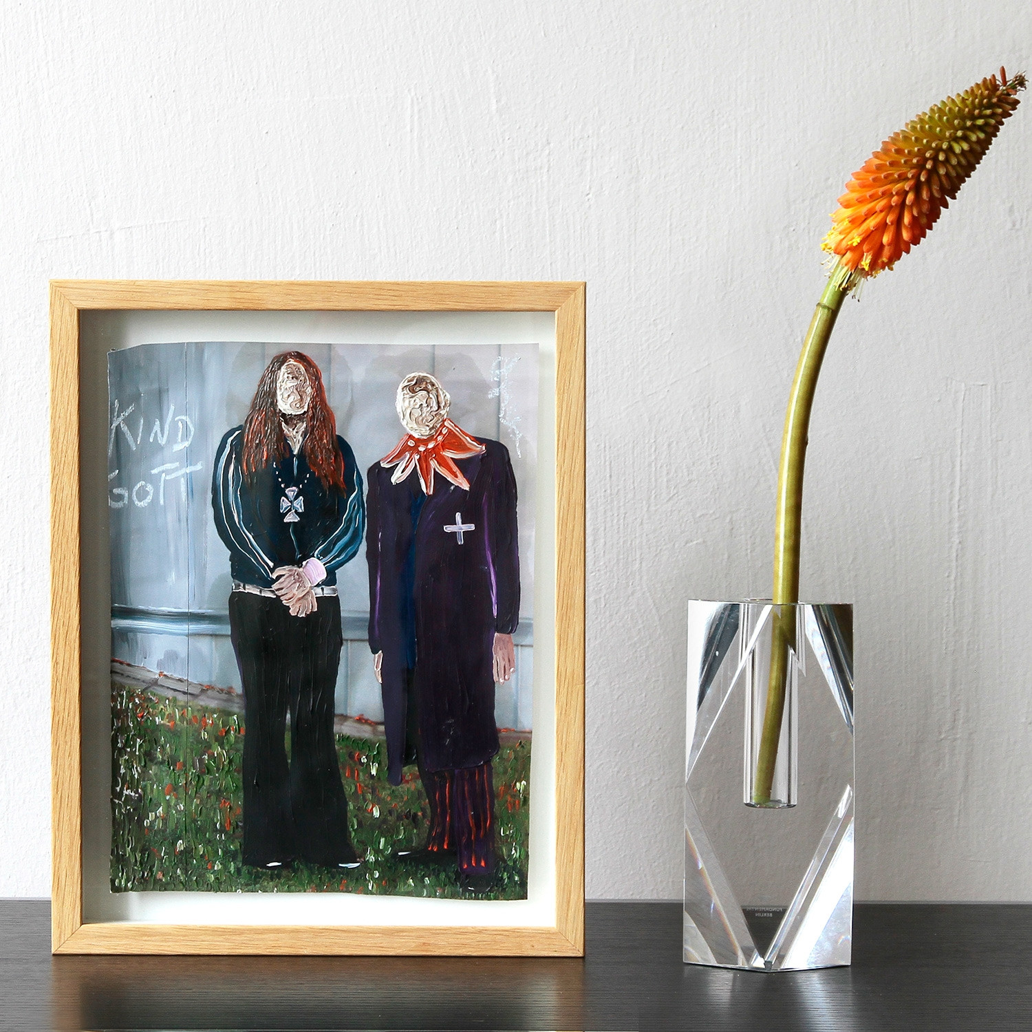 René Holm Kind Gott ‒ Jonathan Meese und Jörg Immendorff, 2019/2020 Material Öl auf Magazin-Papier Herstellungsmethode rückseitig auf Rahmen signiert, betitelt, datiert Auflage 1 Maße Blattmaß: 28 x 22 cm Rahmenmaß: 33 x 26,7 cm Details zum Rahmen Handgefertigter, gewachster Natur-Eichen-Holzrahmen, 8mm Distanzleiste, Außenmaße ca.33 x 26,7 cm, inkl. rückseitiger Aufhängung, staubdicht verschlossen. Die neue Art, Kunst zu kaufen Handverlesene, exklusive Editionen Limitierte, signierte Auflagen Top-KünstlerInnen und Rising Stars Schnell registrieren, um Preis und Verfügbarkeit zu sehen. Jetzt kostenlos Mitglied werden Bereits Mitglied? Über das Werk Im Jahr 2012 hat René Holm damit begonnen, Seiten aus Magazinen herauszutrennen und mit Ölfarbe zu bemalen. Seine Auswahl ist rein subjektiv, Material wird, was ihn interessiert. Oft sind es Porträts anderer Künstler, aber auch Modefotografien und zeithistorische Abbildungen können darunterfallen. Die einen komplettiert Holm einfach mit einem Extrafarbüberzug, anderen fügt er malerisch Kommentare hinzu, die farbig markierten Backsteine im Hintergrund von „Partners in Crime“ etwa, oder indem er Augen oder Gesichter unkenntlich macht. So legt er in „Second Option“ einen schwarzen Balken über Andy Warhols Blick und lässt in „Kind Gott“ die Züge von Jonathan Meese und Jörg Immendorff gleich ganz verschwimmen. In den Arbeiten manifestiert sich Holms persönliche Auseinandersetzung mit Kunstgeschichte und Zeitgeist, mit Hochkultur und Pop; die Titel bieten weitere narrative Anknüpfungspunkte. Die Art und Weise, in der Holm dabei „High and Low“ nonchalant miteinander vermengt, ähnelt nicht ohne Grund dem Sampling, spiegelt sich darin doch sein eigener Zugang zur Kunst, seine Biografie. Über den Künstler René Holms künstlerische Laufbahn begann auf der Straße: „Chung“ nannte sich der 1967 geborene Künstler, als er noch mit Graffitis Wände, Mauern, Brücken und Gebäude seiner dänischen Heimatstadt Esbjerg markierte ‒ auf so bemerkenswerte Weise übrigens, dass er 1985 die lokale Graffiti-Meisterschaft gewann. Erst mit über 30 absolvierte er ein Studium an der Kunstakademie in Aarhus. Inzwischen hat sich Holm als Künstler längst etabliert, stellt seine Kunst international in Galerien, Museen und auf Messen aus. In Dänemark wird er von den Galerien Benoni und Franz Pedersen vertreten, in Berlin, wo er seinen zweiten Wohnsitz hat, von Selected Artists. Ausstellungen (Auswahl) Zuletzt hatte René Holm eine Einzelausstellung in der Galleri Benoni in Kopenhagen und war in Gruppenausstellungen in der Kunsthalle Feldbach und der Alfred Kubin Galerie in Wernstein/Inn vertreten. Ende Oktober eröffnet im Frederikshavn Kunstmuseum die Duoausstellung „Embrace the Darkness“, die Werke von ihm und Frodo Mikkelsen zeigt. Lesenswerte Artikel / Links René Holms Website René Holm bei Selected Artists René Holm bei Artland Magazine René Holm bei Galleri Benoni, Dänemark Mehr Kunst entdecken René Holm Second Option, 2020 René Holm Partners in Party ‒ Jack Nicholson + David Hockney 1978, 2020 René Holm Totale Schönheit, 2020 René Holm Blinded by Brush Strokes, 2020