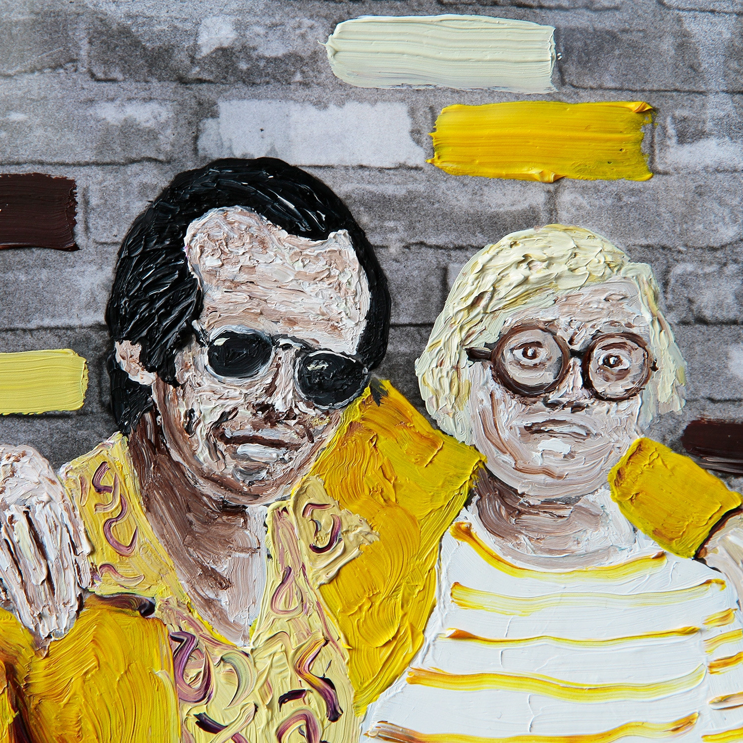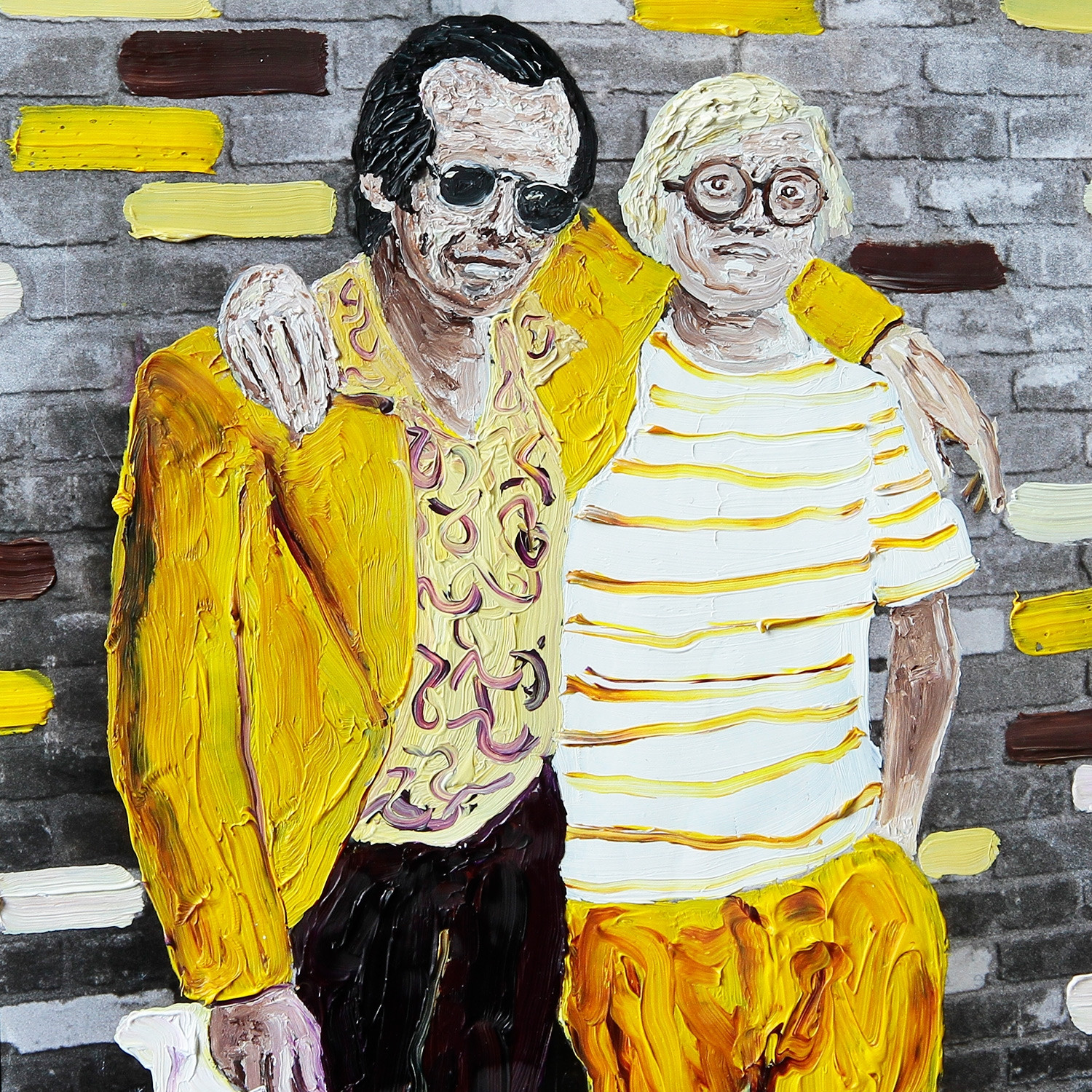 René Holm Partners in Party ‒ Jack Nicholson + David Hockney 1978, 2020 Material Öl auf Magazin-Papier Herstellungsmethode rückseitig auf Rahmen signiert, betitelt, datiert Auflage 1 Maße Blattmaß: 29 x 22 cm Rahmenmaß: 35,5 x 28,5 cm Details zum Rahmen Handgefertigter, gewachster Natur-Eichen-Holzrahmen, 8mm Distanzleiste, Außenmaße ca. 35,5 x 28,5 cm, inkl. rückseitiger Aufhängung, staubdicht verschlossen. Die neue Art, Kunst zu kaufen Handverlesene, exklusive Editionen Limitierte, signierte Auflagen Top-KünstlerInnen und Rising Stars Schnell registrieren, um Preis und Verfügbarkeit zu sehen. Jetzt kostenlos Mitglied werden Bereits Mitglied? Über das Werk Im Jahr 2012 hat René Holm damit begonnen, Seiten aus Magazinen herauszutrennen und mit Ölfarbe zu bemalen. Seine Auswahl ist rein subjektiv, Material wird, was ihn interessiert. Oft sind es Porträts anderer Künstler, aber auch Modefotografien und zeithistorische Abbildungen können darunterfallen. Die einen komplettiert Holm einfach mit einem Extrafarbüberzug, anderen fügt er malerisch Kommentare hinzu, die farbig markierten Backsteine im Hintergrund von „Partners in Party“ etwa, oder indem er Augen oder Gesichter unkenntlich macht. So legt er in „Second Option“ einen schwarzen Balken über Andy Warhols Blick und lässt in „Kind Gott“ die Züge von Jonathan Meese und Jörg Immendorff gleich ganz verschwimmen. In den Arbeiten manifestiert sich Holms persönliche Auseinandersetzung mit Kunstgeschichte und Zeitgeist, mit Hochkultur und Pop; die Titel bieten weitere narrative Anknüpfungspunkte. Die Art und Weise, in der Holm dabei „High and Low“ nonchalant miteinander vermengt, ähnelt nicht ohne Grund dem Sampling, spiegelt sich darin doch sein eigener Zugang zur Kunst, seine Biografie. Über den Künstler René Holms künstlerische Laufbahn begann auf der Straße: „Chung“ nannte sich der 1967 geborene Künstler, als er noch mit Graffitis Wände, Mauern, Brücken und Gebäude seiner dänischen Heimatstadt Esbjerg markierte ‒ auf so bemerkenswerte Weise übrigens, dass er 1985 die lokale Graffiti-Meisterschaft gewann. Erst mit über 30 absolvierte er ein Studium an der Kunstakademie in Aarhus. Inzwischen hat sich Holm als Künstler längst etabliert, stellt seine Kunst international in Galerien, Museen und auf Messen aus. In Dänemark wird er von den Galerien Benoni und Franz Pedersen vertreten, in Berlin, wo er seinen zweiten Wohnsitz hat, von Selected Artists. Ausstellungen (Auswahl) Zuletzt hatte René Holm eine Einzelausstellung in der Galleri Benoni in Kopenhagen und war in Gruppenausstellungen in der Kunsthalle Feldbach und der Alfred Kubin Galerie in Wernstein/Inn vertreten. Ende Oktober eröffnet im Frederikshavn Kunstmuseum die Duoausstellung „Embrace the Darkness“, die Werke von ihm und Frodo Mikkelsen zeigt. Lesenswerte Artikel / Links René Holms Website René Holm bei Selected Artists René Holm bei Artland Magazine René Holm bei Galleri Benoni, Dänemark Mehr Kunst entdecken René Holm Second Option, 2020 René Holm Kind Gott ‒ Jonathan Meese und Jörg Immendorff, 2019/2020 René Holm Totale Schönheit, 2020 René Holm Blinded by Brush Strokes, 2020