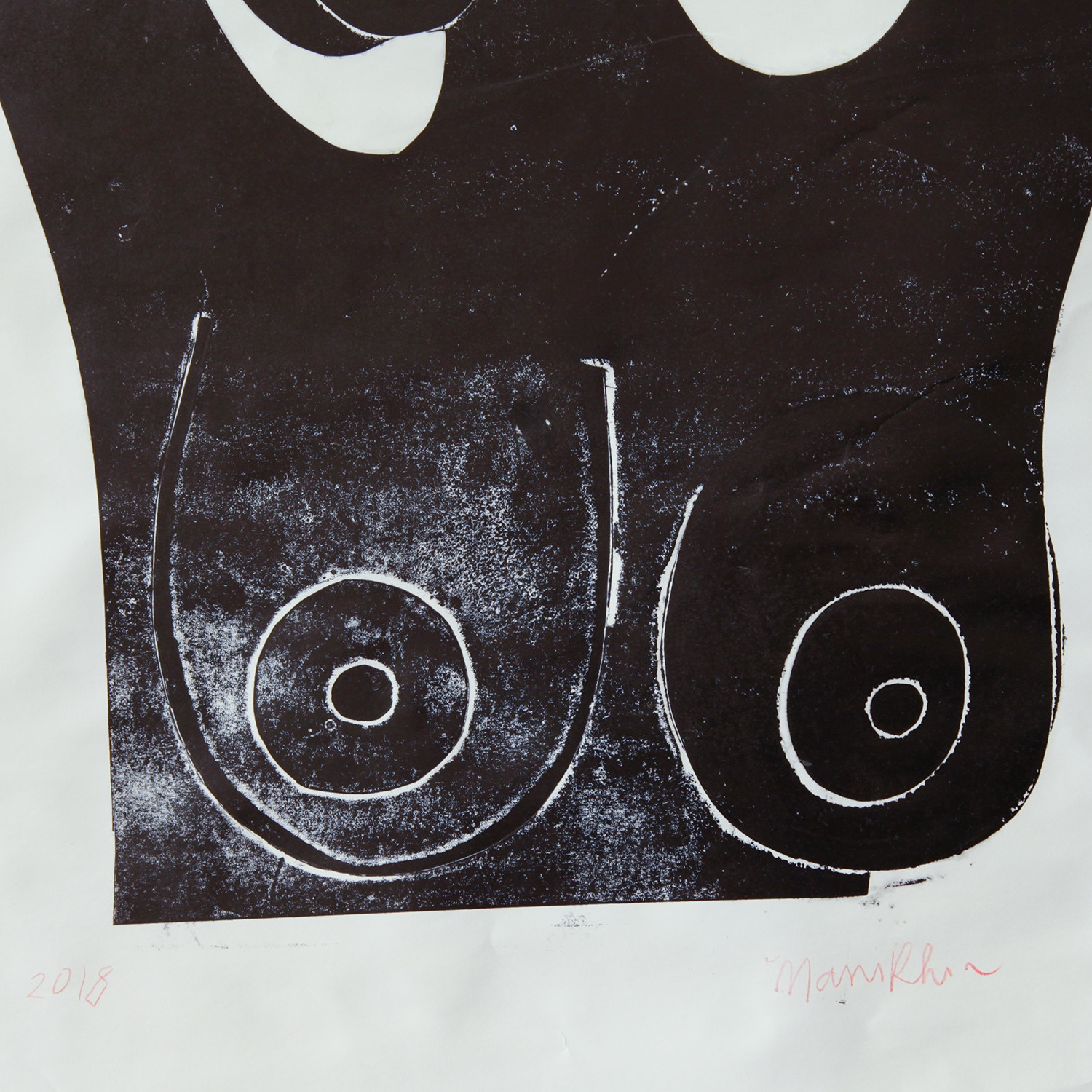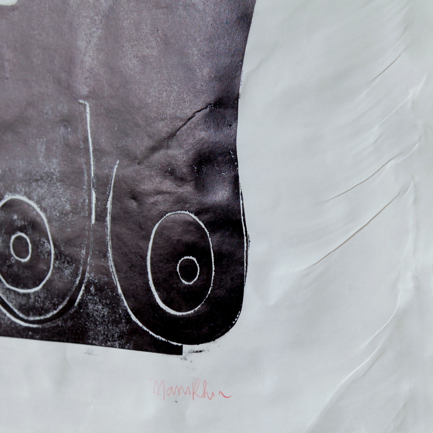 Seine Serie Black Ladies aus dem Jahr 2018, die wir hier in Teilen präsentieren, ist auf den ersten Blick weit weg von der überbordenden Farbwucht seiner Ölbilder. Sorgfältig gedruckt auf vintage paper, beeindrucken sie in ihrem reduzierten Schwarz-Weiß mit ungewohnter Archaik. Trotzdem ist der unverwechselbare Stil präsent. Mit der ihm typischen erotischen Offenheit feiert Manikhin jenseits aller konventionellen Schönheitsideale die weibliche Form im Überschwang: Das Haar fließt frei, das Bein wird scheinbar mühelos über den Kopf geschwungen, der Blick erwidert selbstbewusst den des Betrachters. In eleganter Linienführung ziehen diese Monoprints ihre Faszination jedoch immer aus einem stilsicheren Formwillen und der nie aufgelösten Spannung zwischen Freiheit und Reduktion.