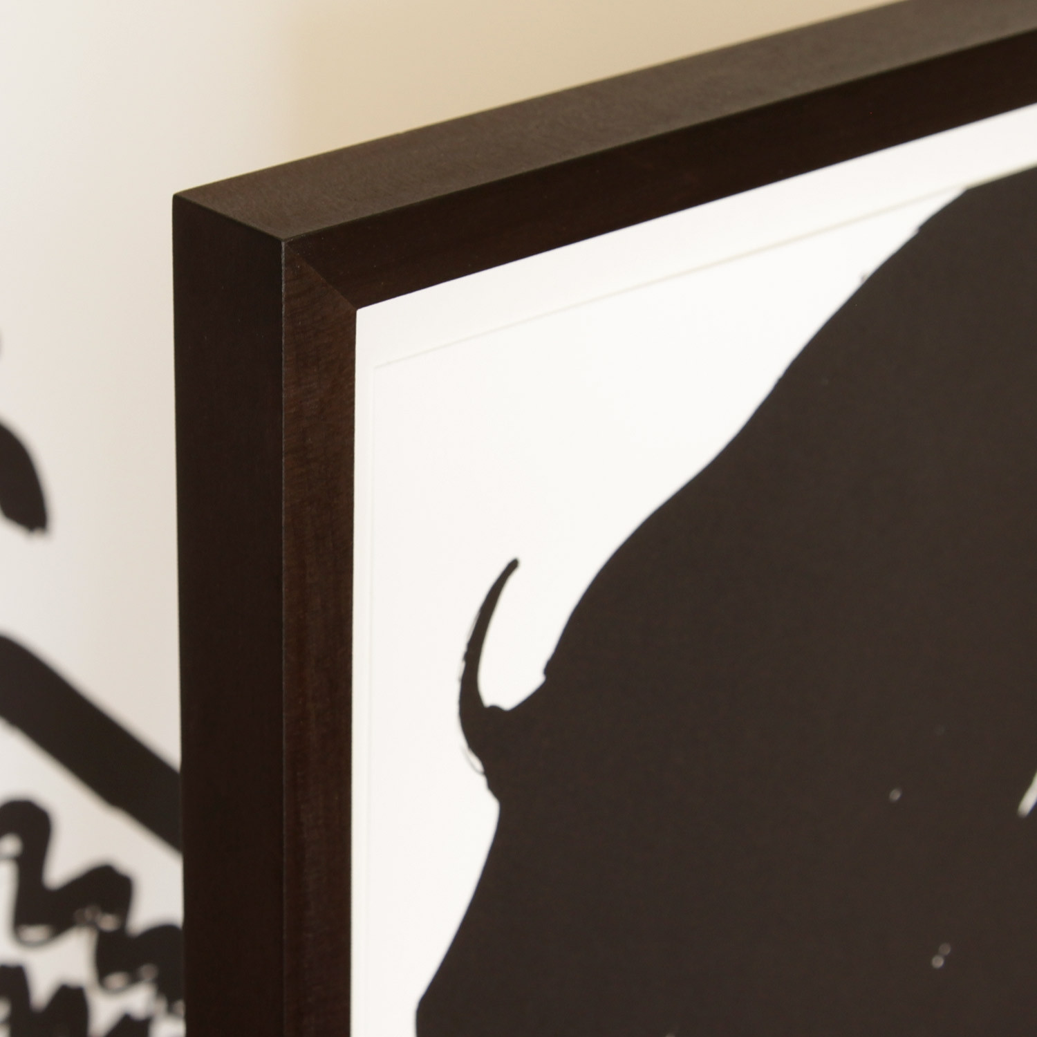Handgefertigter Ahorn-Holzrahmen, schwarz gebeizt und gewachst, Außenmaße ca. 68,2 x 48,2 cm, Normalglas, inkl. Distanzleiste und rückseitiger Aufhängung, staubdicht verschlossen.
