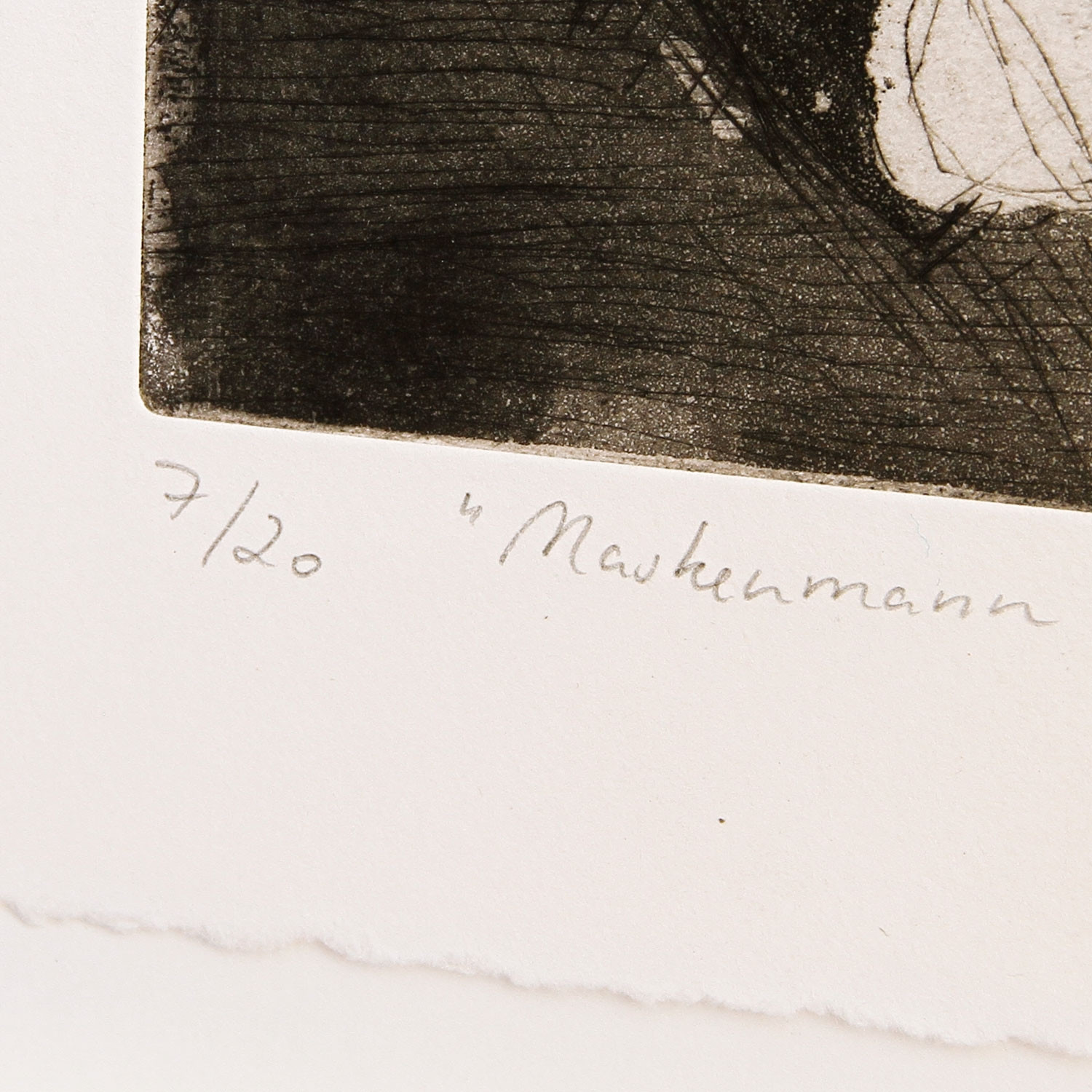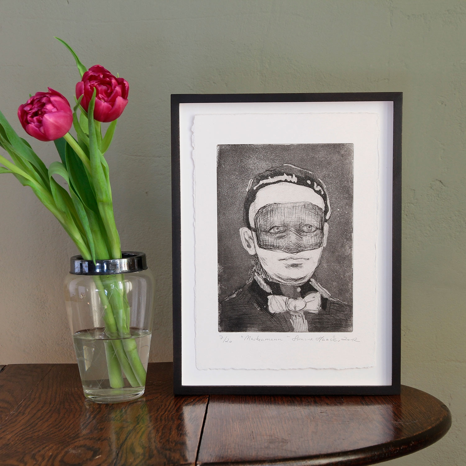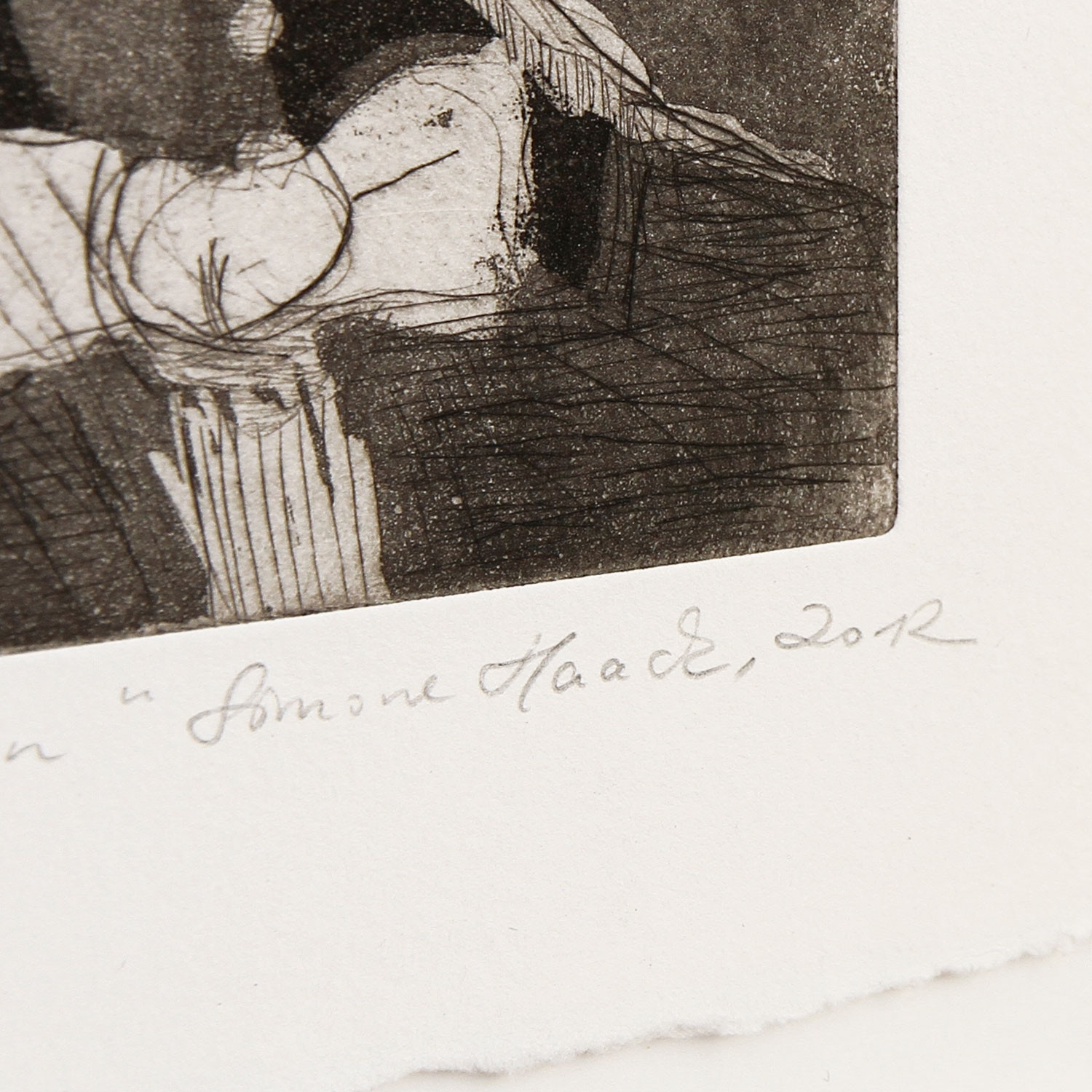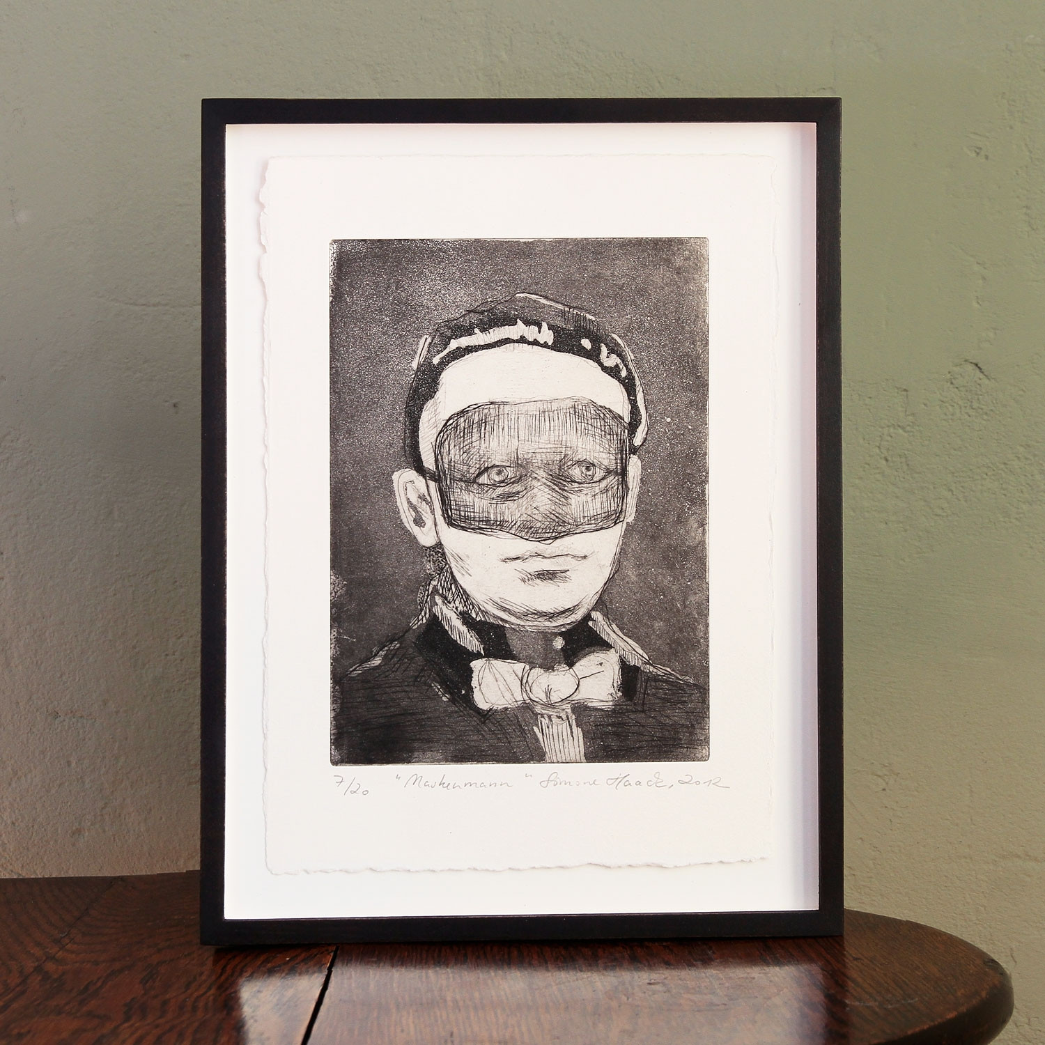 Unter den Top-10-Alben der Künstlerin Simone Haack befindet sich eines des gerade verstorbenen Musikers Scott Walker: „Scott 3“. Vom Cover schaut er uns, Kinn in die Hand gestützt, aus der Pupille des weit geöffneten Auges einer Frau an. Diese Ambivalenz findet sich auch in Haacks eigenen Werken wieder. Betrachtet uns „Die Andere“ nur selbstbewusst oder liegt nicht auch Vorsicht in ihrem von gleißendem Licht in Szene gesetzten Gesicht? Und wie ist der leere Blick des „Maskenmannes“ zu deuten, bei dessen Betrachtung uns ein undefinierbarer Schauer überkommt? Haacks Radierungen sind – wie ihre Malereien – handwerklich meisterhaft umgesetzt. Sie betören und verunsichern uns gleichzeitig, und das auf eine herausfordernde Art und Weise, wie nur gute Kunst es kann.