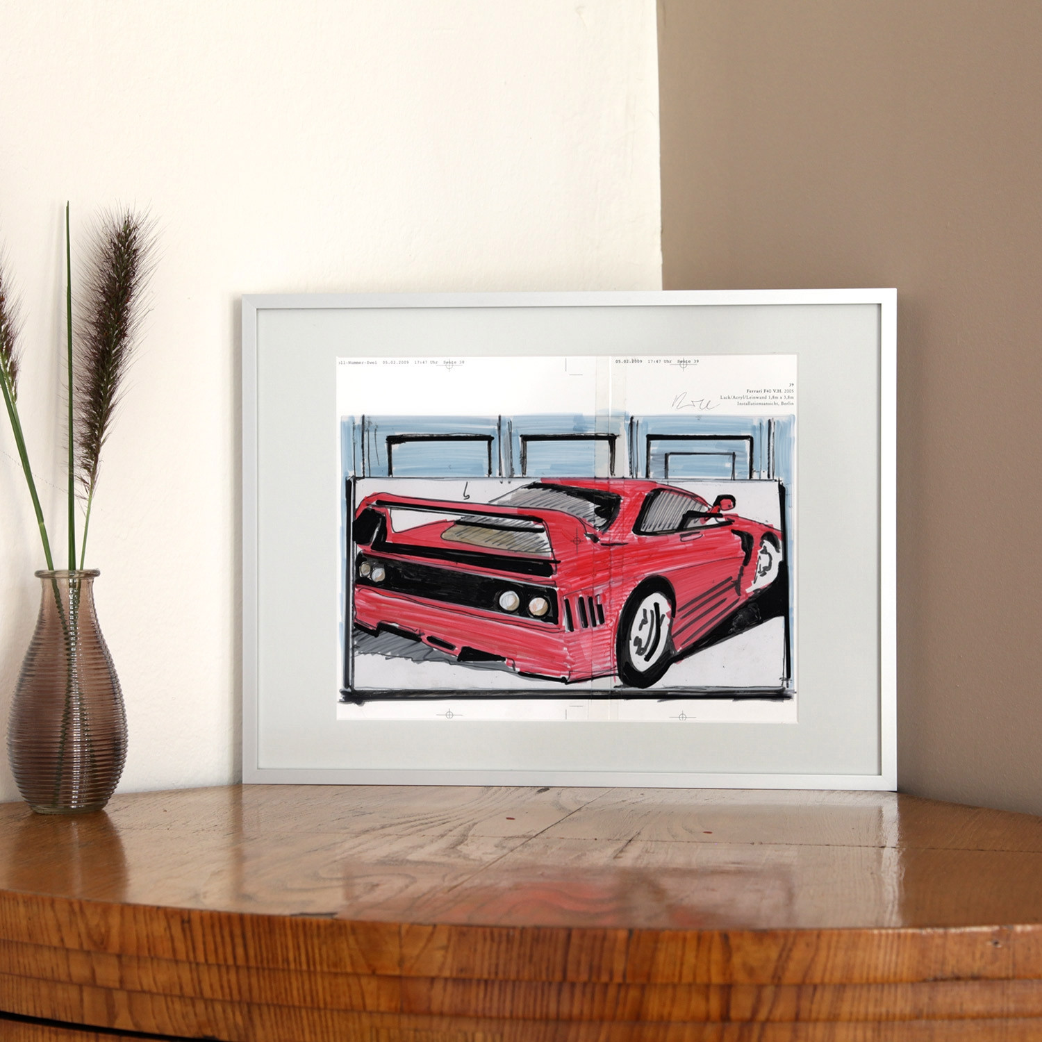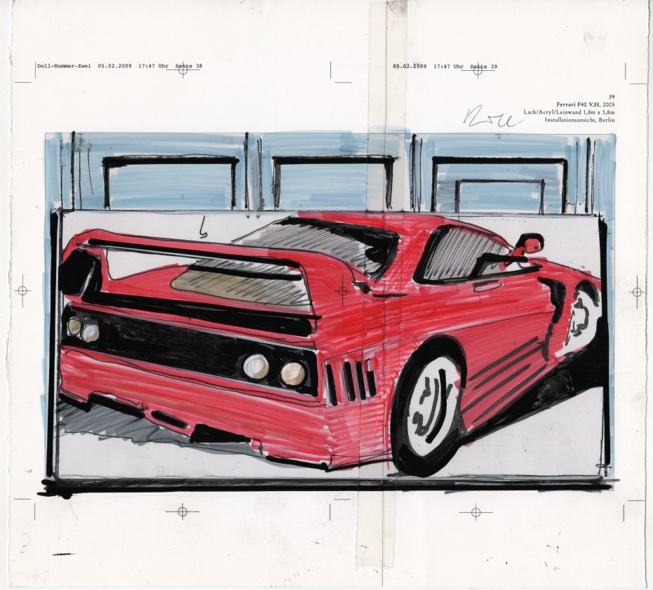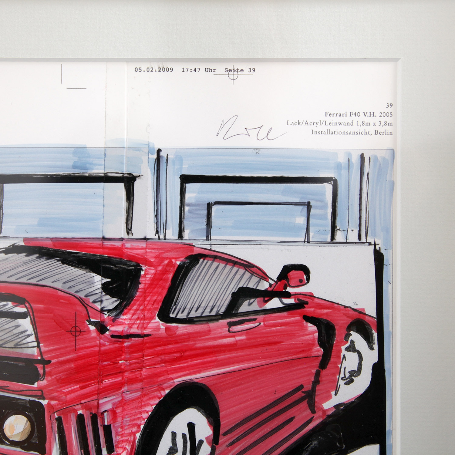 Tatjana Doll Nr. 39, Ferrari F40 V.H. , 2006/2021 Material Gescannte Handzeichnung, ausgedruckt als Katalogproof, weitergezeichnet, bemalt und handbearbeitet Auflage 1 Maße ca. 31,2 x 41 cm handsigniert inkl. Katalog: Tatjana Doll, DOLL, 2005, anlässl. der Ausstellung "Bier Für Öl + Ein Blinder Passagier" im Kunstverein Bremerhaven, 2005 Details zum Rahmen Inkl. HALBE-Rahmen in Silber + Passepartout, Größe ca. 32 x 42 cm Die neue Art, Kunst zu kaufen Handverlesene, exklusive Editionen Limitierte, signierte Auflagen Top-KünstlerInnen und Rising Stars Schnell registrieren, um Preis und Verfügbarkeit zu sehen. Jetzt kostenlos Mitglied werden Bereits Mitglied? Über die Werke Der rote Ferrari ist auch eins der Motive in den Unikaten, die auf der Grundlage des Katalogs „DOLL“ aus dem Jahr 2005 entstanden sind. Darin sehen wir Tatjana Dolls Malereien in Form von Collagen in den städtischen Raum montiert. Die linearen Edding-Zeichnungen stammen aus dem Jahr darauf, zunächst waren sie gedacht als Wiederholung des Gedruckten in Schwarz-Weiß, wurden dann gescannt und wiederum als Print aufs Papier gebracht. Die Künstlerin hat sie später manuell durch malerisch-farbige Flächen ergänzt. Zudem holte sie den urbanen Raum dieses Mal in die Zeichnung und die Malerei hinein. „So, als wäre er wie die Malereien, die darin platziert sind, genauso ausgedacht“, erklärt Doll. Wer sich auf ihre Arbeiten einlässt, sollte sich also wappnen für das Wechselspiel zwischen Kunst und Wirklichkeit. „Die Piktogrammschilder ‚Caution‘ habe ich gemalt, um vor meinen eigenen Bildern zu warnen“, sagt sie auch. Die Warnung lässt sich aber ebenso als Aufforderung verstehen, die eigene Vorstellungskraft mindestens so wichtig zu nehmen wie die vorformulierten visuellen Erzählungen, von denen wir umgeben sind. Tatjana Dolls mutiges Werk macht vor, wie das geht. Über die Künstlerin Der Malerei traut Tatjana Doll einiges zu. „Wenn ich einen Ferrari male, dann sollte es so sein, als öffnete ich eine große Lackdose und er würde zu einem Auto schon in dem Moment, in dem ich den Lack auf die Leinwand gieße, nicht durch Ingenieurskenntnisse, sondern einfach durch das Material und die Farbe“, sagt die Künstlerin. Die Grenze zwischen Abbild und Wirklichkeit zieht sie nicht entlang der materiellen Realität. Oft übersteigt die Größe der Alltagsgegenstände in ihrer Kunst die ‚wahren‘ Maße bei Weitem. Genauso wie die Symbolkraft eines Ferraris seine Funktion als Rennwagen und Automobil bei Weitem übertrifft. „Ich wollte malen, was da ist“, erklärt Doll und holt auf diese Weise eine Welt in die Kunst, die uns alle umgibt. Bei Doll ist der Schaffensprozess als ein Akt der subjektiven Aneignung zu verstehen, der Gegenstand an sich tritt hinter das Bild zurück. Möglich also, dass wir in dem LKW-Rücklicht plötzlich nur noch einen gelben Lackfleck sehen – und fernab vorgegebener Denkmuster auf produktivste Art und Weise auf uns selbst zurückgeworfen sind. Ausstellungen (Auswahl) Tatjana Doll stellt als Rompreisträgerin der Deutschen Akademie Rom Villa Massimo gemeinsam mit den anderen ausgezeichneten Künstler*innen aktuell auf Schloss Neuhardenberg aus (bis 31.10.2021). „Was heißt Untergrund?“ ist der Titel ihrer Soloschau im KINDL ‒ Zentrum für zeitgenössische Kunst in Berlin (bis 27.2.2022). 2018 wurde Doll zudem mit dem Konrad-von-Soest-Preis des Landschaftsverbands Westfalen-Lippe ausgezeichnet, ihre Werke zeigte man seinerzeit ebenfalls im Rahmen einer Soloausstellung. Lesenswerte Artikel / Links Webseite von Tatjana Doll 2021 erhielt Tatjana Doll den Fred-Thieler-Preis für Malerei, verliehen von der Berlinischen Galerie „art in berlin“-Interview mit Tatjana Doll (2015