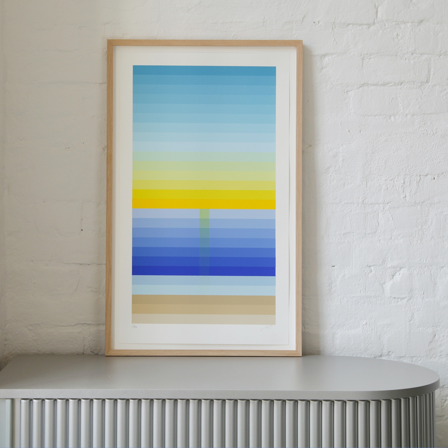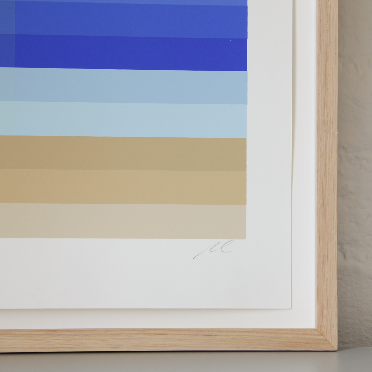 Tony Clough Eastern Sunrise, 2021/2022 Material 28 Farben-Serigrafie auf Coventry Rag 290gr Auflage 50 Maße 42 x 72,5 cm Auflage 50 auf der Vorderseite signiert und nummeriert Details zum Rahmen Handgefertigter Eichen-Holzrahmen, Außenmaße ca. 77,9 x 47,4 cm, inkl. 8mm Distanzleiste, Normalglas und rückseitiger Aufhängung. Die neue Art, Kunst zu kaufen Handverlesene, exklusive Editionen Limitierte, signierte Auflagen Top-KünstlerInnen und Rising Stars Schnell registrieren, um Preis und Verfügbarkeit zu sehen. Jetzt kostenlos Mitglied werden Bereits Mitglied? Über die Edition Tony Cloughs handwerkliche Perfektion und seine von Erfahrung und Intuition geleitete Experimentierfreude zeigen sich auch in seinen eigenen Druckwerken. Der Künstler arbeitet mit sich überlappenden Farbschichten, schafft nuancierte, sanfte Übergänge. Charakteristisch für seine Arbeitsweise ist die Edition „Eastern Sunrise“ (2021/22), in der es ihm meisterhaft gelingt, mit insgesamt 28 horizontalen Streifen einen fließenden Farbverlauf zu erzielen: In einem einzigen Druckvorgang entsteht diese genauso abstrakte wie eindeutige Abbildung eines Sonnenaufgangs – vom Strand aus gesehen über dem Meer. Wird normalerweise jede Farbe einzeln gedruckt, hat der Künstler hier bei jeder Bewegung des Papiers behutsam einen neuen Ton hinzugefügt, sodass sich der Wandel kontinuierlich und allmählich vollzieht. Die stete Veränderung bei unaufhaltsam vorrückender Zeit ist darüber genauso nachvollziehbar wie bei der Beobachtung des Naturschauspiels selbst. Cloughs Edition allerdings kann sie festhalten: die Schönheit des vergänglichen Moments. Über den Künstler Shepard Fairey, Kenny Scharf, Space Invader, Cleon Peterson und Friedrich Kunath – das sind nur einige der namhaften Künstler*innen, mit denen Tony Clough in seiner auf Serigrafien spezialisierten Druckwerkstatt „Serio Press“ in Pasadena schon zusammengearbeitet hat. Die Arbeiten sind im Wortsinn handgemacht, die Farben von Hand gemischt und jeweils einzeln gedruckt. Fairey war es auch, der Clough sein Atelier zur Verfügung stellte, bevor dieser – nach einem Grafikdesign-Studium und mehreren Jahren im renommierten Studio „Modern Multiple“ 2013 in die Selbstständigkeit gestartet – seine ersten eigenen Studioräume in Los Angeles eröffnete. Lesenswerte Artikel / Links „Serio Press“ heißt die Druckwerkstatt, die Tony Clough in Pasadena betreibt Video von der Entstehung eines Tony-Clough-Siebdrucks bei „Serio Press“ Instagram-Account von Tony Clough Video über die Entstehung einer „3 Sheets Edition“ mit Joseph P. Gerges Mehr Kunst entdecken A.R. Penck Ariadne - Minotaurus, 1992 Heinrich Heidersberger VW Bad Wolfsburg, 1961, 1961 / 2022 Salvador Dalí Chevalier surréaliste (Hommage à Velàsquez), 1980 Victor Vasarely Oslop 3, 1989