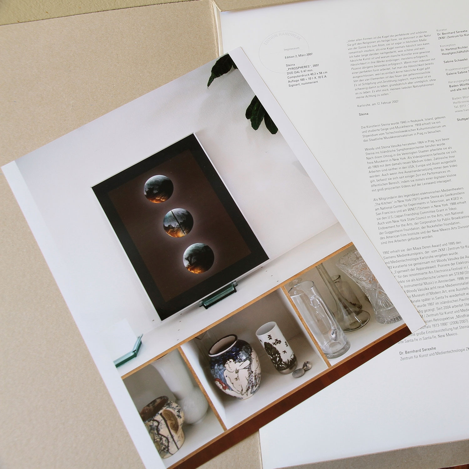 Steina Vasulka Pyrospheres, 2007 Material Pigment-Print, inkl. DVD PAL 5:47 min. Auflage 100 Maße 58,5 x 40,5 cm Auflage 100 verso signiert und nummeriert Beide Arbeiten (Print und Video-Mitschnitt auf DVD) hat Steina Vasulka 2006 bei ihrem Gastaufenthalt im ZKM in Karlsruhe geschaffen: Aufnahmen von Feuer auf einer rotierenden Kugel. Ein Mitschnitt von 5:47 min, der in Dauerschleife abgespielt werden kann, ist als DVD-Disc Teil ihrer Arbeit. Die speziell angefertigte Mappe wird mitgeliefert. Details zum Rahmen Metallrahmen Nielsen Walnuss, inkl. Passepartout dorée museo, Außenmaße 50 x 70 cm, inkl. 60% invisible UV Glas, staubdicht verschlossen. Die neue Art, Kunst zu kaufen Handverlesene, exklusive Editionen Limitierte, signierte Auflagen Top-KünstlerInnen und Rising Stars Schnell registrieren, um Preis und Verfügbarkeit zu sehen. Jetzt kostenlos Mitglied werden Bereits Mitglied? Über die Edition Es gilt als Wiege der Videokunst: der avantgardistische Kunstspace The Kitchen, ein 1971 von Steina und Woody Vasulka mitgegründetes alternatives Zentrum für Videokunst, Musik und Performance in New York – und es existiert bis heute. Eine ähnliche Kontinuität haben Steina Vasulkas Experimente mit der Kamera und elektronischen Bildern sowie ihr Interesse an Soundeffekten. Sie spielte mit Bildmanipulationen und brach mit filmischen Konventionen, lange vor Software-Erfindungen wie den Face Filter Apps. „Pyroglyphs“ (1994) und „Pyroshpere“ (2005), beides Videoarbeiten mit Sound, realisierte sie gemeinsam mit dem Schmied und Künstler Tom Joyce. Es sind spektakuläre Meditationen über das Element Feuer, aus dem sie hypnotische Landschaften entstehen lässt. Steina Vasulka ist fasziniert von der Kraft des Feuers, Materialien in gänzlich neue Formen transformieren zu können. Die Edition „Pyrospheres“ entwickelte sie in ihrer Zeit als Artist in Residence im ZKM Karlsruhe. Es ist ein Computerdruck in hoher Qualität, erschienen als signierte und nummerierte Auflage, der eine DVD PAL beiliegt. Über die Künstlerin Bevor Steina Vasulka (geb. 1940 in Reykjavík) gemeinsam mit ihrem Mann Woody Vasulka die Medienkunst revolutionierte, war sie – studiert in klassischer Violine – Mitglied im Isländischen Symphonieorchester. In ihrer Performance-Arbeit „Violine Power“ verwebte sie 1979 Audio- mit Videosignalen – und erzielte erstaunliche Effekte. Was Steina und Woody Vasulka in ihren frühen Arbeiten einte, war ihr Interesse an dem Medium Video. Beide hatten großen Anteil daran, dass sich Videokunst als eigenes künstlerisches Genre etablieren konnte, als sich Ende der 1970er Jahre das Fernsehen als Massenmedium ausbreitete. Sie experimentierten mit der elektronischen Technologie, um das Verhältnis von Bild und Ton neu zu definieren, und nutzten Verfahren der Farbmanipulation und Überblendung oder elektronische Bildbeeinflussungen durch Synthesizer mit dem Ziel, die filmische Dramaturgie und die narrativen Möglichkeiten zu erweitern. Steina Vasulka erhielt zahlreiche Preise und Stipendien, bespielte den Isländischen Pavillon auf der Venedig-Biennale (1997) und ist heute in zahlreichen namhaften Sammlungen vertreten, darunter dem MoMA in New York und dem ZKM Karlsruhe. Lesenswerte Artikel / Links Webseite der Künstlerin Webseite von The Kitchen Künstlerinnenseite auf der LIMA-Homepage Einen guten Eindruck von der Arbeit gibt es auf folgender Seite; in das Suchfeld „Steina Seven Spheres“ eingeben [Steina and Woody Vasulka Fonds](Werke von Steina und Woody Vasulka auf UbuWeb) [Video-Interview mit Steina und Woody Vasulka](https://www.youtube.com/watch?v=Ylow_1ytoiE Videoausschnitt aus "Pyroglyphs" Archiv der Vasulkas Mehr Kunst entdecken Gabriel Orozco Boulder Whale, 2012 Imi Knoebel o.T. (2), 1995 Imi Knoebel o.T. (3), 1995 Wolfgang Tillmans It´s Only Love – Give It Away, 2018