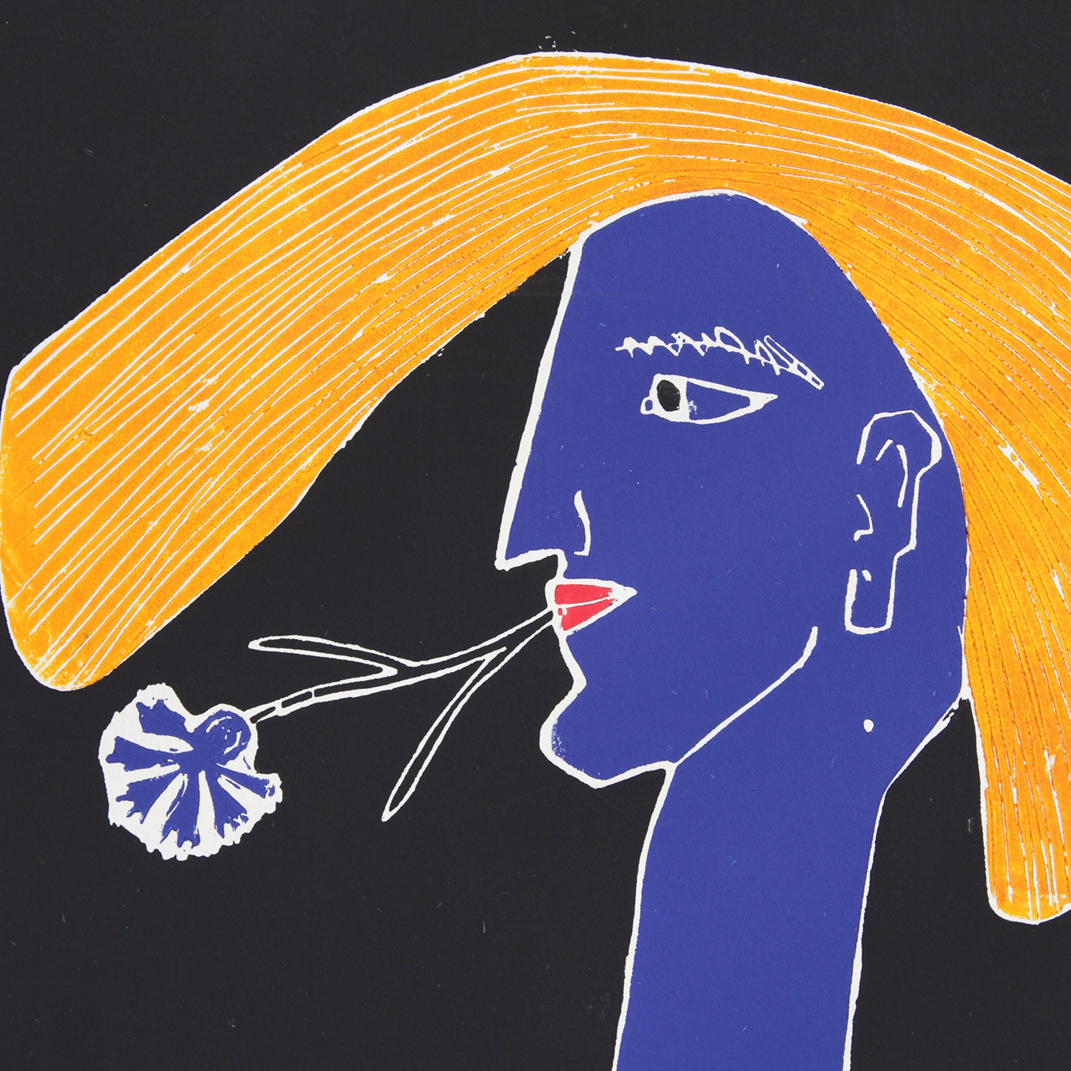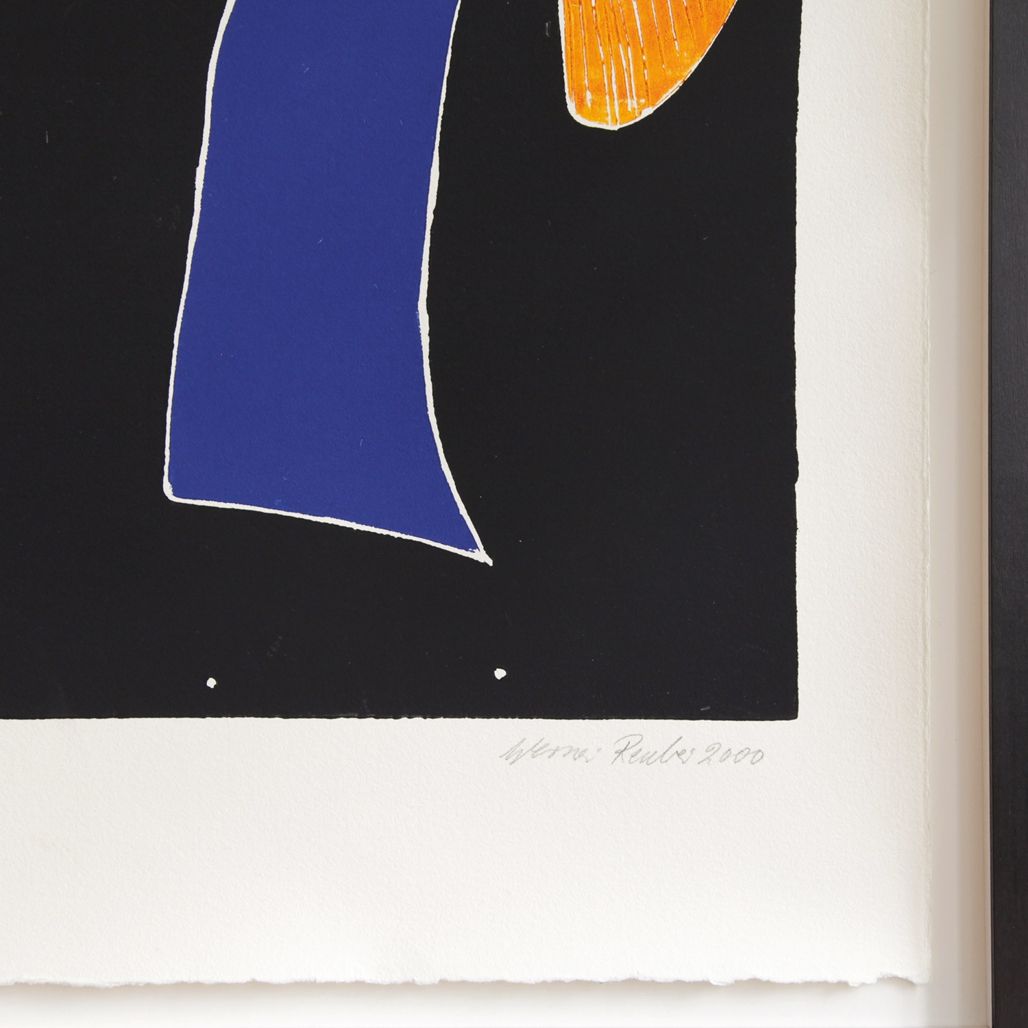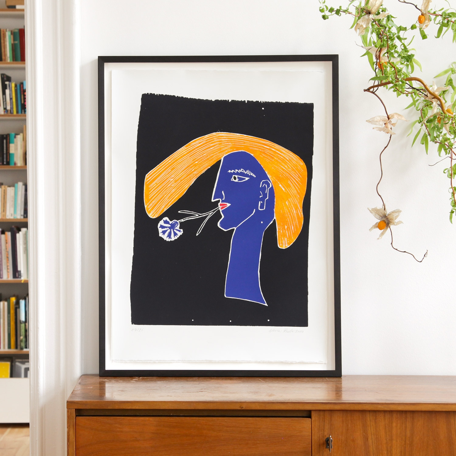 Werner Reuber Frau mit Kornblume, 2000 Material Farbholzschnitt auf Zerkall Bütten Auflage 25 Maße ca. 67 x 50 cm Auflage 25 + 5 AP Handsigniert Details zum Rahmen Handgefertigter schwarz gebeizter und gewachster Ahorn-Holzrahmen, mit 10mm Distanzleiste, Außenmaße des Rahmens ca. 73,8 x 56,2 cm. Inkl. Normalglas und rückseitiger Aufhängung, luftdicht verschlossen. Die neue Art, Kunst zu kaufen Handverlesene, exklusive Editionen Limitierte, signierte Auflagen Top-KünstlerInnen und Rising Stars Schnell registrieren, um Preis und Verfügbarkeit zu sehen. Jetzt kostenlos Mitglied werden Bereits Mitglied? Anfrage senden Über die Edition Geschlechterfragen stehen im Mittelpunkt seines Werks, insofern passt Werner Reuber perfekt in unsere Zeit. Bei seinem wunderbar kontrastreichen Holzschnitt – weiße Konturlinien auf schwarzem Grund plus kräftige Farben – verrät bereits der Titel, was wir sehen: eine „Frau mit Kornblume“ und einen „Mann mit Mohnblume“. Ähnliche, heroisch anmutende Profile finden sich immer wieder in Reubers Arbeiten, in denen sich der Künstler von der Gegenwart genauso inspirieren lässt wie von jahrtausendealten Mythen. Ein Ausdruck von Stärke liegt in beiden Porträts, die sich auch jeweils einzeln behaupten. Eines verbindet sie jedoch mit Sicherheit: die Blütezeit von Korn- und Mohnblume. Die Blumen im Mund spiegeln sowohl Liebe und Lust als auch Sehnsucht und Vergänglichkeit. Über den Künstler Er war Meisterschüler bei Gerhard Richter und 1976 Gründungsmitglied der ersten Düsseldorfer Produzentengalerie: Werner Reuber (geb. 1947). Der Künstler ist neben der Malerei, Druckgrafik (Holzschnitt) und Zeichnung auch in den Feldern der Keramik und Fotografie sowie des Films tätig. Seit 1982 ist Reuber Teil der Künstler*innengruppe „Die Langheimer“. Ironie und Komik zeichnen sein eigenes Werk und das der „Langheimer“ aus. Auf diese Weise nähert er sich immer wieder neu dem komplexen Beziehungsgeflecht zwischen Mann und Frau. Reuber, der in Düsseldorf lebt und arbeitet, ist in zahlreichen nationalen und internationalen Ausstellungen vertreten. Ausstellungen (Auswahl) Druckgrafische Werke von Werner Reuber waren jüngst im Kultur Bahnhof Eller in Düsseldorf zu sehen. Die Städtische Galerie im Schloss Strünkede in Herne zeigte 2020 die Solo-Schau „Werner Reuber – Alles so wie gestern“. „Eberhard Bitter – Gedanken im Dialog mit Werner Reuber“ lautete der Titel einer im selben Jahr stattfindenden Doppelausstellung im Herforder Kunstverein. Lesenswerte Artikel / Links Webseite von Werner Reuber JInstagram-Account von Werner Reuber Homepage der Künstler*innengruppe „Die Langheimer“ Mehr Kunst entdecken Maximilian Kirmse Kiss, 2021 Georg Karl Pfahler Ohne Titel (WVZ blaue Variante), 1975 Werner Reuber Mann mit Mohnblume, 2000
